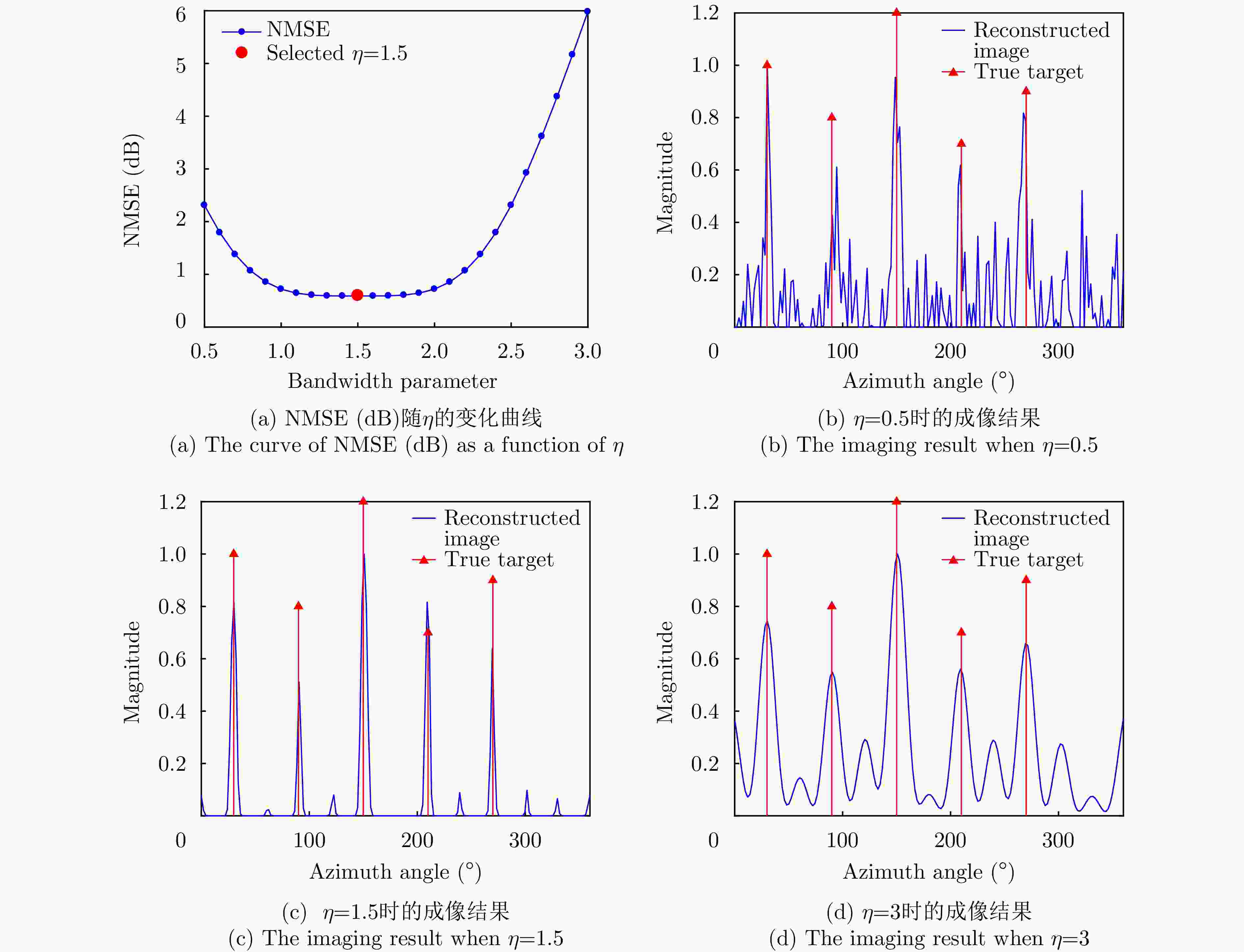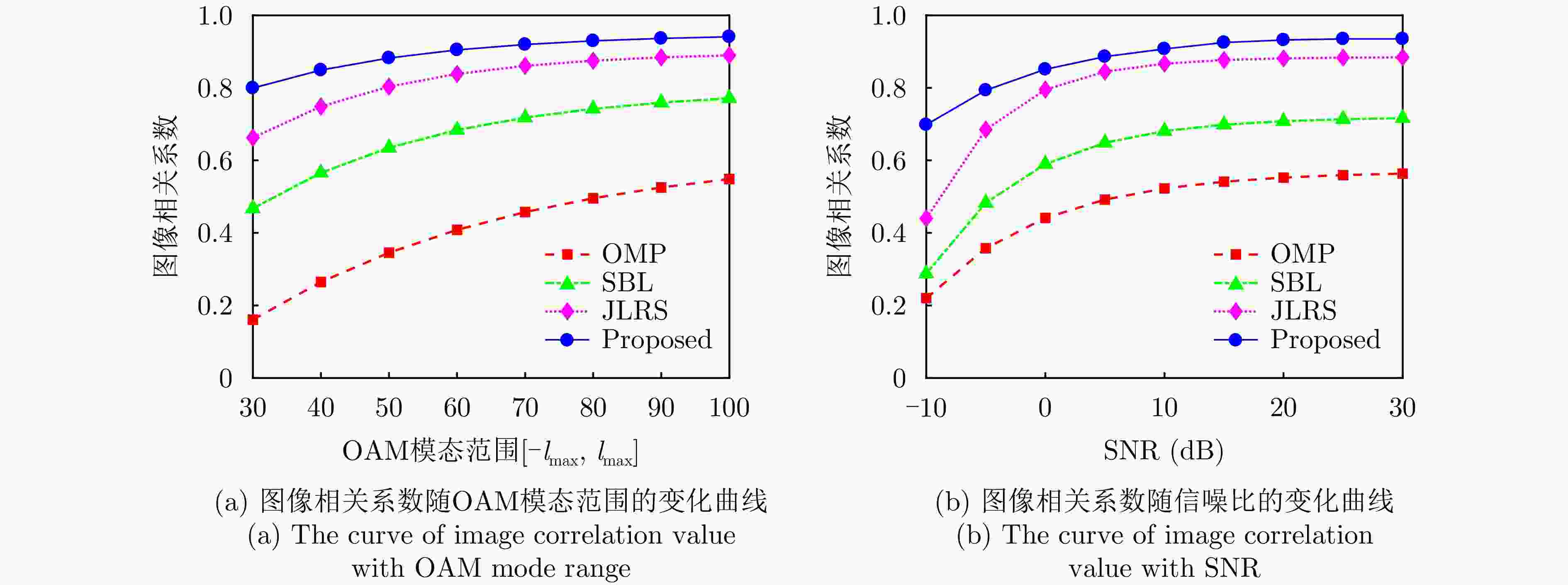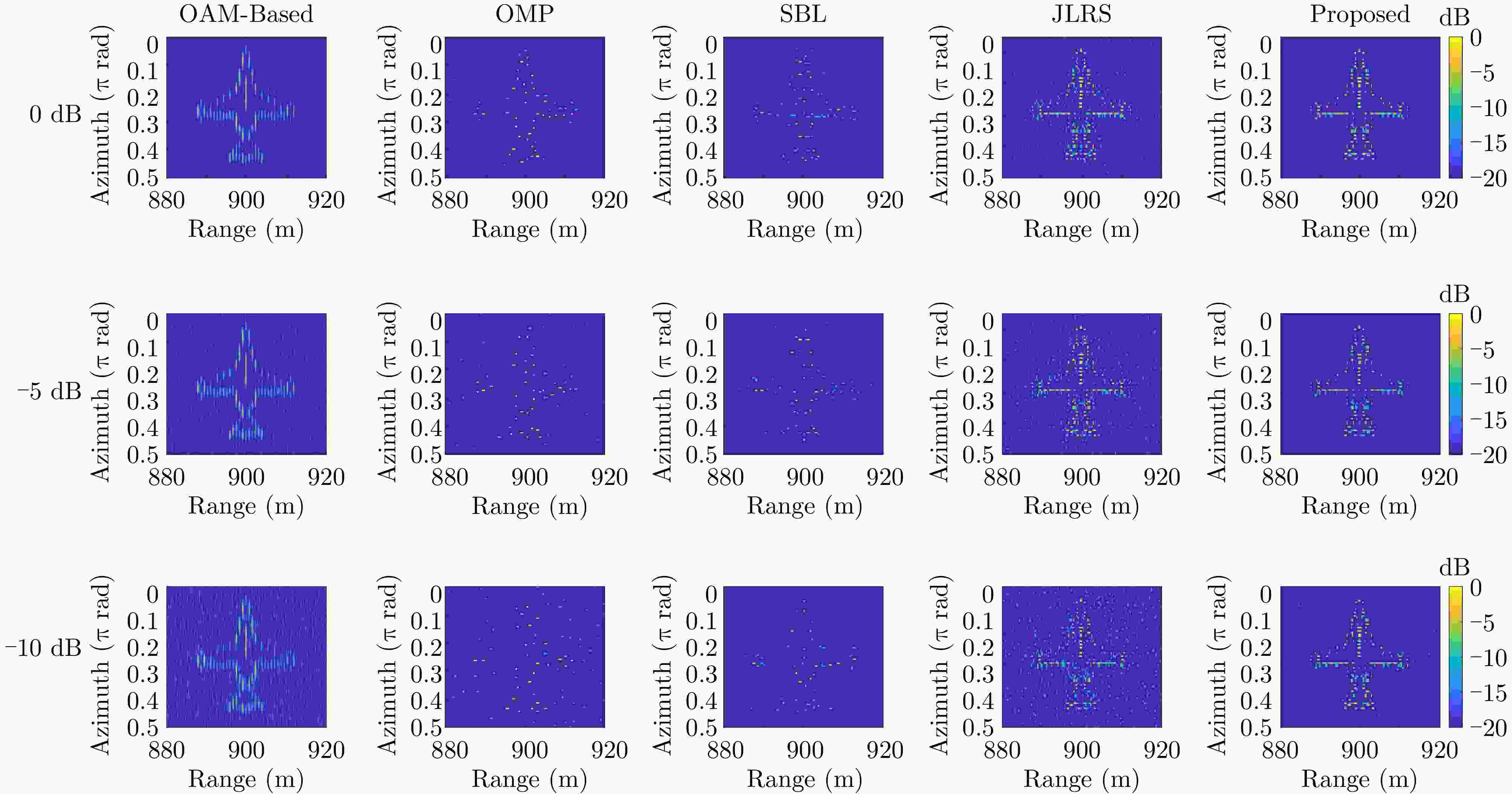 摘要: 涡旋电磁波雷达(VEWR)利用轨道角动量(OAM)模态的正交性,理论上为突破传统雷达的方位向分辨率限制提供了新的物理维度,从而也为目标微动感知与前视成像开辟了新途径。然而,实际应用中有限可用模态与复杂电磁噪声导致严重的模态混叠和分辨率退化,现有稀疏成像方法普遍存在精度-效率失衡、噪声鲁棒性不足等问题。该文提出一种融合模态相关性加权与自适应正则化(MCW-AR)的超分辨成像框架。首先构建VEWR前视成像几何与波前调制信号模型;进而设计OAM模态相关矩阵量化模态间辐射能量的非均匀分布特性,通过贝塞尔函数幅值加权调制强化主导模态的低秩约束;最终建立联合稀疏性与低秩性的复合优化模型,引入自适应权重机制动态平衡结构保持与噪声抑制,并设计基于交替方向乘子法(ADMM)与增广拉格朗日(ALM)的联合优化框架,其中核心图像更新子问题采用动量加速的二维共轭梯度最小二乘(2D-CGLS)法高效求解。数值仿真与电磁仿真实验表明:该方法在有限模态和强噪声下仍能保持目标结构完整性,计算效率与成像质量得到显著提升。Abstract: Vortex electromagnetic wave radar (VEWR) leverages the orthogonality of orbital angular momentum (OAM) modes, introducing a new physical dimension that theoretically overcomes the azimuth resolution limitations of conventional radar systems and enables enhanced micro-motion perception and forward-looking imaging. However, in practical engineering applications, the limited number of available OAM modes and the presence of complex electromagnetic noise often cause severe mode aliasing and resolution degradation. Existing sparse imaging methods face inherent trade-offs between accuracy and computational efficiency and exhibit limited robustness to noise. To address these issues, this paper proposes a super-resolution imaging framework that integrates mode correlation weighting and adaptive regularization. First, a forward-looking imaging geometry and a wavefront-modulated signal model for VEWR are established. Subsequently, an OAM mode correlation matrix is designed to characterize the nonuniform distribution of radiation energy among modes, where Bessel-function-modulated weights reinforce the low-rank constraints of dominant radiation components. Finally, a compound optimization model combining sparsity and low-rankness priors is developed, incorporating an adaptive weighting mechanism that dynamically balances structural preservation and noise suppression. A joint optimization framework based on the alternating direction method of multipliers and augmented Lagrange multiplier algorithms is constructed, in which the core image-updating subproblem is efficiently solved using a momentum-accelerated two-dimensional conjugate gradient least-squares method. Numerical simulations and electromagnetic experiments verify that the proposed method preserves target structural integrity under limited modes and strong noise, while effectively improving both imaging quality and computational efficiency.