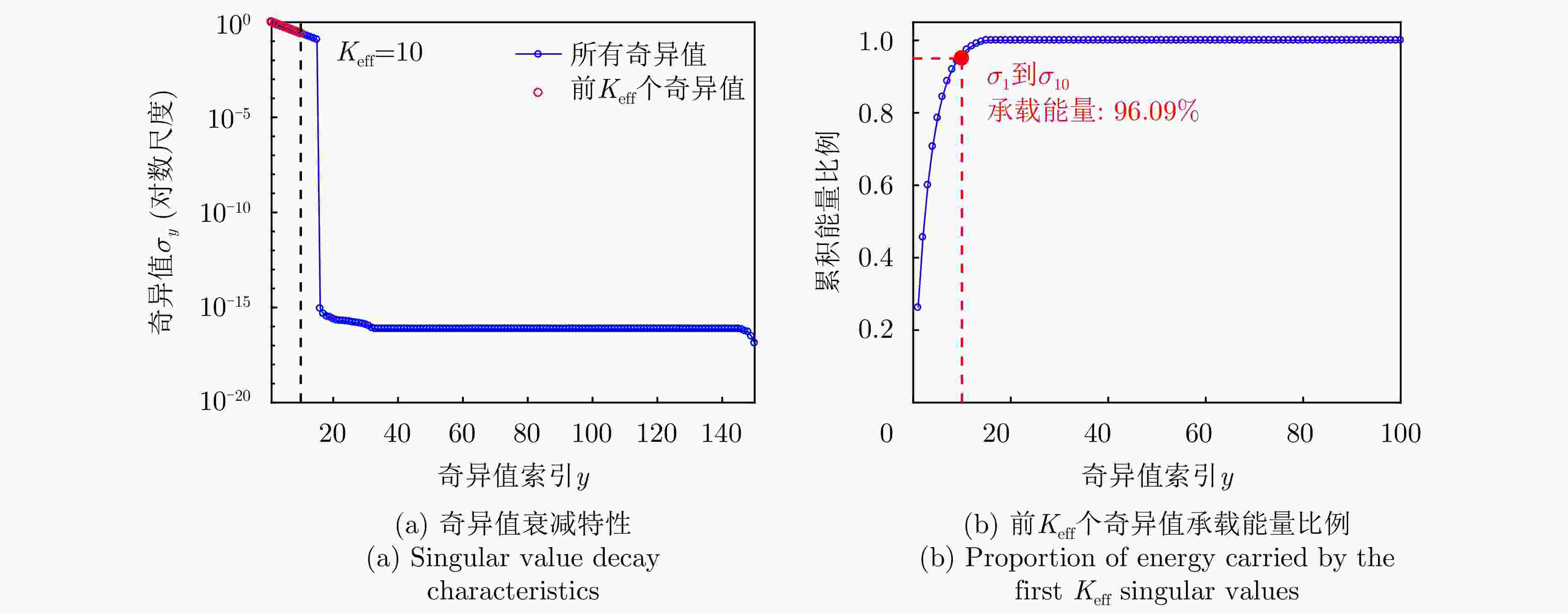 输入:观测矩阵$ {\boldsymbol{S}} $,字典$ {\boldsymbol{\Phi}} $,模态相关矩阵$ {\boldsymbol{C}} $,最大迭代次数$ {K_{{\max}}} $,容差$ \varepsilon $,参数$ \lambda _1 $, $ \lambda _2 $, $ \mu_1^0 $, $ \mu_2^0$, $ \mu_3^0 $, $ \rho $, $ \eta $ 初始化: 计算$ {\boldsymbol{G}} = {{\boldsymbol{\Phi}} ^{{\mathrm{H}}}}{\boldsymbol{S}} $ 对G进行SVD:$ {\boldsymbol{G}} = {{\boldsymbol{U}}_G}{{\boldsymbol{\Sigma}} _G}{\boldsymbol{V}}_G^{{\mathrm{H}}} $, $ {{\boldsymbol{\varSigma}} _G} = {\mathrm{diag}}({\sigma _{G,1}},{\sigma _{G,2}}, \cdots ,{\sigma _{G,{r_G}}}) $, $ {\sigma _{G,1}} \ge {\sigma _{G,2}} \ge \cdots \ge 0 $, $ {r_G} = \min ({N_{{\mathrm{r}}}},{N_{{\mathrm{a}}}}) $ 估计有效秩$ {K_{{{\mathrm{eff}}}}} $:$ {K_{{{\mathrm{eff}}}}} = \min \left\{ {q \in {\mathbb{Z}^ + }\left| {\displaystyle\sum\limits_{y = 1}^q {\sigma _y^2({\boldsymbol{X}}) \ge 0.95\displaystyle\sum\limits_{z = 1}^r {\sigma _z^2({\boldsymbol{X}})} } } \right.} \right\} $ 初始化$ {{\boldsymbol{X}}^0} $:$ {{\boldsymbol{X}}^0} = {{\boldsymbol{U}}_{G(:,1:{K_{{{\mathrm{eff}}}}})}}{{\boldsymbol{\varSigma}} _{G(1:{K_{{{\mathrm{eff}}}}},1:{K_{{{\mathrm{eff}}}}})}}{\boldsymbol{V}}_{G(:,1:{K_{{{\mathrm{eff}}}}})}^{{\mathrm{H}}} $,$ {{\boldsymbol{U}}_{G(:,1:{K_{{{\mathrm{eff}}}}})}} $表示$ {{\boldsymbol{U}}_G} $矩阵的前$ {K_{{{\mathrm{eff}}}}} $列,$ {{\boldsymbol{\varSigma}} _{G(1:{K_{{{\mathrm{eff}}}}},1:{K_{{{\mathrm{eff}}}}})}} $表示$ {{\boldsymbol{\varSigma}} _G} $左上角的