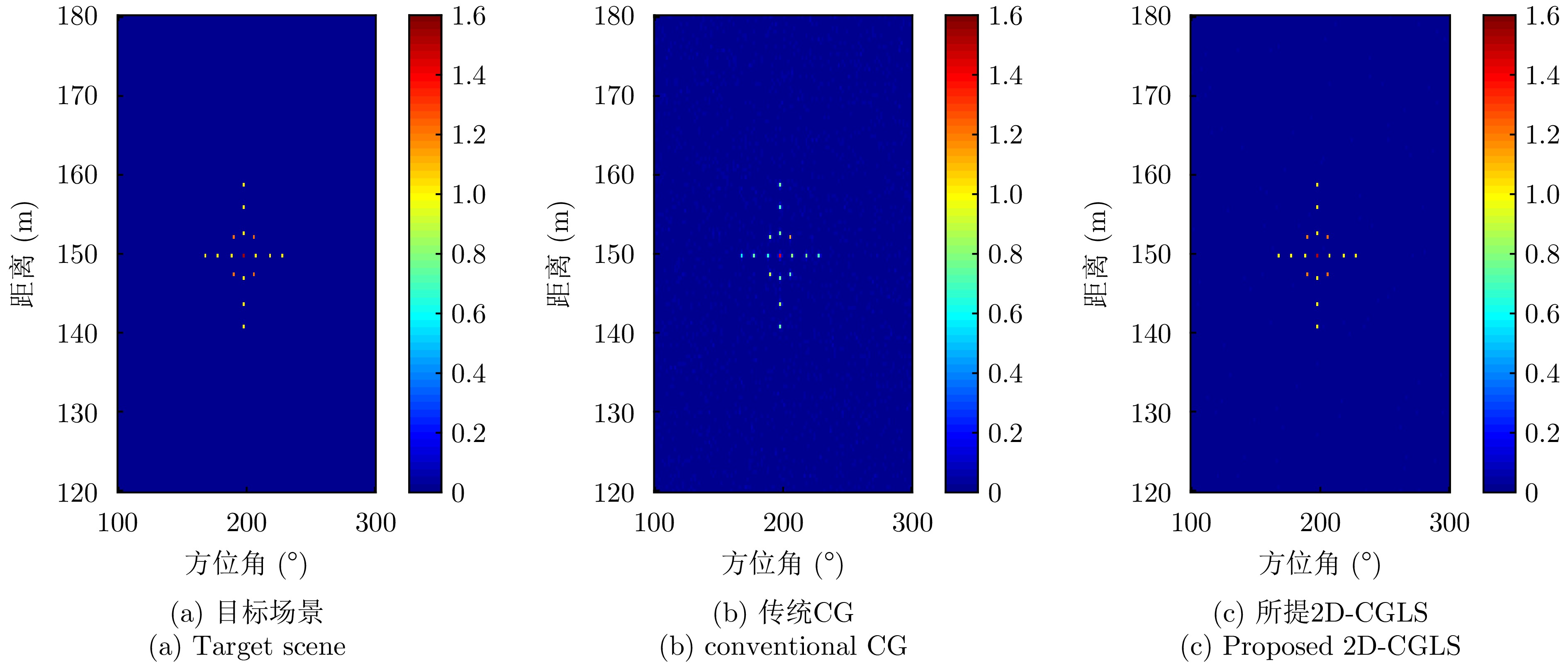 $ {K_{{{\mathrm{eff}}}}} \times {K_{{{\mathrm{eff}}}}} $子矩阵,$ {{\boldsymbol{V}}_{G(:,1:{K_{{{\mathrm{eff}}}}})}} $表示$ {{\boldsymbol{V}}_G} $矩阵的前$ {K_{{{\mathrm{eff}}}}} $列$ {{\boldsymbol{Z}}^0} = {{\boldsymbol{C}}^{ - 1/2}}{{\boldsymbol{X}}^0} $, $ {{\boldsymbol{J}}^0} = {{\boldsymbol{X}}^0} $, $ {\boldsymbol{E}}^0 = 0 $, $ {\boldsymbol{Q}}^0_1 = 0 $, $ {\boldsymbol{Q}}_2^0 = 0 $, ${\boldsymbol{Q}}_3^0 = 0 $, $ k = 0 $ 迭代:While $ k \lt {K_{{\max}}} $ and $ \Vert {{\boldsymbol{X}}}^{k}-{{\boldsymbol{X}}}^{k-1}{\Vert }_{\text{F}}/\Vert {{\boldsymbol{X}}}^{k-1}{\Vert }_{\text{F}} \gt \varepsilon $ do: 1. 更新自适应权重: 计算$ {{\boldsymbol{U}}^k} = {{\boldsymbol{C}}^{ - 1/2}}{{\boldsymbol{X}}^k} + {\boldsymbol{Q}}_2^k/\mu _2^k $ 对$ {{\boldsymbol{U}}^k} $进行SVD:$ {{\boldsymbol{U}}^k} = {\boldsymbol{U\varSigma}} {{\boldsymbol{V}}^{\mathrm{H}}} $,计算奇异值权重$ {{w_y} = {\sigma _y}({{\boldsymbol{U}}^k})/\sum\limits_{z = 1}^{{\mathrm{rank}}({{\boldsymbol{U}}^k})} {{\sigma _z}} ({{\boldsymbol{U}}^k})}\;\;{y = 1, \cdots ,{\mathrm{rank}}({{\boldsymbol{U}}^k})} $ 更新稀疏性参数:更新稀疏阈值$ \lambda _1^k = \lambda _1^0 \cdot \frac{{{{\left\| {{{\boldsymbol{J}}^k}} \right\|}_0}}}{{{N_{{\mathrm{r}}}}{N_{{\mathrm{a}}}}}} $ 2. 更新$ {\boldsymbol{Z}}^{k+1} $: $ {{\boldsymbol{Z}}^{k + 1}} = \mathcal{U} \cdot {\mathcal{D}_\alpha }({\boldsymbol{\varSigma}} ) \cdot {\mathcal{V}^{\mathrm{H}}} $,其中$ {\mathcal{D}_\alpha }({\boldsymbol{\varSigma}} ) = {\mathrm{diag}}\left( {\max\left( {{\sigma _y} - {\alpha _y},0} \right)} \right) $ 3. 更新$ {\boldsymbol{J}}^{k+1} $: $ {\boldsymbol{V}}^k={\boldsymbol{X}}^k+Q_3^k/\mu_3^k,\;\;{\boldsymbol{J}}^{k+1}={\mathrm{sign}}({\boldsymbol{V}}^k) \odot\max\left(|{\boldsymbol{V}}^k|-\dfrac{ \lambda_1^k}{\mu_3},0 \right) $ 4. 更新$ {\boldsymbol{X}}^{k+1} $: 构造线性算子$ \mathcal{H}({\boldsymbol{X}}) = \mu _1^k{\boldsymbol{\Phi}} _{{\mathrm{r}}}^{{\mathrm{H}}}({{\boldsymbol{\Phi}} _{{\mathrm{r}}}}{\boldsymbol{X\Phi}} _{{\mathrm{a}}}^{{\mathrm{H}}}){{\boldsymbol{\Phi}} _{{\mathrm{a}}}} + \mu _2^k{{\boldsymbol{C}}^{ - 1}}{\boldsymbol{X}} + \mu _3^k{\boldsymbol{X}} $及右端项$ {{\boldsymbol{B}}^k} $以$ {{\boldsymbol{X}}^k} $为初值,应用2D-CGLS算法求解$ \mathcal{H}({\boldsymbol{X}}) = {{\boldsymbol{B}}^k} $ 5. 更新${\boldsymbol{E}}^{k + 1} $: $ {\boldsymbol{W}}^k={\boldsymbol{S}}-{\boldsymbol{\Phi}}{\boldsymbol{X}}^{k+1}+{\boldsymbol{Q}}_1^k/\mu_1^k $,$ {\boldsymbol{E}}^{k + 1} = \dfrac{\mu_1}{ \lambda_2+\mu_1}{\boldsymbol{W}}^k $ 6. 更新乘子: $ {\boldsymbol{Q}}_1^{k + 1} = {\boldsymbol{Q}}_1^k + {\mu _1}({\boldsymbol{S}} - {\boldsymbol{\Phi }}{{\boldsymbol{X}}^{k + 1}} - {{\boldsymbol{E}}^{k + 1}}) $, $ {\boldsymbol{Q}}_2^{k + 1} = {\boldsymbol{Q}}_2^k + {\mu _2}({{\boldsymbol{C}}^{ - 1/2}}{{\boldsymbol{X}}^{k + 1}} - {{\boldsymbol{Z}}^{k + 1}}) $, $ {\boldsymbol{Q}}_3^{k + 1} = {\boldsymbol{Q}}_3^k + {\mu _3}({{\boldsymbol{X}}^{k + 1}} - {{\boldsymbol{J}}^{k + 1}}) $ 7. 更新惩罚系数:$ \mu_w^{k+1}=\rho\mu_w^k $ for $ w = 1,2,3 $ 8. $ k = k + 1 $ End While 输出:超分辨图像$ {\boldsymbol{X}} $ 表 1 VEWR仿真参数