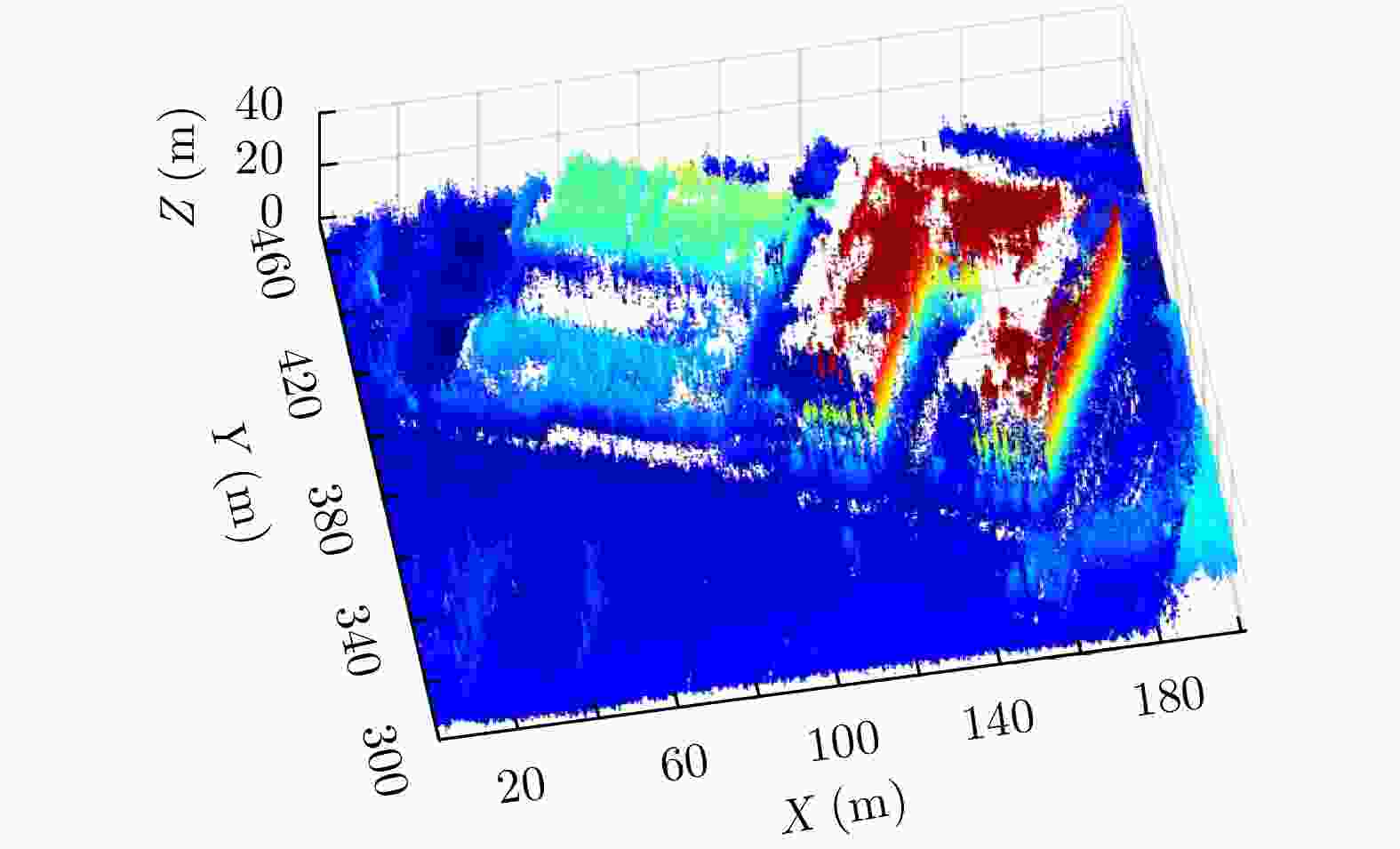 • 摘要: 层析合成孔径雷达(TomoSAR)是城市建筑物三维重建的重要技术。现有方法虽通过引入几何约束提升了成像质量,并在多极化条件下发展为极化层析SAR (PolTomoSAR),但仍面临复杂建筑结构下几何信息依赖性强、极化模型不完善等问题。为此,该文提出一种几何与极化联合约束的TomoSAR三维成像方法,融合建筑几何结构与Pauli极化相似度信息,结合极化相干最优处理及概率密度约束,显著提升点云成像质量。实验基于机载Ku波段4通道阵列苏州实测数据,结果表明所提方法在成像精度与完整性方面均优于现有方法,验证了其有效性与优越性。
