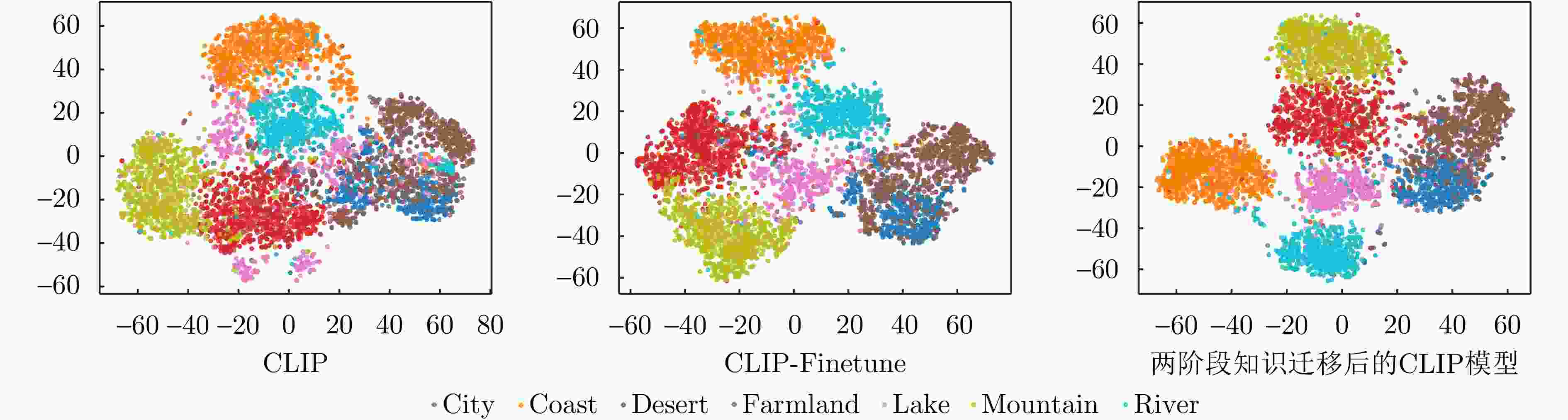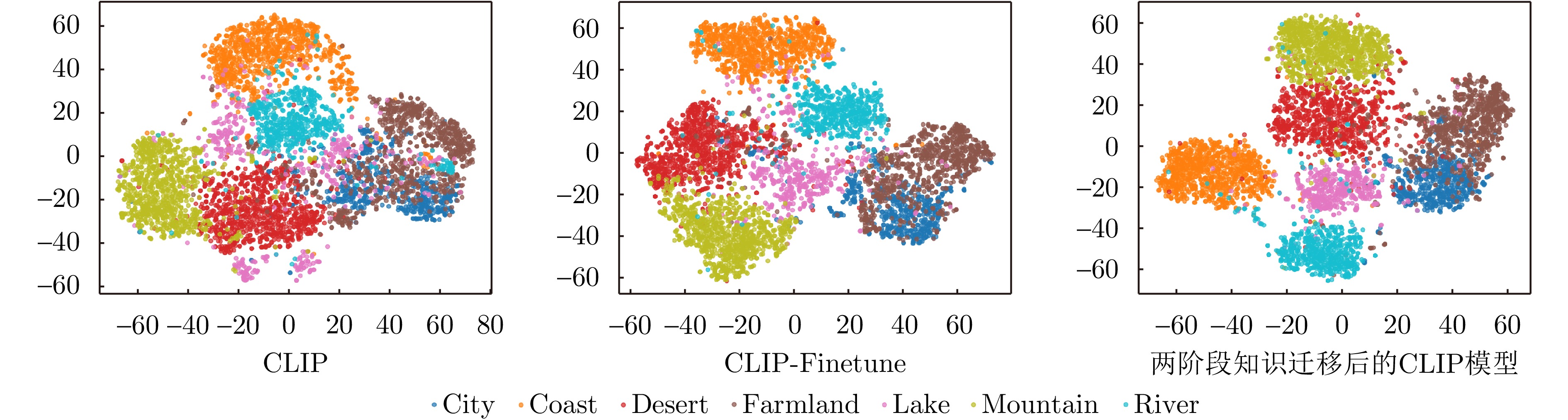 模型 MRSSC SARBuD1.0 mAP mAP@5 mAP@10 mAP mAP@5 mAP@10 CLIP 40.22% 56.33% 53.00% 40.33% 29.33% 29.53% CLIP-Finetune 61.41% 66.19% 67.89% 75.84% 77.50% 78.15% RemoteCLIP 56.69% 70.29% 65.22% 74.78% 76.25% 78.51% GeoRSCLIP 64.57% 67.48% 65.18% 75.49% 77.50% 74.00% 两阶段知识迁移后的CLIP模型 67.88% 93.71% 86.75% 81.39% 94.00% 89.38% 注:表内加粗数值表示最优结果。 表 5 SAR目标识别实验结果