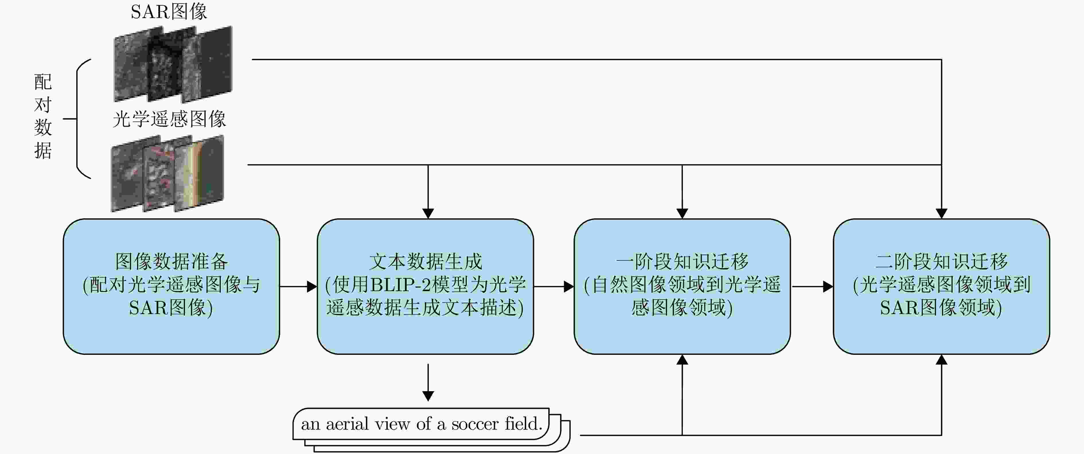 摘要: 基于海量图文数据预训练的大规模视觉语言模型(VLM)在自然图像领域表现出色,但将其迁移至合成孔径雷达(SAR)图像领域面临两大挑战:一是SAR图像高质量文本标注成本高昂,限制了SAR图文配对数据集的构建;二是SAR图像与光学自然图像在视觉特性上存在显著差异,增加了跨域知识迁移难度。针对上述问题,该文提出一种面向SAR图像的视觉语言大模型知识迁移方法。首先,利用配对的SAR与光学遥感图像,借助生成式视觉语言大模型为光学遥感图像自动生成文本描述,从而以较低成本间接构建了SAR图文配对数据集。其次,设计了两阶段迁移策略,将自然图像领域向SAR图像领域的大跨度迁移进行拆解,降低单次迁移难度。最后,在SAR图像零样本场景分类、检索以及目标识别任务上进行实验验证,实验结果表明所提方法能够有效实现视觉语言大模型向SAR图像领域的知识迁移。