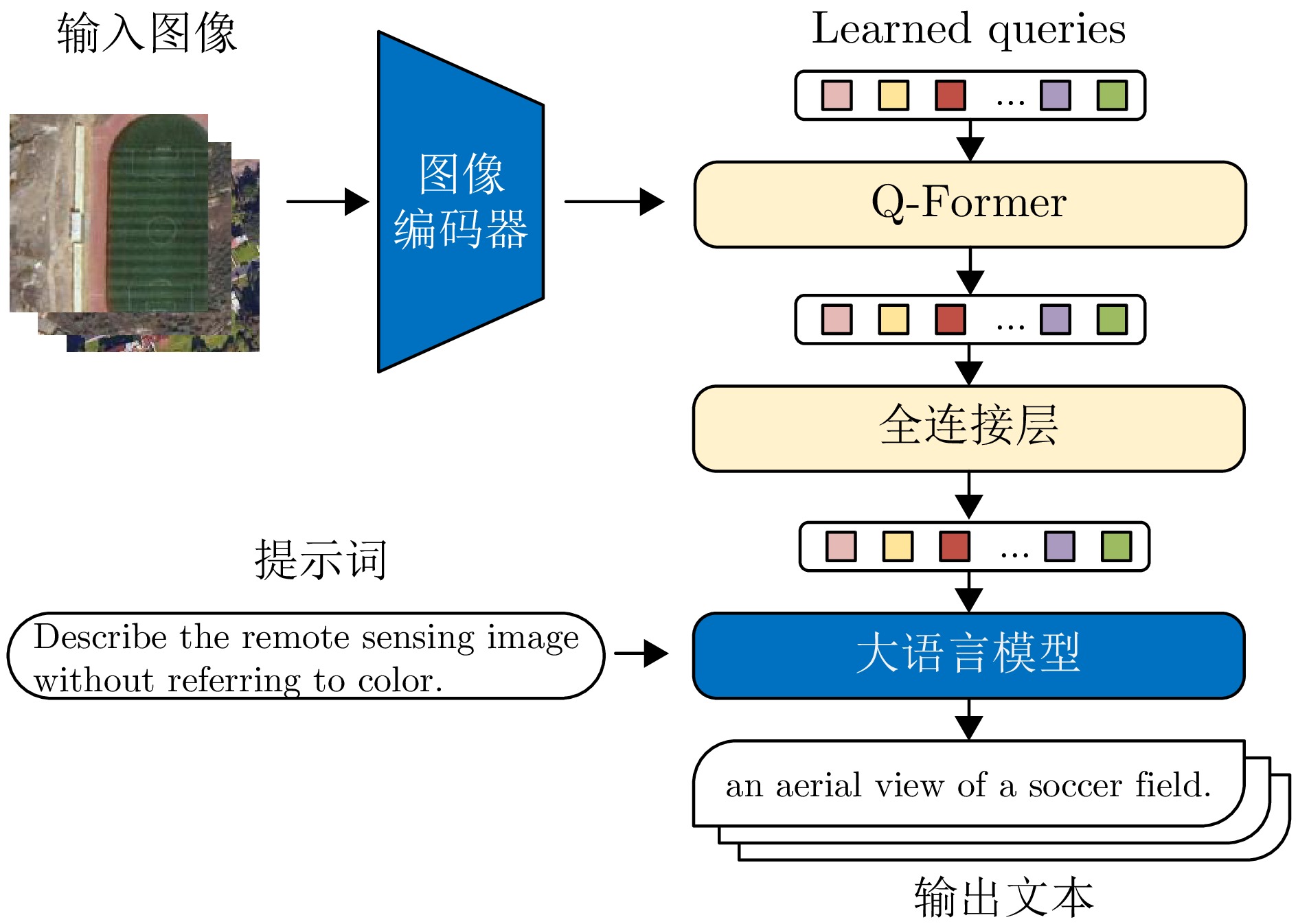 Abstract: A large-scale vision–language model (VLM) pre-trained on massive image–text datasets performs well when processing natural images. However, there are two major challenges in applying it to synthetic aperture radar (SAR) images: (1) the high cost of high-quality text annotation limits the construction of SAR image–text paired datasets, and (2) the considerable differences in visual characteristics between SAR images and optical natural images increase the difficulty of cross-domain knowledge transfer. To address these problems, this study developed a knowledge transfer method for VLM tailored to SAR images. First, this study leveraged paired SAR and optical remote sensing images and employed a generative VLM to automatically produce textual descriptions of the optical images, thereby indirectly constructing a low-cost SAR–text paired dataset. Second, a two-stage transfer strategy was designed to address the large domain discrepancy between natural and SAR images, reducing the difficulty of each transfer stage. Finally, experimental validation was conducted through the zero-shot scene classification, image retrieval, and object recognition of SAR images. The results demonstrated that the proposed method enables effective knowledge transfer from a large-scale VLM to the SAR image domain. -