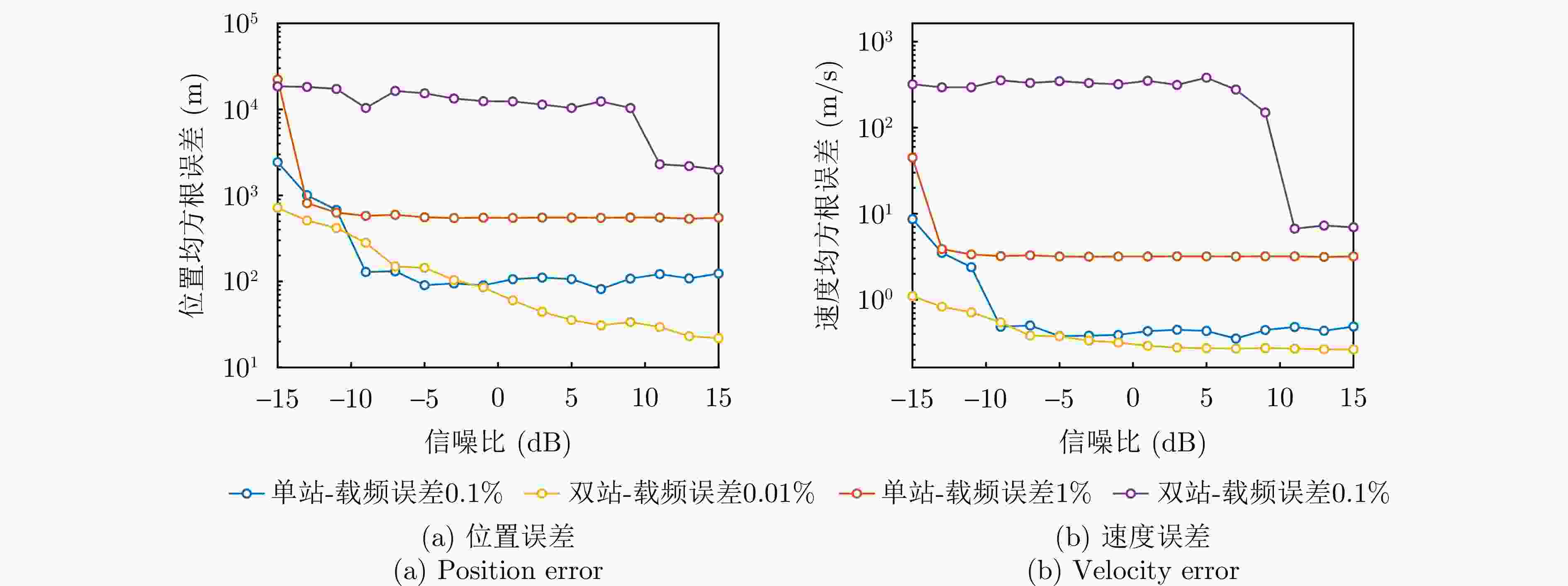 • 摘要: 在对运动辐射源定位方面,传统无源定位方法如波达方向(DOA)定位常常依赖较长时间的观测滤波,定位效率低下。而现有基于合成孔径的定位方法大多针对静止辐射源,难以实现对运动辐射源的高精度定位。针对此问题,该文分别针对单/双站定位体制提出了基于合成孔径的运动辐射源快速定位与速度估计方法。该方法通过建立辐射源瞬时斜距模型,解析定位参数(位置、速度)与成像参数的映射关系:单站定位场景下,将传统2阶斜距模型扩展至3阶,通过引入3次调频率补充自由度,实现位置与速度的同步估计;双站定位场景下,利用额外观测站新增两个成像参数,提升定位的快速性与准确性。针对定位方程存在的多解问题,该文分别提出单 / 双站真实解判定准则,并给出双站定位满足唯一性求解的初始化策略。该文进一步分析了不同因素对单站和双站定位精度的影响,并对所提单/双站无源定位模型进行了性能对比,仿真实验验证了所提算法的有效性。