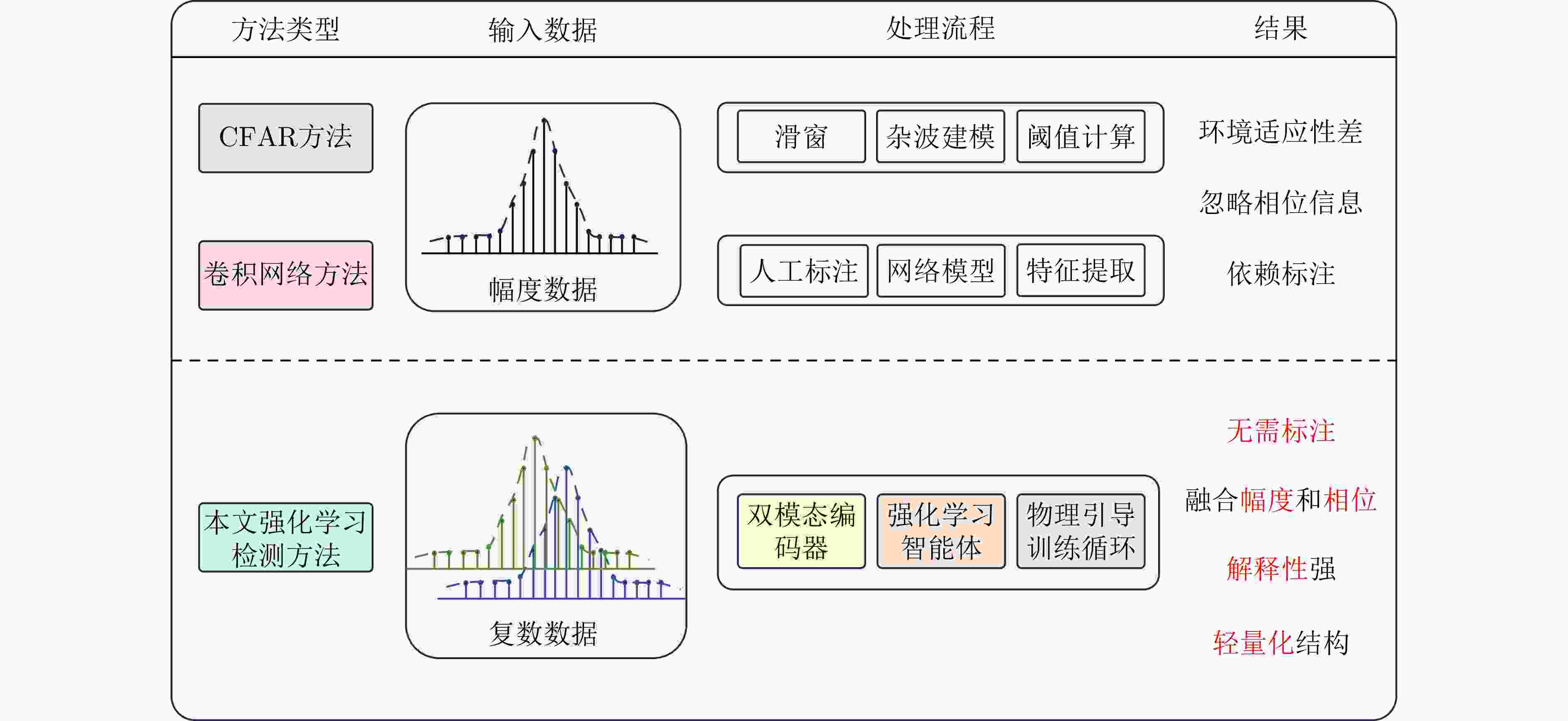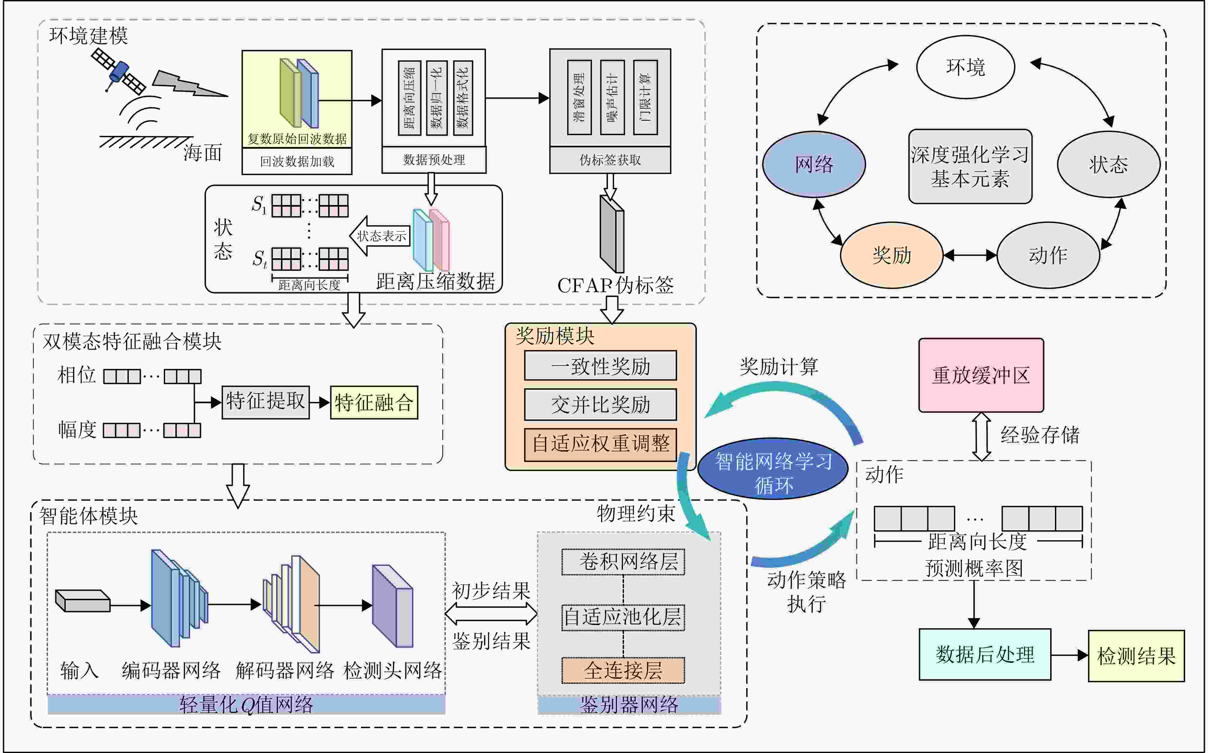 摘要: 合成孔径雷达(SAR)具备全天时全天候的海上监视能力。在距离压缩域(RCD)直接进行舰船目标检测,可规避计算密集的成像步骤(如距离徙动校正与方位压缩),从而显著提升处理效率,适用于近实时或实时处理场景。然而,现有检测方法存在固有局限:一方面,传统恒虚警率(CFAR)检测器依赖于固定统计模型,在复杂海杂波环境下表现不佳;另一方面,深度学习方法普遍存在依赖已标注数据、解释性弱以及相位信息利用不充分等问题。为此,该文提出了一种基于自监督强化学习的SAR距离压缩域舰船目标检测框架,有效融合雷达电磁散射模型与深度强化学习优势,在提升检测性能的同时增强模型的解释性与泛化能力。该框架具有以下特点:(1)引入统计模型约束的奖励信号生成机制,实现了无需人工标注的自监督学习;(2)设计双模态特征融合模块,能够联合表征幅度与相位信息,有效保留舰船的多普勒特征;(3)提出轻量化的智能体模块,集成轻量化Q网络、自适应特征增强模块和鉴别器网络,在降低计算复杂度的同时满足实时处理需求,并借助对抗性训练增强模型的鲁棒性。实验结果表明,所提方法在近20k×20k像素的大场景SAR距离压缩域数据上的平均推理时间仅为31.75 s,计算量仅为二维卷积神经网络的23.81%。在复数RCD数据集上,该方法的F1分数与召回率分别达到50.72%和54.28%,相较于主流自监督检测方法提升了8.76%和10.45%。该研究首次将强化学习引入SAR距离压缩域舰船检测,通过信号模型与数据驱动学习的结合,为实现稳健的海上监视提供了新思路。