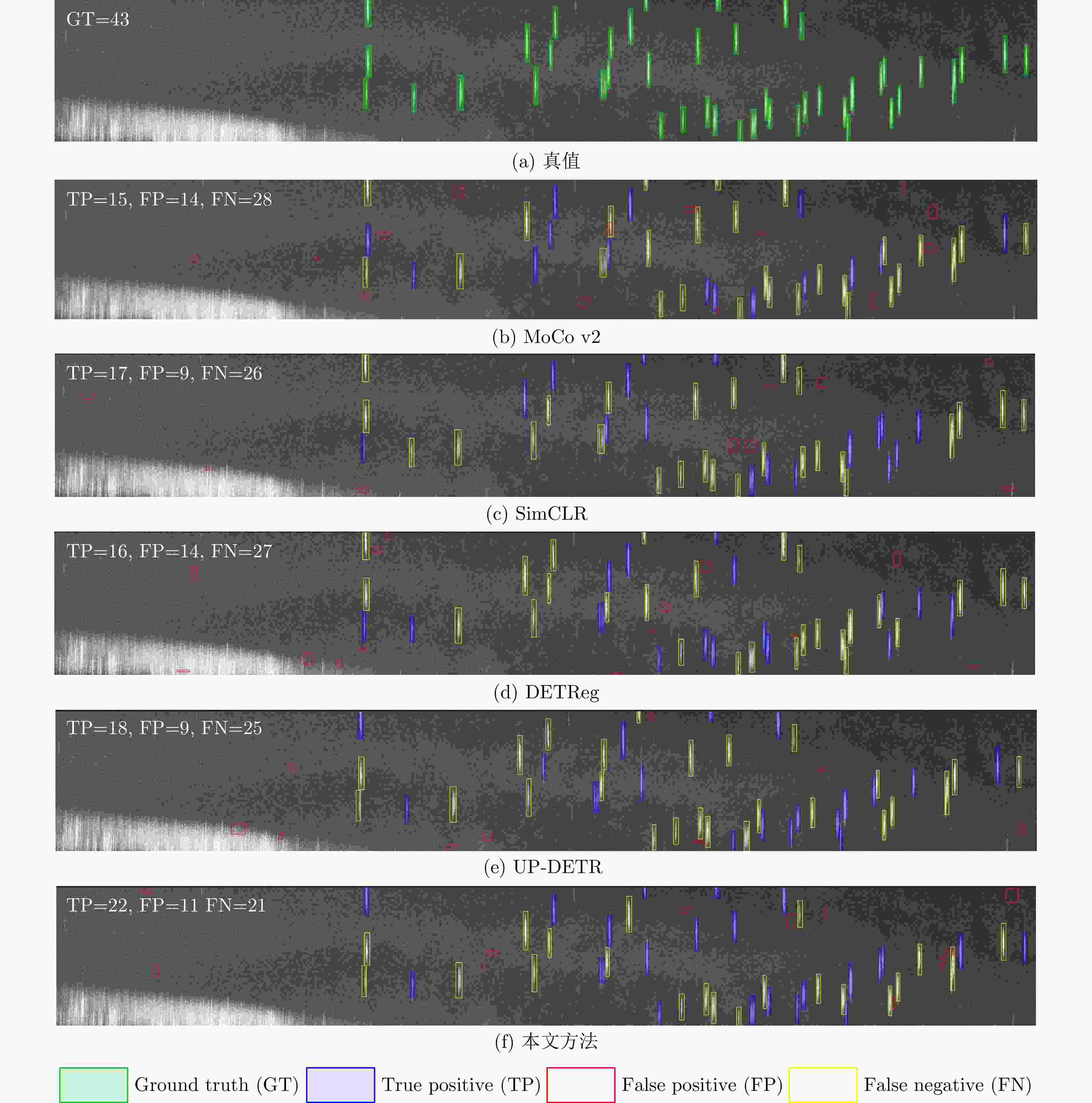 网络各模块组件 参数量(M) 性能指标(%) 深度强化学习 统计模型约束奖励 双模态融合 鉴别器网络 P R F1 AP@50 – – – – 0.0 31.21 28.72 29.91 33.18 √ – – – 3.01 39.89 42.63 41.21 46.23 √ √ – – 3.01 43.73 48.38 45.93 50.82 √ √ √ – 3.35 46.28 51.73 48.85 53.91 √ √ √ √ 4.49 47.60 54.28 50.72 56.13 表 5 自监督方法比较