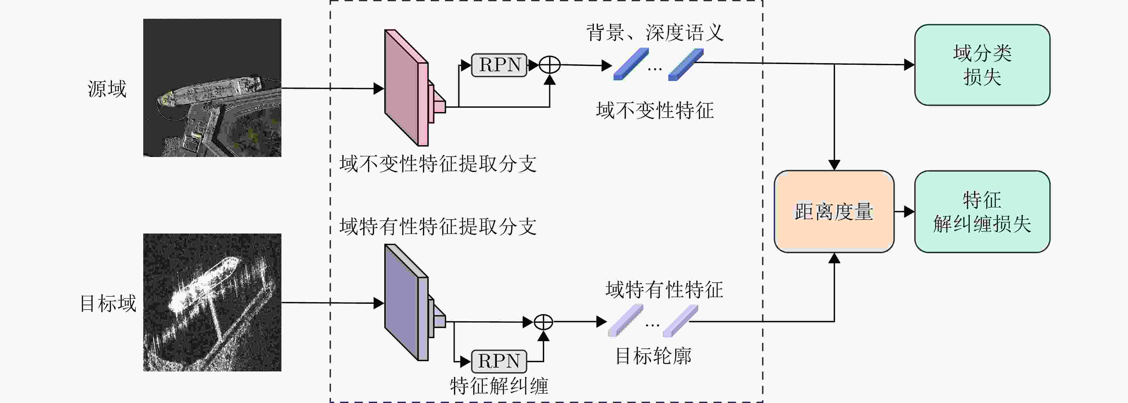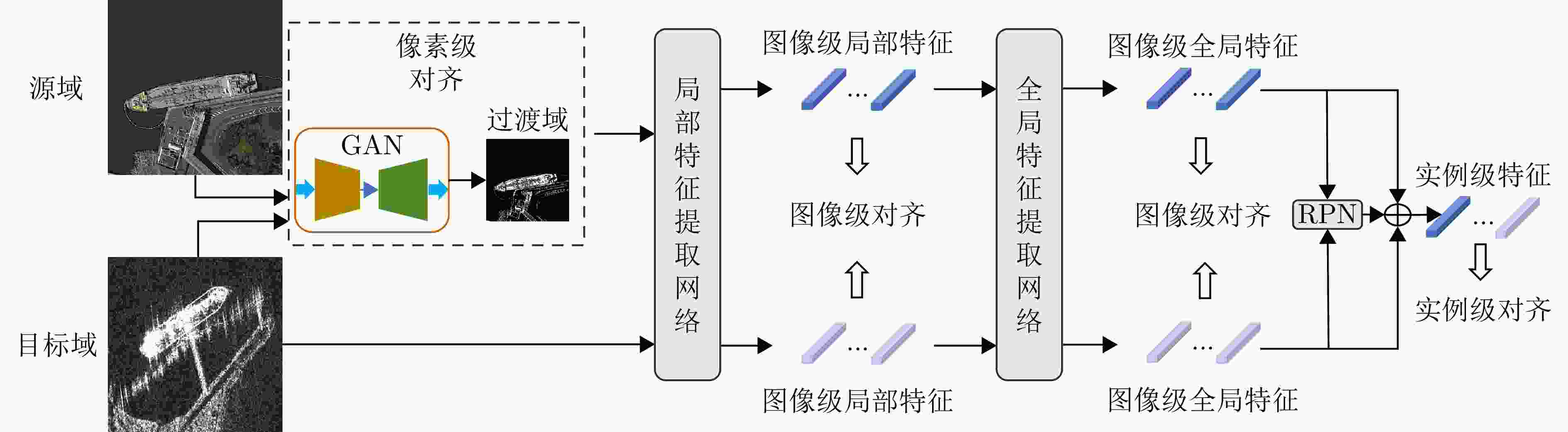 可能不稳定适用于源与目标域视觉风格差异较大的场景;[光学→SAR] 特征对齐 对源域和目标域特征进行对齐,使其在共享空间中表现相似 与检测网络结合紧密,