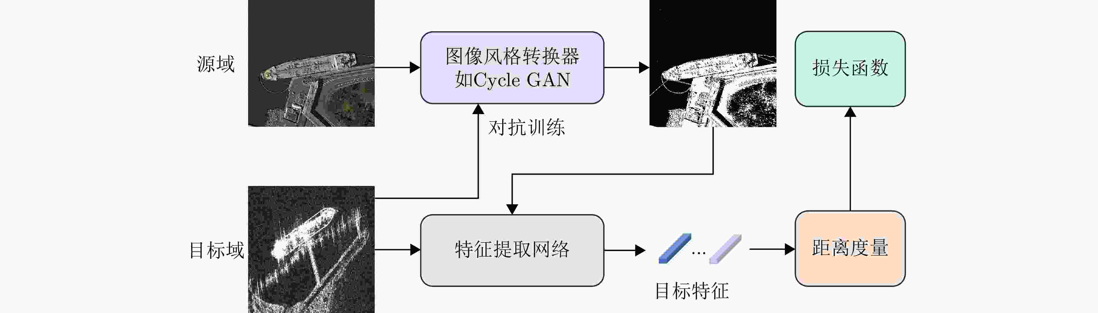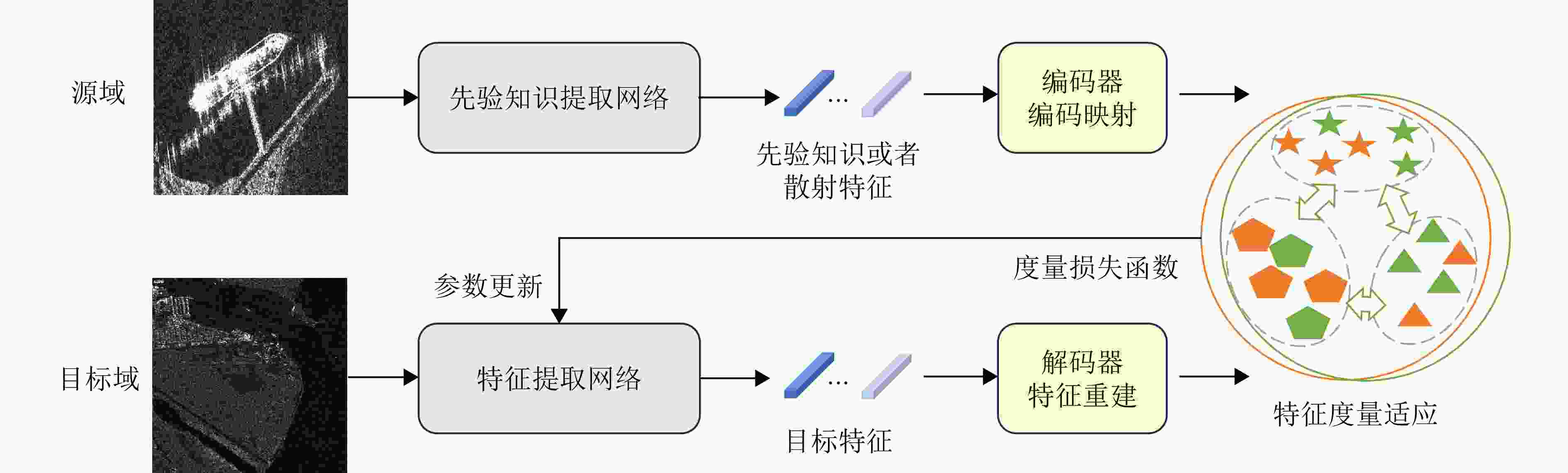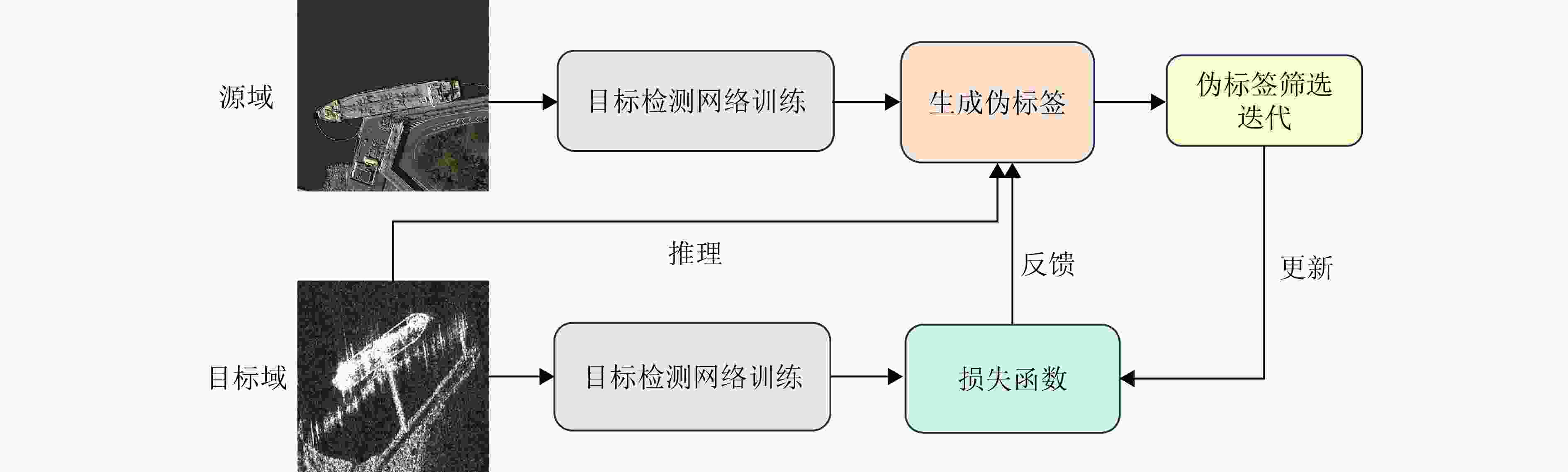 增加计算复杂度适用于域间成像差异但仍处于同一模态空间的场景;[SAR→SAR] 伪标签生成 基于自训练生成伪标签,通过