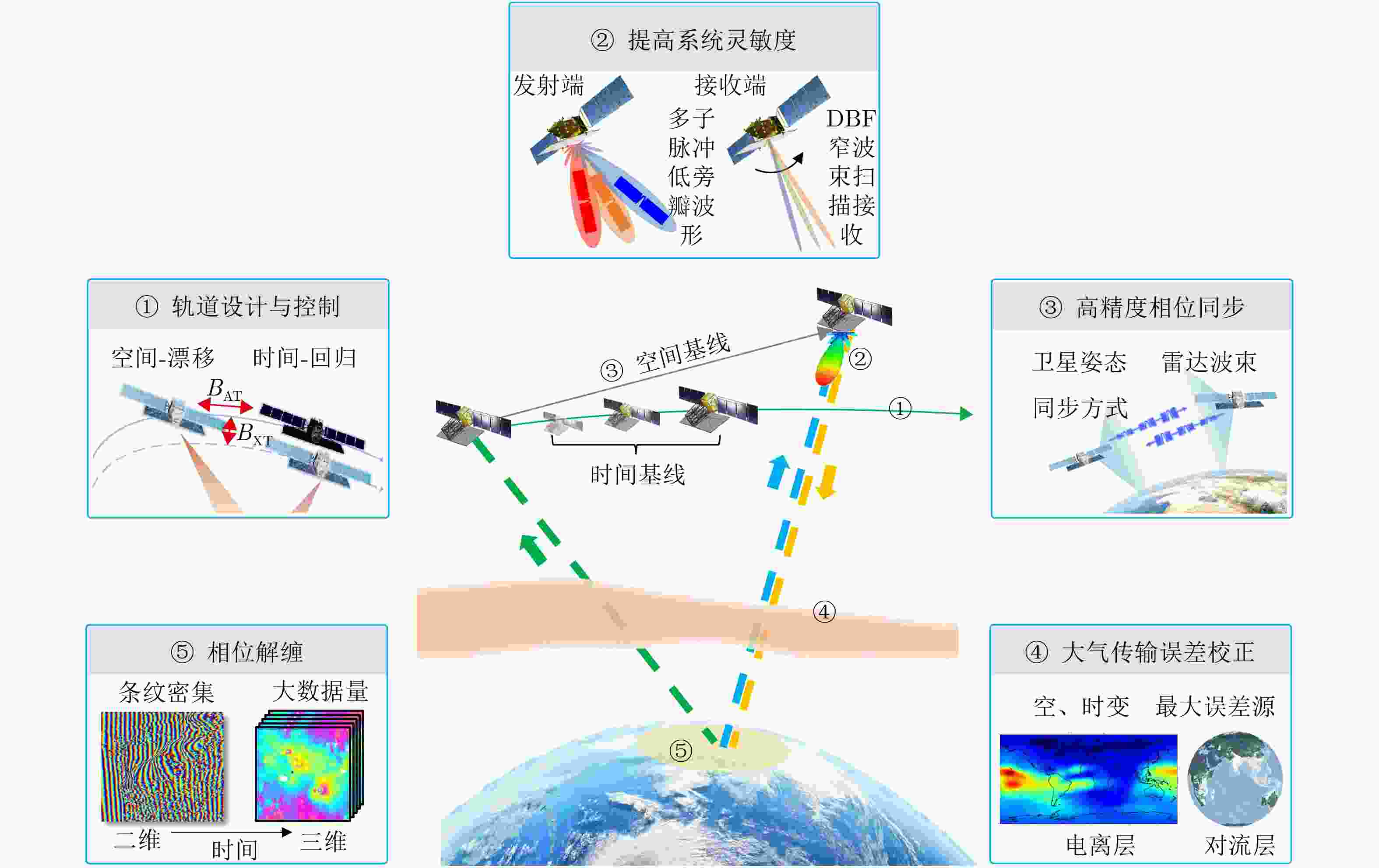 摘要: 星载干涉合成孔径雷达(InSAR)技术通过测量雷达视线方向的相位差实现地表高程测量与形变监测。然而,面向未来更高精度的干涉测量需求,InSAR系统设计参数与测量精度的解析模型仍存在关键参数不完备、物理约束刻画不充分等问题,对下一代合成孔径雷达干涉测量技术的发展形成制约。该文针对系统设计参数和测量精度间存在的复杂多因素耦合问题开展研究,详细分析了空间、时间基线星载干涉合成孔径雷达成像理论约束关系,构建了融合多源失相干的空-时误差模型,量化了基线参数与测量精度的非线性关系,建立了涵盖相干性、高程精度、基于相干时间基线的形变灵敏度等关键指标的完备评估框架,在此基础上提出了超长基线星载InSAR的概念与体制。同时,对超长基线星载InSAR的性能进行了详细分析,阐述了超长基线星载InSAR在轨道设计、系统设计、同步方法、误差校正以及相位解缠等方面的技术挑战,介绍了超长基线星载InSAR在高精度高程测量与形变测量以及分布式SAR系统等方面的应用潜力,可为未来新一代高精度、多维度InSAR系统设计提供理论支撑,在地球科学前沿探索与国家重大工程安全保障中发挥更大价值。Abstract: Spaceborne Interferometric Synthetic Aperture Radar (InSAR) enables surface elevation measurement and deformation monitoring by measuring phase differences along the radar line of sight. However, meeting the future demand for higher-precision measurements remains challenging: analytical models linking InSAR system design parameters to measurement accuracy are still limited by incomplete key parameters and insufficient or unclear physical constraints. These limitations restrict the development of next-generation InSAR technology. This study examines the complex multifactor coupling between system design parameters and measurement accuracy. It provides a detailed analysis of the imaging mechanism and theoretical constraints of spaceborne InSAR with spatial and temporal baselines and presents a spatiotemporal error model integrating multisource decorrelation. The nonlinear relationship between baseline parameters and measurement accuracy is quantitatively characterized, and a comprehensive evaluation framework is established based on key indicators such as coherence, elevation accuracy, and coherent temporal baseline-based deformation sensitivity. Built on top of these analysis, the concept and system architecture of very large baseline spaceborne InSAR are proposed, and its performance is analyzed in detail. The associated technical challenges—including orbit configuration, system design, synchronization, error correction, and phase unwrapping—are systematically discussed. Potential applications of this type of InSAR system architecture in high-precision elevation, deformation measurements, and distributed SAR systems are introduced. The proposed framework provides theoretical support for the design of next-generation high-precision, multidimensional InSAR systems and is expected to play a key role in the frontier of Earth science exploration and the safety assurance of major national engineering projects.