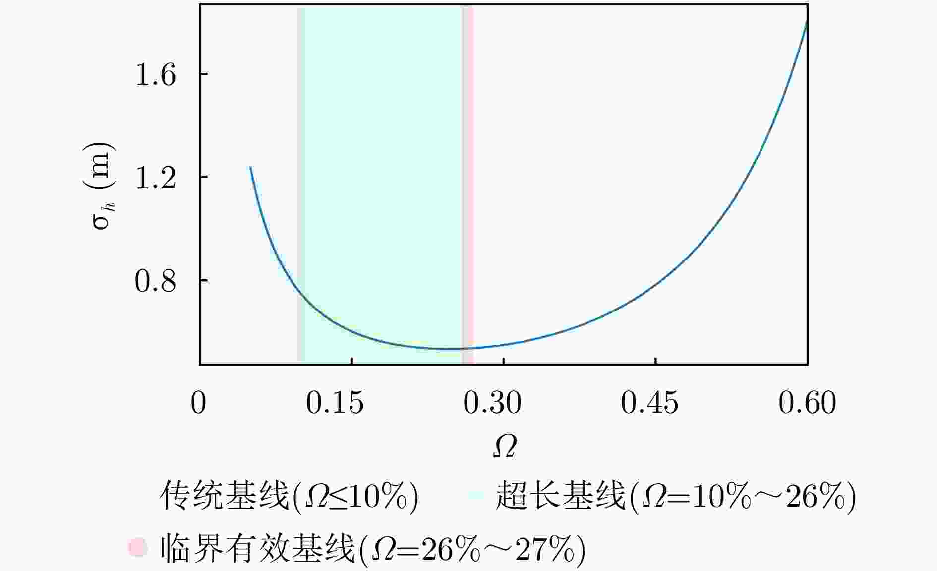 严重失相干导致测量结果不可信$ {\mathrm{d}}{\sigma }_{h}/{\mathrm{d}}{\varOmega }=0 $ $ {\varOmega }=26\mathrm{\% }{\text{~}}27\mathrm{\% } $ 临界有效空间基线 作为高程误差随EBF变化的分界点,是高程误差收敛至全局最小值(精度最高)的理论边界点;是基线增益与失相干损耗的平衡临界点,标志误差主导因素本质转变;是InSAR系统精度调控拐点,提供量化基线参数最优阈值,对应精度最优状态 $ \begin{aligned}& {\rm d}{\sigma }_{h}/{\rm d }{\varOmega } \lt 0\\& 且{\varOmega } \gt 10\mathrm{\% }\end{aligned} $ $ 10\mathrm{\% } \lt {\varOmega } \lt 26\mathrm{\% } $ 超长空间基线 导数变化变缓,高程精度对基线长度变化仍敏感,但开始出现相干性造成的误差抵消高程精度的提升,控制误差优于提升基线长度,需严格把控失相干误差的影响 $ {\varOmega }\leq 10\mathrm{\% } $ $ {\varOmega }\leq 10\mathrm{\% } $ 传统空间基线[15,17,18] 即传统短基线和长基线。导数快速变化,基线增益起主导作用,