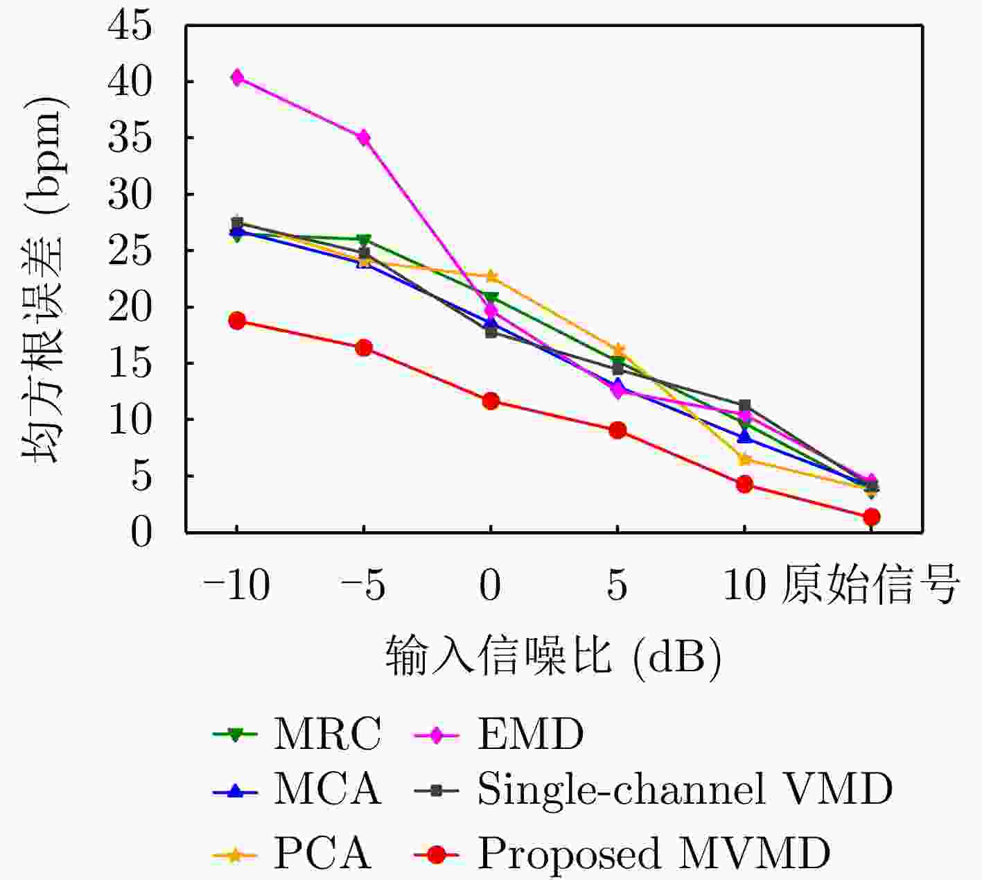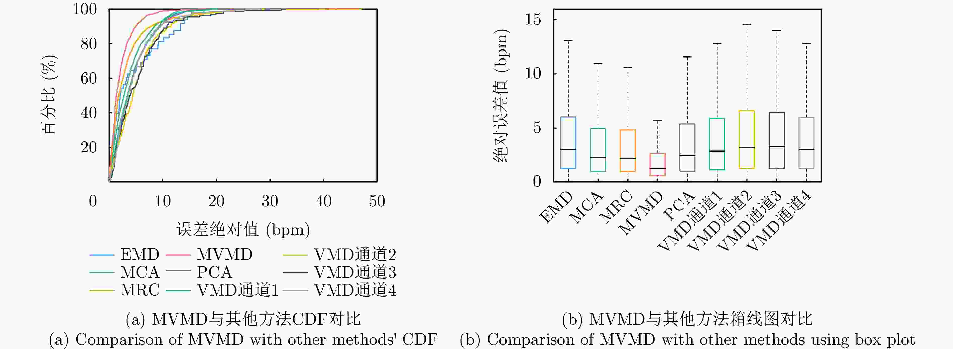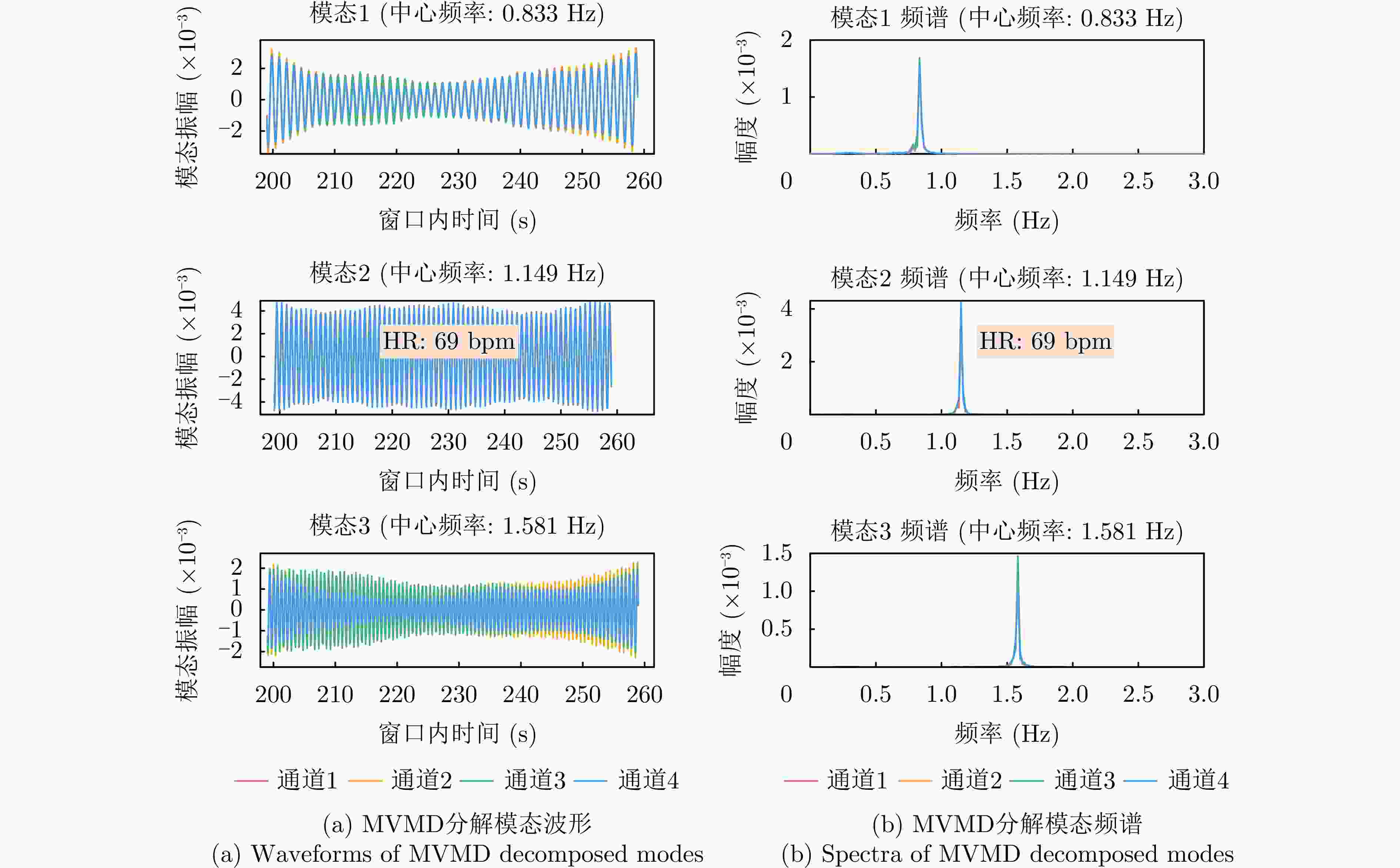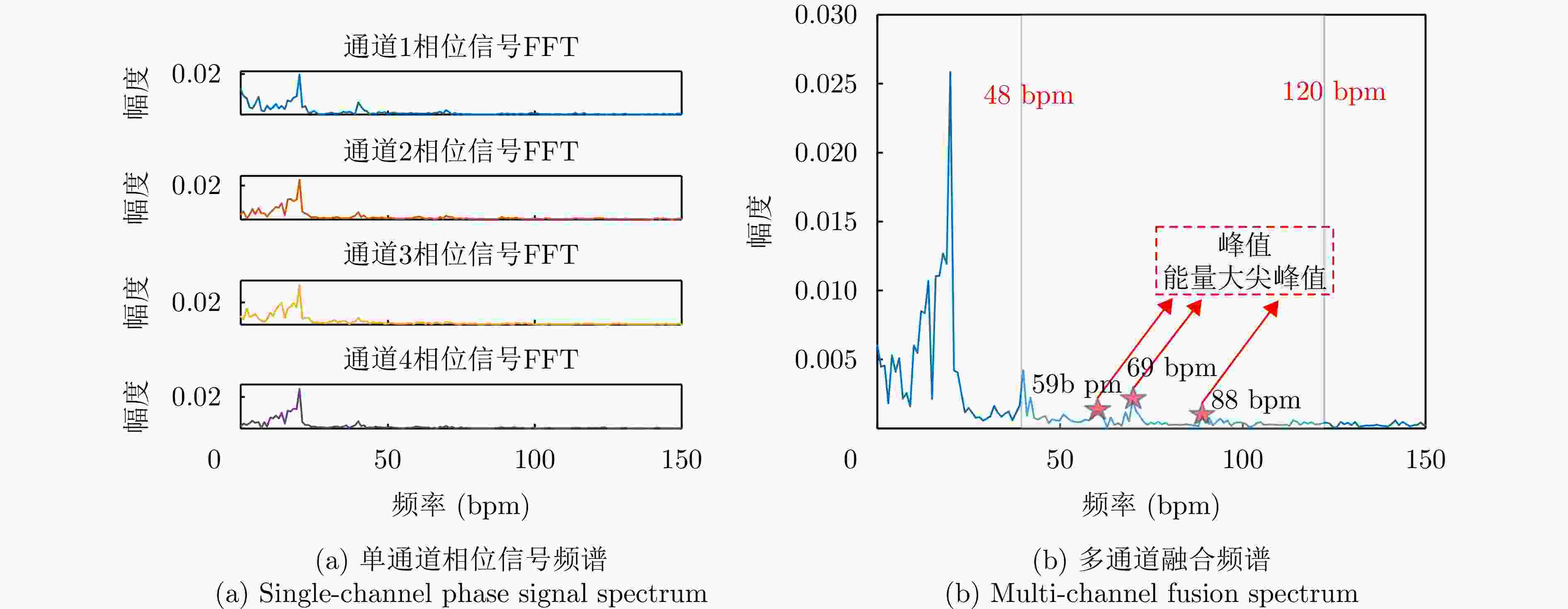 摘要: 心率作为反映人体健康的核心生理指标,其精准监测在心律失常筛查、冠心病预警、慢性心衰管理等场景中具有重要临床意义。然而,心跳回波信号易受呼吸运动伪影、环境电磁干扰等耦合影响,导致信号信噪比降低,进而影响心率估计的准确性。针对上述问题,该文充分挖掘不同通道间的共有心跳信息,提出一种基于多变量变分模态分解(MVMD)的多通道联合心率估计方法。该方法首先构建以模态总带宽最小化为目标、以重构残差为约束的多通道联合优化模型;其次,利用多通道频谱峰值的累积效应自适应初始化中心频率,从而在多通道数据中稳健分离出具有频率一致性的心跳模态;最后,依据能量最大准则从分解模态中筛选出心率模态,完成心率估计。基于6名受试者的实测数据验证显示,该文所提出的基于多通道联合估计方法的心率中位误差为1.53 bpm,性能优于传统单通道及现有多通道融合心率估计方法。Abstract: Heart rate (HR), a core physiological indicator of human health, is of substantial clinical importance when accurately monitored in applications such as arrhythmia screening, early warning of coronary heart disease, and chronic heart failure management. However, cardiac echo signals are susceptible to coupled disturbances, including respiratory motion artifacts and environmental electromagnetic interference, which degrade the signal-to-noise ratio and compromise HR estimation accuracy. To address these challenges, we propose a multi-channel joint HR estimation method based on multivariate variational mode decomposition that exploits shared cardiac information across different channels. Specifically, the proposed method first constructs a multi-channel joint optimization model that minimizes the total modal bandwidth under reconstruction residual constraints. It then adaptively initialize the center frequency by leveraging the cumulative effect of multi-channel spectral peaks, enabling robust separation of heartbeat modes with consistent frequencies across channels. Finally, the HR mode is selected from the decomposed modes using a maximum energy criterion to complete HR estimation. Validation on real-world data from six subjects demonstrated that the proposed method achieves a median HR error of 1.53 bpm, outperforming conventional single-channel approaches and existing multi-channel fusion-based HR estimation methods.