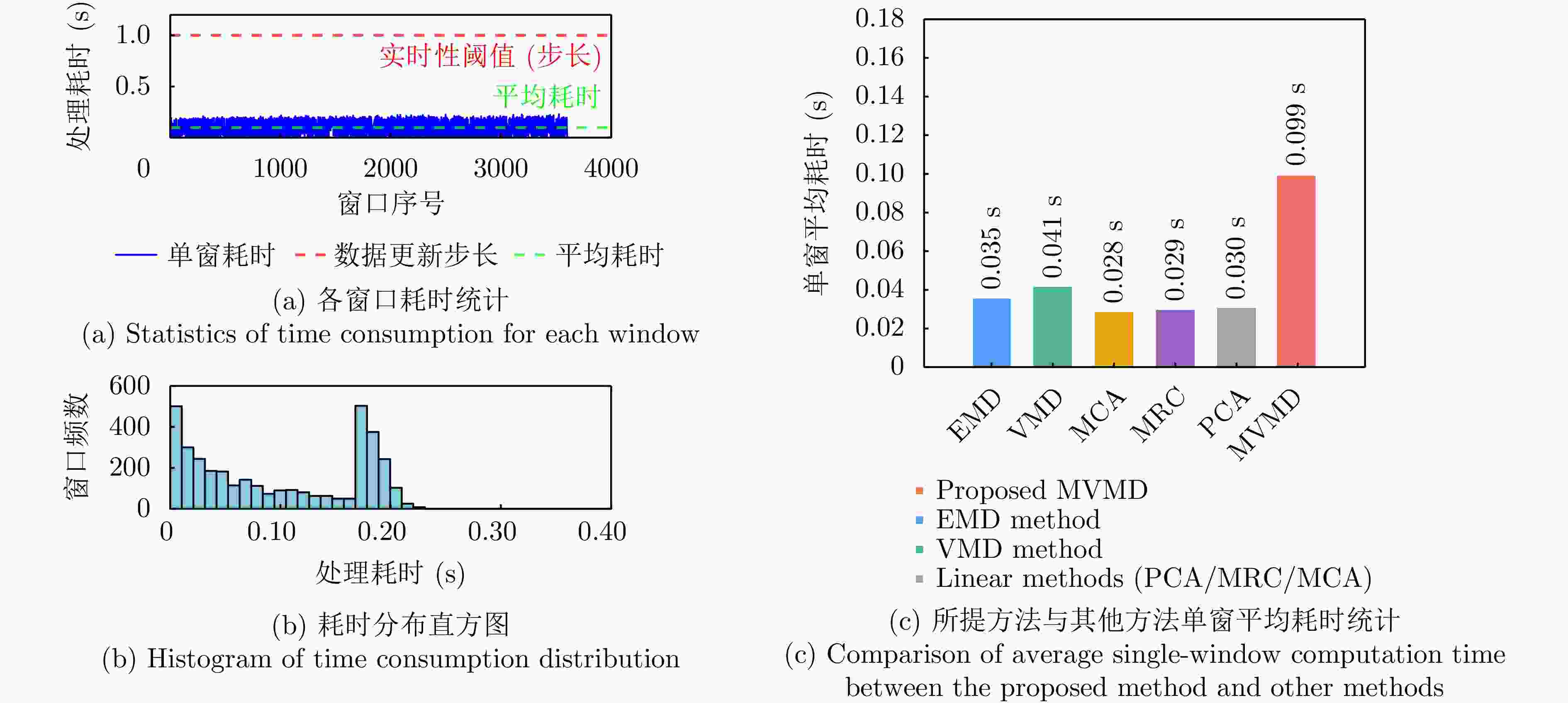 算法 时间复杂度 浮点运算次数估算 实际单窗平均耗时(s) VMD O (IKNlog2N) 7.35×107 0.041 EMD O(N2) 1.62×105 0.035 MCA O(BN) 3.24×103 0.028 MRC O(BN) 4.32×103 0.029 PCA O(B2N+ B3) 8.70×103 0.030 所提MVMD方法 O(BIKNlog2N) 2.94×108 0.099 -