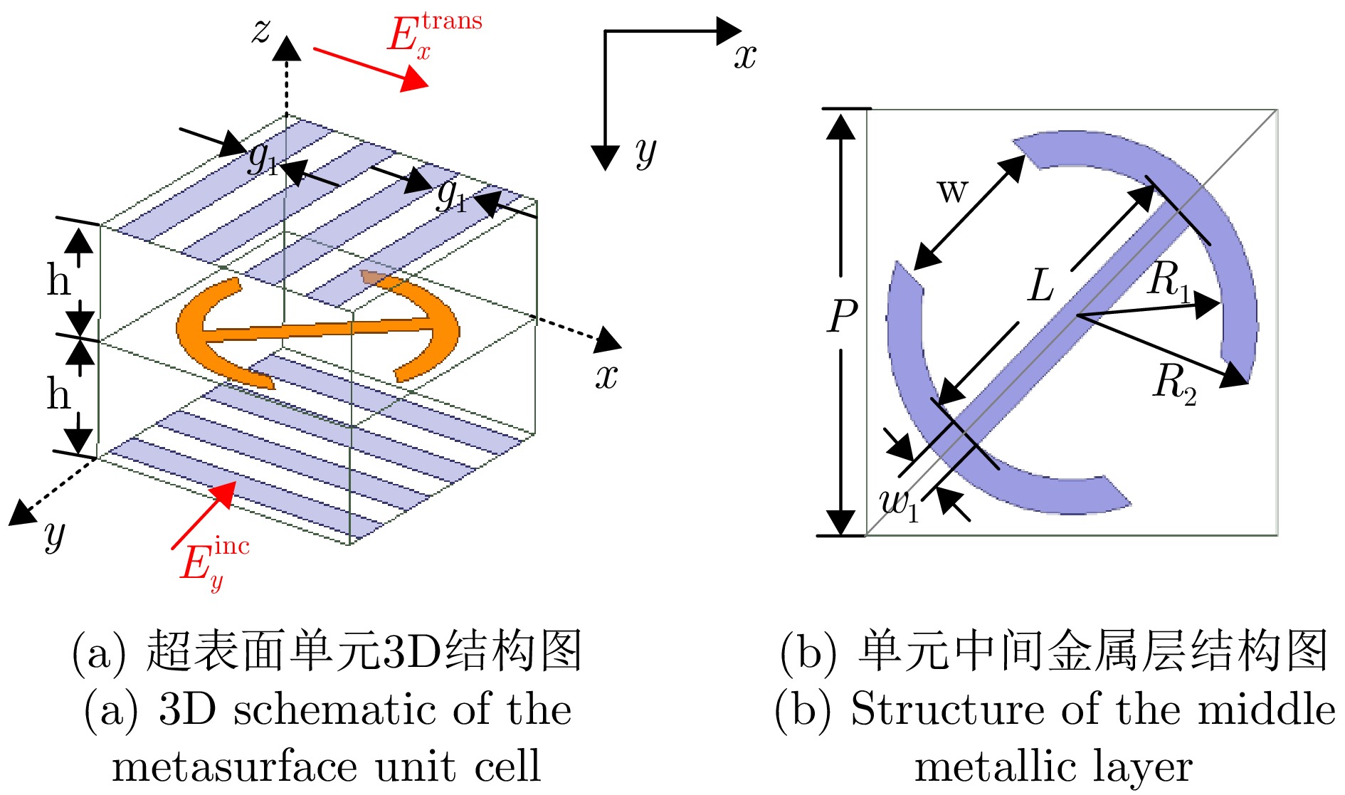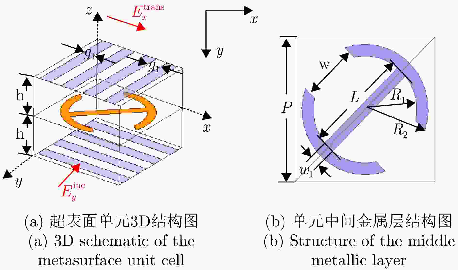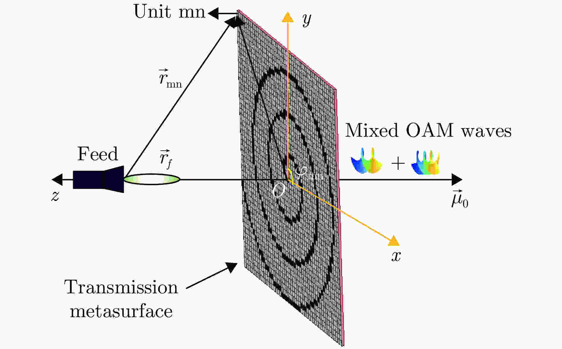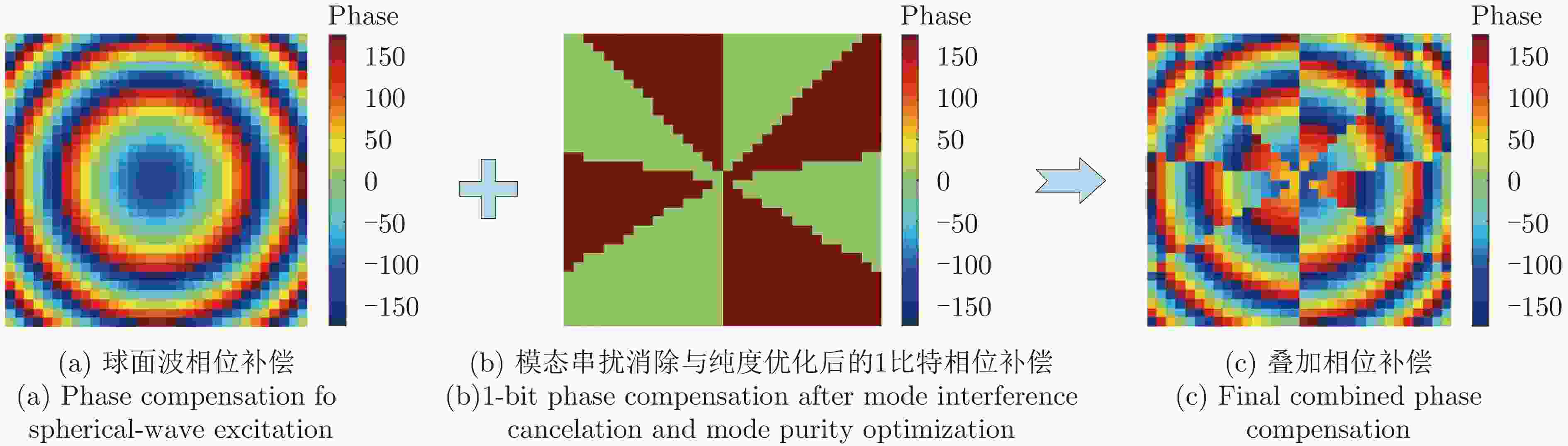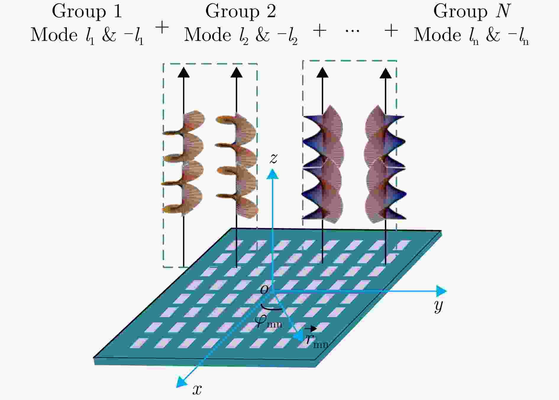 摘要: 携带轨道角动量(OAM)的涡旋电磁波在理论上能够提供无穷多组正交模态和差异性的螺旋波前相位梯度特性,可有效提升无线通信的频谱利用率和雷达的探测感知能力,在无线通信和雷达探测与成像领域均表现出重要的研究价值和应用潜力。然而,多模态涡旋电磁波产生过程中易出现模态间串扰及模态纯度不平衡等问题,严重影响其在通信与雷达探测系统中的性能表现。针对上述问题,该文从数学原理出发,提出了一种基于1比特相位调控的多模态涡旋电磁波生成与优化新方法,可有效实现多模态涡旋电磁波(l = ±1, ±2, …, ±n, n ∈ N+)的同时生成、模态间串扰抑制以及多模态纯度的一致性提升。为验证所提方法的有效性,该文通过数值仿真实现了16模态(l = ±1 & ±2 & ±3 & ±4 & ±5 & ±6 & ±7 & ±8)涡旋电磁波的复用生成与优化;进一步选取具有代表性的8模态涡旋波(l = ±1 & ±2 & ±3 & ±4)示例,完成了相应透射型超表面设计、仿真、加工与实验验证。仿真与实测结果均表明基于该方法能够稳定产生目标多模态涡旋电磁波,其中模态干扰被有效抑制,各涡旋模态的模态纯度实现一致性优化。该研究为解决多模态涡旋电磁波的串扰与纯度控制难题提供了一条低相位调控复杂度、高灵活性且具有普适性的技术路径,为高容量涡旋通信与高分辨率雷达探测系统提供了创新性的实现方案。Abstract: Vortex waves carrying orbital angular momentum (OAM) theoretically support an infinite set of orthogonal modes and exhibit distinctive helical phase-front gradients, thus enhancing spectral efficiency and sensing capability in wireless communication and radar sensing applications. However, the practical implementation of multimode OAM generation is constrained by mode interference and imbalances in mode purity, severely degrading system performance. To address these challenges, this paper conducts a rigorous mathematical analysis and develops a novel method for generating multimode OAM waves with an optimized mode purity. Requiring only 1-bit quantized phase manipulation, the proposed approach enables the simultaneous generation of multimode OAM waves (l = ±1, ±2, ···, ±n, n ∈ N+), effectively suppresses mode interference, and achieves synchronous improvement in mode purity. To verify the proposed method, numerical simulations were performed to generate and optimize multimode vortex waves with 16 OAM modes (l = ±1, ±2, ±3, ±4, ±5, ±6, ±7, ±8). A representative eight-mode OAM multiplexing case was then selected, and a transmission metasurface antenna capable of simultaneously multiplexing eight OAM modes (l = ±1, ±2, ±3, ±4) was designed, fabricated, and experimentally characterized. Both simulated and measured results demonstrate the effective suppression of mode interference and consistent mode purity across all generated OAM modes. As such, this work presents a flexible and general solution for multimode OAM generation and optimization, featuring low-complexity phase control. It also provides a practical implementation path for high-capacity communication and high-resolution radar systems.