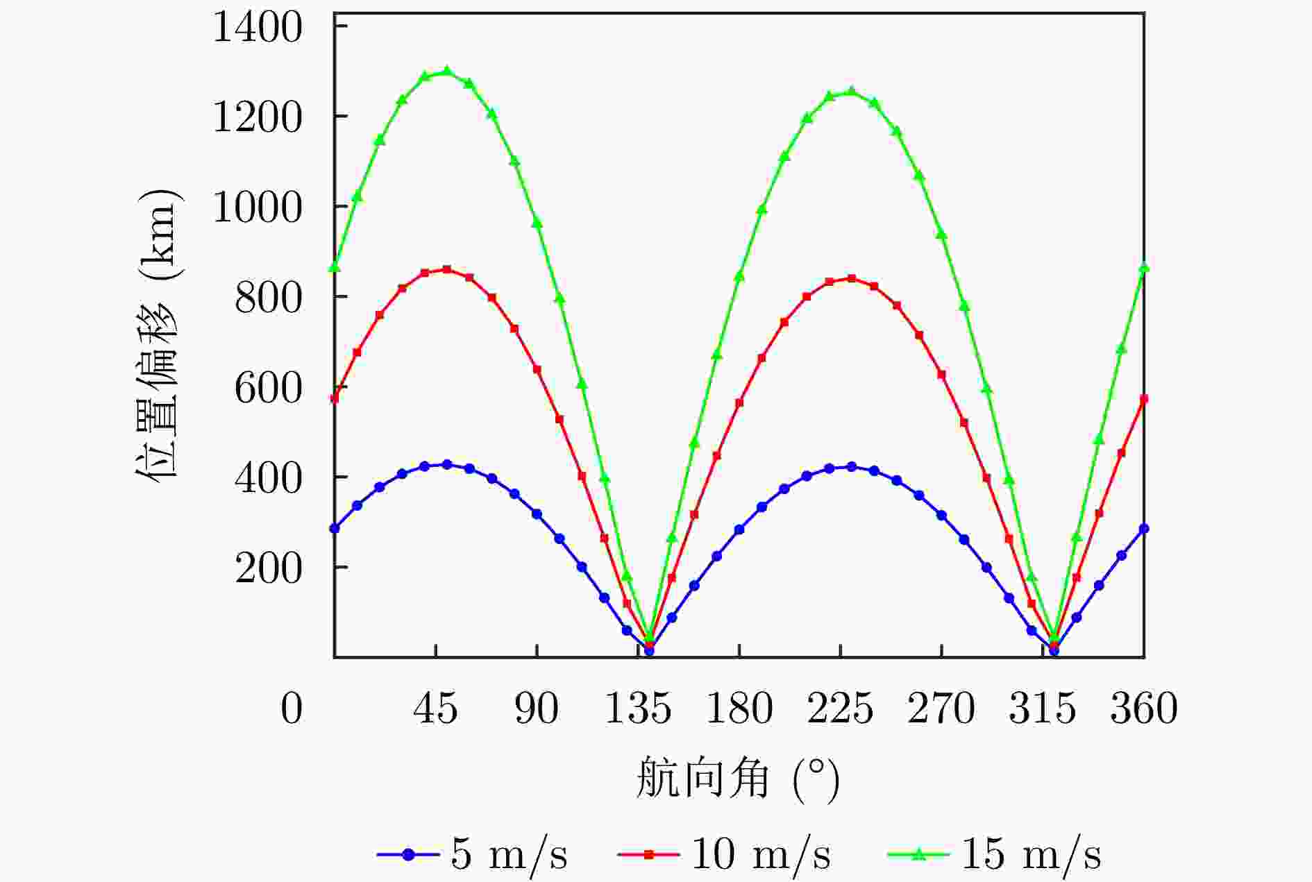 图  12  不同航速下位置偏移随航向(以正北为0°)的关系