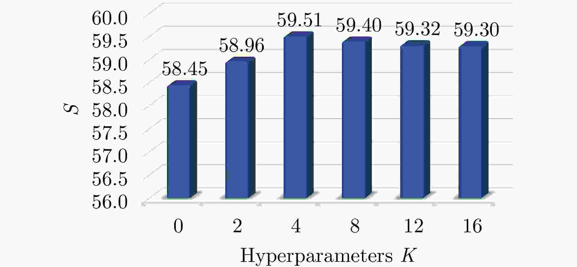 数据集 SF DCT Gabor ${\mathcal{L}}_{\text{b}} $ ${\mathcal{L}}_{\text{m}} $ BLEU-4 METEOR ROUGE-L CIDEr S SARLANG × × × × × 22.77 22.15 43.59 140.63 57.28 √ × × × × 23.13 23.14 44.44 141.19 57.97 √ √ × × × 22.64 23.28 44.32 143.54 58.45 √ √ √ × × 23.83 23.58 45.42 145.22 59.51 √ √ √ √ × 24.19 23.86 45.76 149.87 60.92 √ √ √ √ √ 24.31 23.78 45.79 151.00 61.22 FSAR-Cap × × × × × 37.92 28.25 52.78 90.22 52.30 √ × × × × 38.60 28.69 52.94 90.19 52.61 √ √ × × × 38.56 28.49 53.60 92.20 53.21 √ √ √ × × 38.57 28.55 53.57 93.66 53.59 √ √ √ √ × 38.58 28.96 53.54 94.88 53.99 √ √ √ √ √ 38.99 28.80 53.58 95.14 54.13 注:加粗数值为最优指标数值。 表 6 SARLANG和FSAR-Cap数据集上不同组合的消融实验