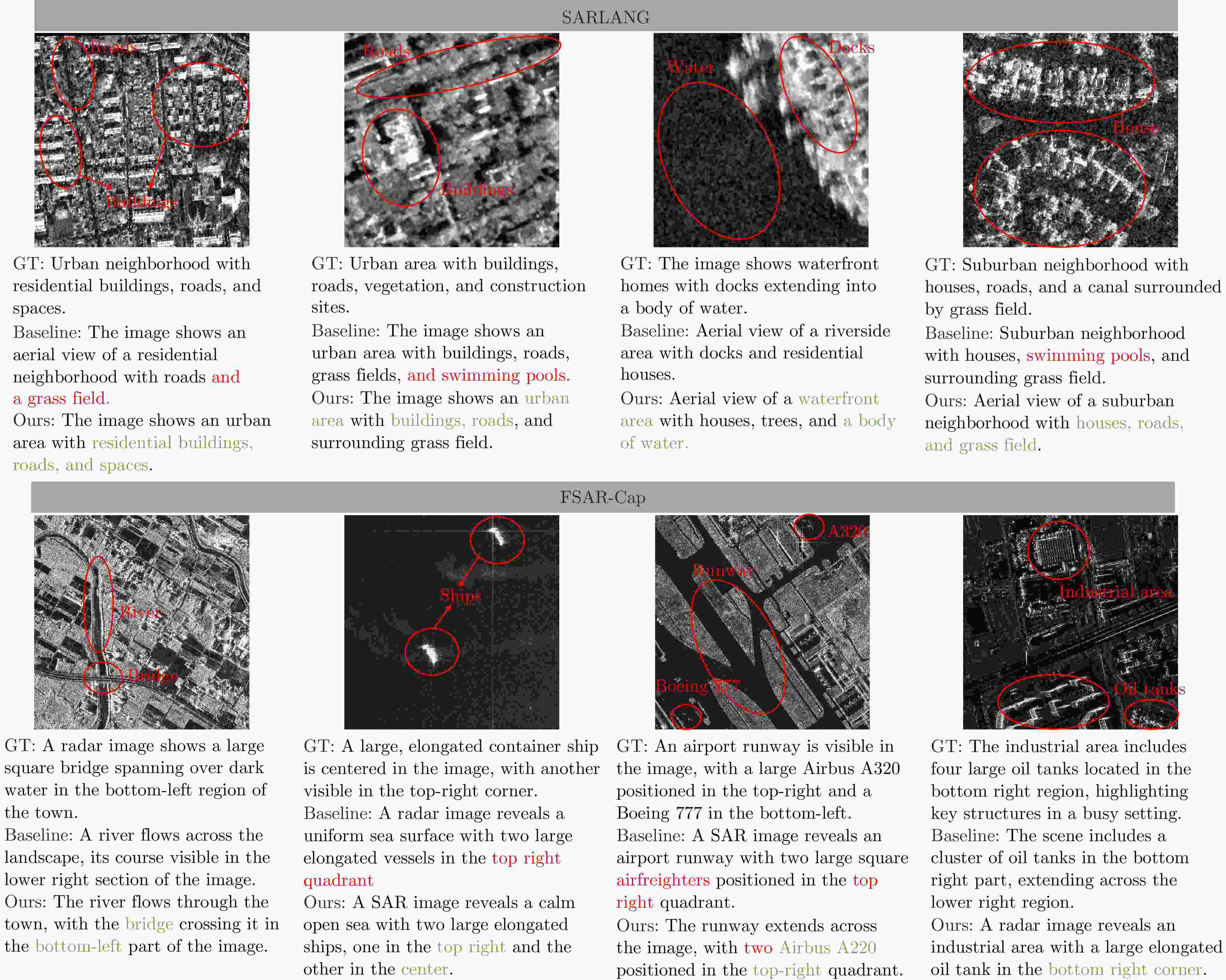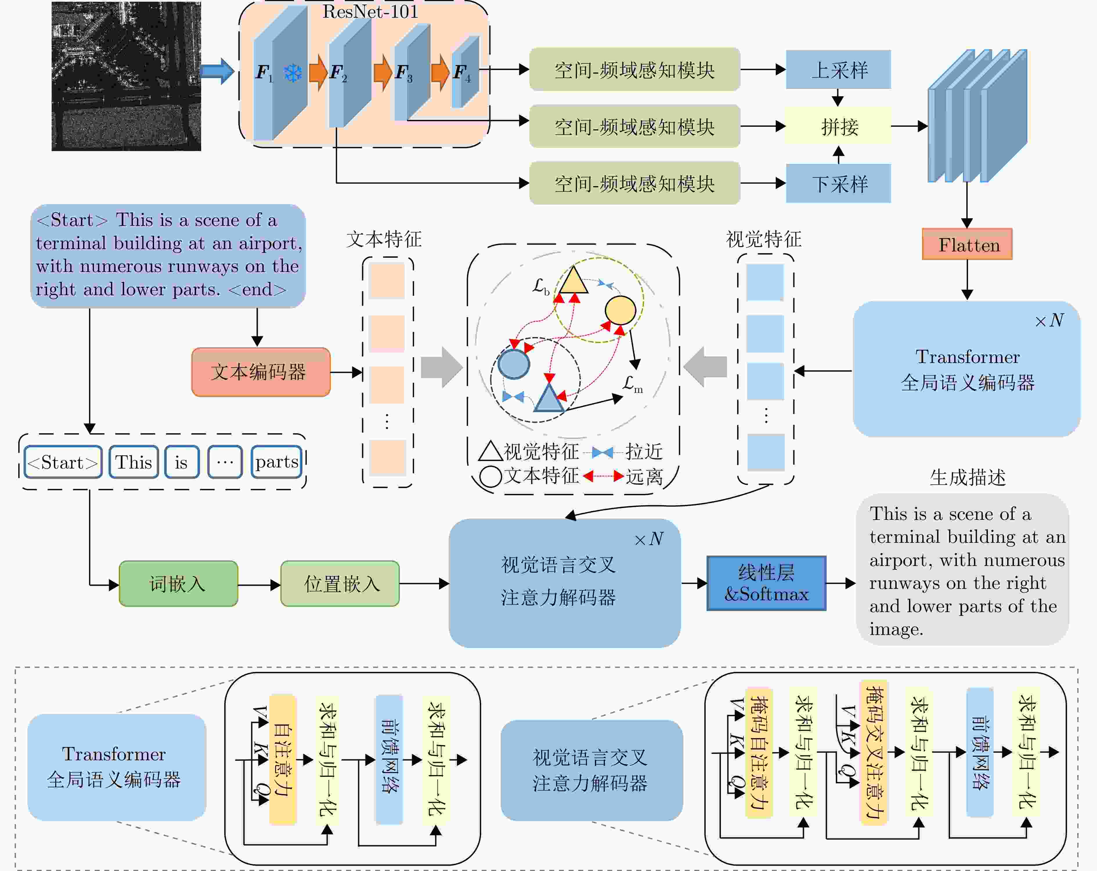 72400 条高质量图文对的大规模细粒度SAR图像描述数据集FSAR-Cap。实验结果表明,该方法在SARLANG和FSAR-Cap数据集上的CIDEr指标分别达到151.00和95.14。定性分析表明,该模型有效抑制了幻觉,并准确捕捉了细粒度的空间纹理细节,显著优于主流方法。Abstract: Synthetic Aperture Radar (SAR), as an active microwave remote sensing system, offers all-weather, all-day observation capabilities and has considerable application value in disaster monitoring, urban management, and military reconnaissance. Although deep learning techniques have achieved remarkable progress in interpreting SAR images, existing methods for target recognition and detection primarily focus on local feature extraction and single-target discrimination. They struggle to comprehensively characterize the global semantic structure and multitarget relationships in complex scenes, and the interpretation process remains highly dependent on human expertise with limited automation. SAR image captioning aims to translate visual information into natural language, serving as a key technology to bridge the gap between “perceiving targets” and “cognizing scenes,” which is of great importance for enhancing the automation and intelligence of SAR image interpretation. However, the inherent speckle noise, the scarcity of textural details, and the substantial semantic gap in SAR images further exacerbate the difficulty of cross-modal understanding. To address these challenges, this paper proposes a spatial-frequency aware model for SAR image captioning. First, a spatial-frequency aware module is constructed. It employs a Discrete Cosine Transform (DCT) mask attention mechanism to reweight spectral components for noise suppression and structure enhancement, combined with a Gabor multiscale texture enhancement submodule to improve sensitivity to directional and edge details. Second, a cross-modal semantic enhancement loss function is designed to bridge the semantic gap between visual features and natural language through bidirectional image-text alignment and mutual information maximization. Furthermore, a large-scale fine-grained SAR image captioning dataset, FSAR-Cap, containing 72400 high-quality image-text pairs, is constructed. The experimental results demonstrate that the proposed method achieves CIDEr scores of 151.00 and 95.14 on the SARLANG and FSAR-Cap datasets, respectively. Qualitatively, the model effectively suppresses hallucinations and accurately captures fine-grained spatial-textural details, considerably outperforming mainstream methods. -
