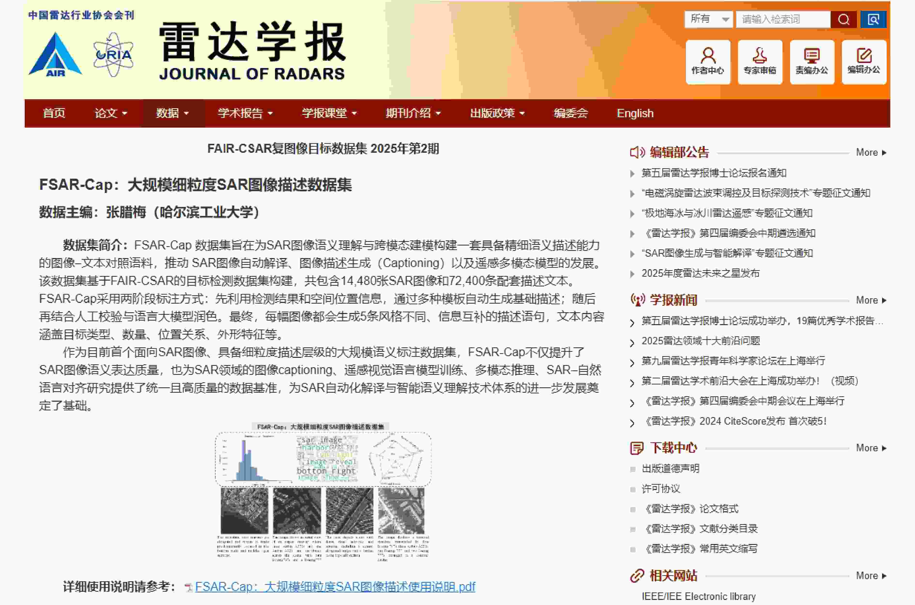 [1] WANG Kai, REN Zhongle, HOU Biao, et al. BSG-WSL: BackScatter-guided weakly supervised learning for water mapping in SAR images[J]. International Journal of Applied Earth Observation and Geoinformation, 2025, 136: 104385. doi: 10.1016/j.jag.2025.104385. [2] 郭倩, 王海鹏, 徐丰. SAR图像飞机目标检测识别进展[J]. 雷达学报, 2020, 9(3): 497–513. doi: 10.12000/JR20020.GUO Qian, WANG Haipeng, and XU Feng. Research progress on aircraft detection and recognition in SAR imagery[J]. Journal of Radars, 2020, 9(3): 497–513. doi: 10.12000/JR20020. [3] LI Weijie, YANG Wei, HOU Yuenan, et al. SARATR-X: Toward building a foundation model for SAR target recognition[J]. IEEE Transactions on Image Processing, 2025, 34: 869–884. doi: 10.1109/TIP.2025.3531988. [4] ZHANG Xinchen, ZHU Hao, LI Xiaotong, et al. Recurrent progressive fusion-based learning for multi-source remote sensing image classification[J]. Pattern Recognition, 2026, 171: 112284. doi: 10.1016/j.patcog.2025.112284. [5] QIN Jiang, ZOU Bin, LI Haolin, et al. Cross-resolution SAR target detection using structural hierarchy adaptation and reliable adjacency alignment[J]. IEEE Transactions on Geoscience and Remote Sensing, 2025, 63: 5221816. doi: 10.1109/TGRS.2025.3613170. [6] WANG Fangyi and WANG Haipeng. Scattering-aware adaptive dynamic node generation for SAR class-incremental learning[J]. IEEE Transactions on Geoscience and Remote Sensing, 2025, 63: 5220817. doi: 10.1109/TGRS.2025.3615628. [7] YUAN Mengchao, QIN Weibo, and WANG Haipeng. SPAttack: A physically feasible adversarial patch attack against SAR target detection[J]. IEEE Geoscience and Remote Sensing Letters, 2025, 22: 4001505. doi: 10.1109/LGRS.2025.3615852. [8] 罗汝, 赵凌君, 何奇山, 等. SAR图像飞机目标智能检测识别技术研究进展与展望[J]. 雷达学报(中英文), 2024, 13(2): 307–330. doi: 10.12000/JR23056.LUO Ru, ZHAO Lingjun, HE Qishan, et al. Intelligent technology for aircraft detection and recognition through SAR imagery: Advancements and prospects[J]. Journal of Radars, 2024, 13(2): 307–330. doi: 10.12000/JR23056. [9] TAO Wenguang, WANG Xiaotian, YAN Tian, et al. EDADet: Encoder-decoder domain augmented alignment detector for tiny objects in remote sensing images[J]. IEEE Transactions on Geoscience and Remote Sensing, 2025, 63: 5600915. doi: 10.1109/TGRS.2024.3510948. [10] CHANG Honghao, BI Haixia, LI Fan, et al. Deep symmetric fusion transformer for multimodal remote sensing data classification[J]. IEEE Transactions on Geoscience and Remote Sensing, 2024, 62: 5644115. doi: 10.1109/TGRS.2024.3476975. [11] GAO Han, WANG Changcheng, ZHU Jianjun, et al. TVPol-Edge: An edge detection method with time-varying polarimetric characteristics for crop field edge delineation[J]. IEEE Transactions on Geoscience and Remote Sensing, 2024, 62: 4408917. doi: 10.1109/TGRS.2024.3403481. [12] REN Zhongle, MENG Jianhua, ZHANG Cheng, et al. HATNet: Hierarchical attention transformer with RS-CLIP patch tokens for remote sensing image captioning[J]. IEEE Journal of Selected Topics in Applied Earth Observations and Remote Sensing, 2025, 18: 27208–27223. doi: 10.1109/JSTARS.2025.3624411. [13] ZHANG Cheng, REN Zhongle, HOU Biao, et al. Adaptive scale-aware semantic memory network for remote sensing image captioning[J]. IEEE Transactions on Geoscience and Remote Sensing, 2025, 63: 5653418. doi: 10.1109/TGRS.2025.3636596. [14] QIN Jiang, ZOU Bin, CHEN Yifan, et al. Scattering attribute embedded network for few-shot SAR ATR[J]. IEEE Transactions on Aerospace and Electronic Systems, 2024, 60(4): 4182–4197. doi: 10.1109/TAES.2024.3373379. [15] HAN Fangzhou, DONG Hongwei, SI Lingyu, et al. Improving SAR automatic target recognition via trusted knowledge distillation from simulated data[J]. IEEE Transactions on Geoscience and Remote Sensing, 2024, 62: 5204314. doi: 10.1109/TGRS.2024.3360470. [16] LU Xiaoqiang, WANG Binqiang, ZHENG Xiangtao, et al. Exploring models and data for remote sensing image caption generation[J]. IEEE Transactions on Geoscience and Remote Sensing, 2018, 56(4): 2183–2195. doi: 10.1109/TGRS.2017.2776321. [17] ZHANG Ke, LI Peijie, and WANG Jianqiang. A review of deep learning-based remote sensing image caption: Methods, models, comparisons and future directions[J]. Remote Sensing, 2024, 16(21): 4113. doi: 10.3390/rs16214113. [18] VINYALS O, TOSHEV A, BENGIO S, et al. Show and tell: A neural image caption generator[C]. 2015 IEEE Conference on Computer Vision and Pattern Recognition, Boston, USA, 2015: 3156–3164. doi: 10.1109/CVPR.2015.7298935. [19] HUANG Lun, WANG Wenmin, CHEN Jie, et al. Attention on attention for image captioning[C]. 2019 IEEE/CVF International Conference on Computer Vision, Seoul, South Korea, 2019: 4634–4643. doi: 10.1109/ICCV.2019.00473. [20] PAN Yingwei, YAO Ting, LI Yehao, et al. X-linear attention networks for image captioning[C]. 2020 IEEE/CVF Conference on Computer Vision and Pattern Recognition, Seattle, USA, 2020: 10971–10980. doi: 10.1109/CVPR42600.2020.01098. [21] CORNIA M, STEFANINI M, BARALDI L, et al. Meshed-memory transformer for image captioning[C]. 2020 IEEE/CVF Conference on Computer Vision and Pattern Recognition, Seattle, USA, 2020: 10575–10584. doi: 10.1109/CVPR42600.2020.01059. [22] CHEN Long, ZHANG Hanwang, XIAO Jun, et al. SCA-CNN: Spatial and channel-wise attention in convolutional networks for image captioning[C]. 2017 IEEE Conference on Computer Vision and Pattern Recognition, Honolulu, USA, 2017: 5659–5667. doi: 10.1109/CVPR.2017.667. [23] WANG Yiyu, XU Jungang, and SUN Yingfei. End-to-end transformer based model for image captioning[C]. The 36th AAAI Conference on Artificial Intelligence, Vancouver, Canada, 2022: 2585–2594. doi: 10.1609/aaai.v36i3.20160. [24] GUO Longteng, LIU Jing, ZHU Xinxin, et al. Normalized and geometry-aware self-attention network for image captioning[C]. 2020 IEEE/CVF Conference on Computer Vision and Pattern Recognition, Seattle, USA, 2020: