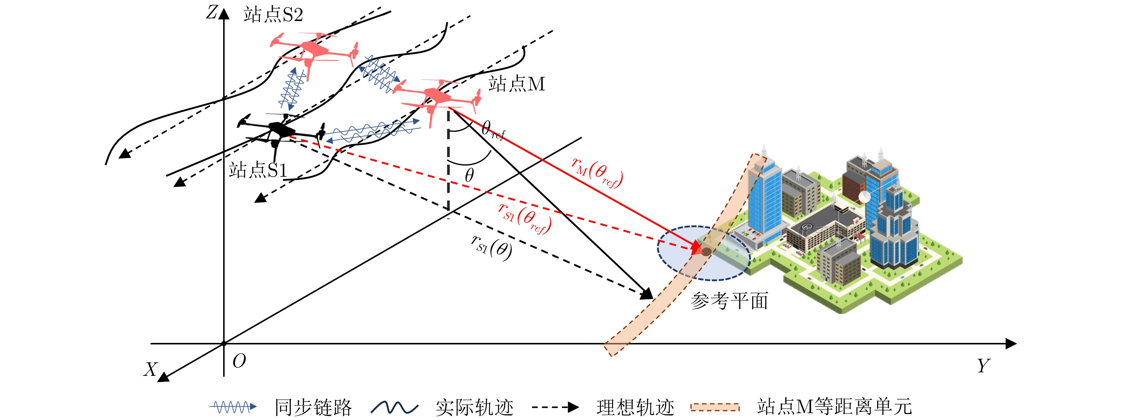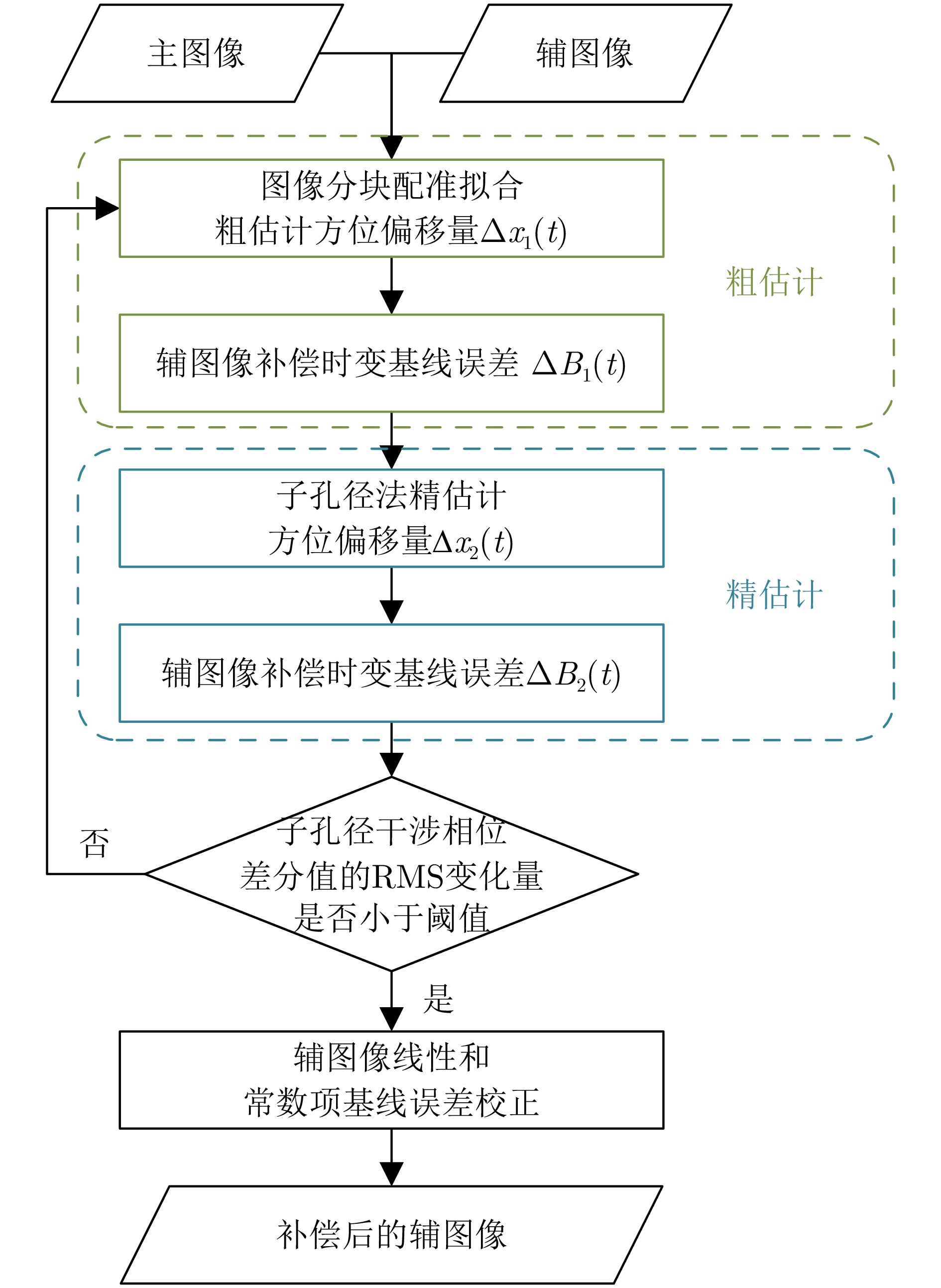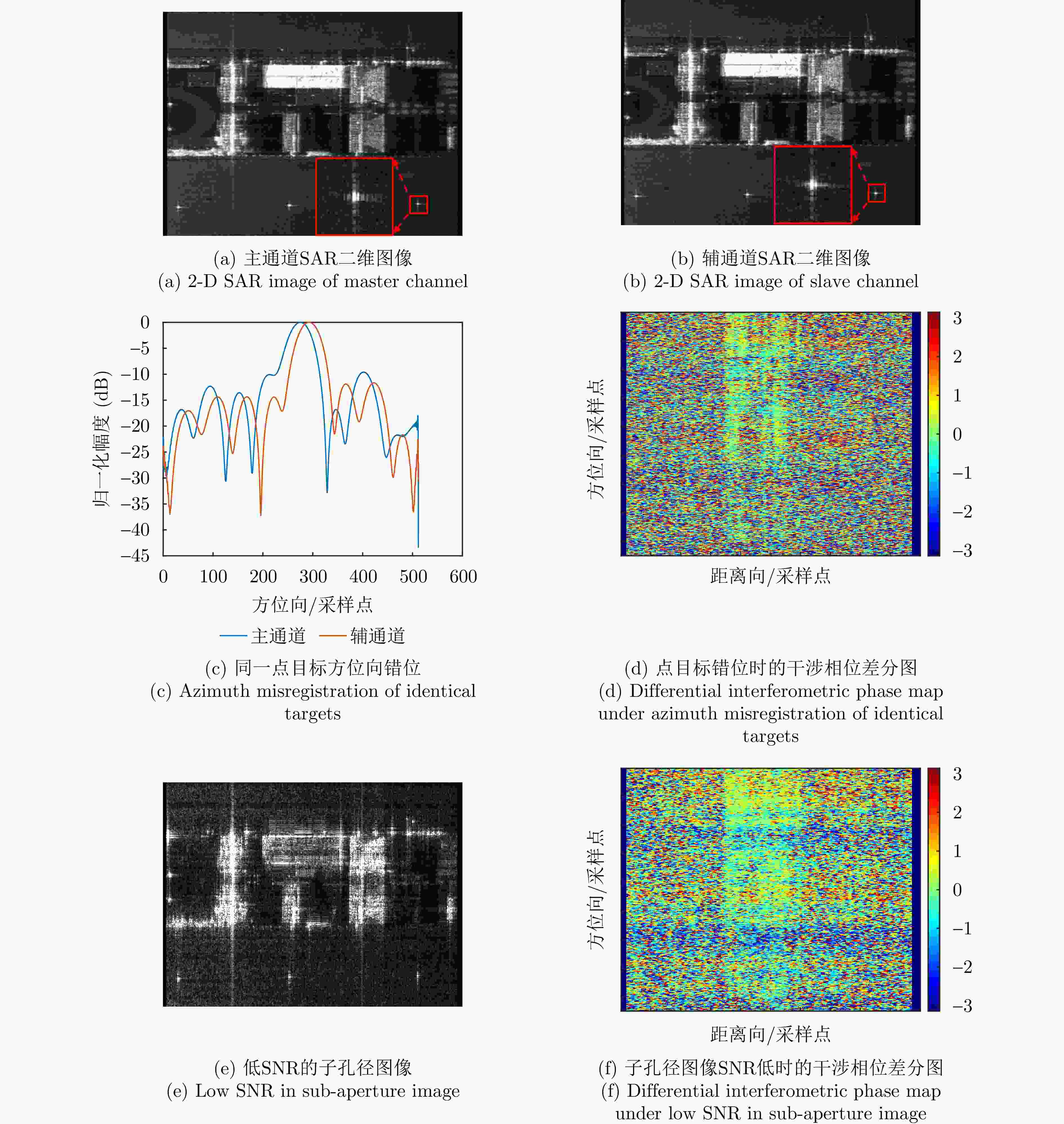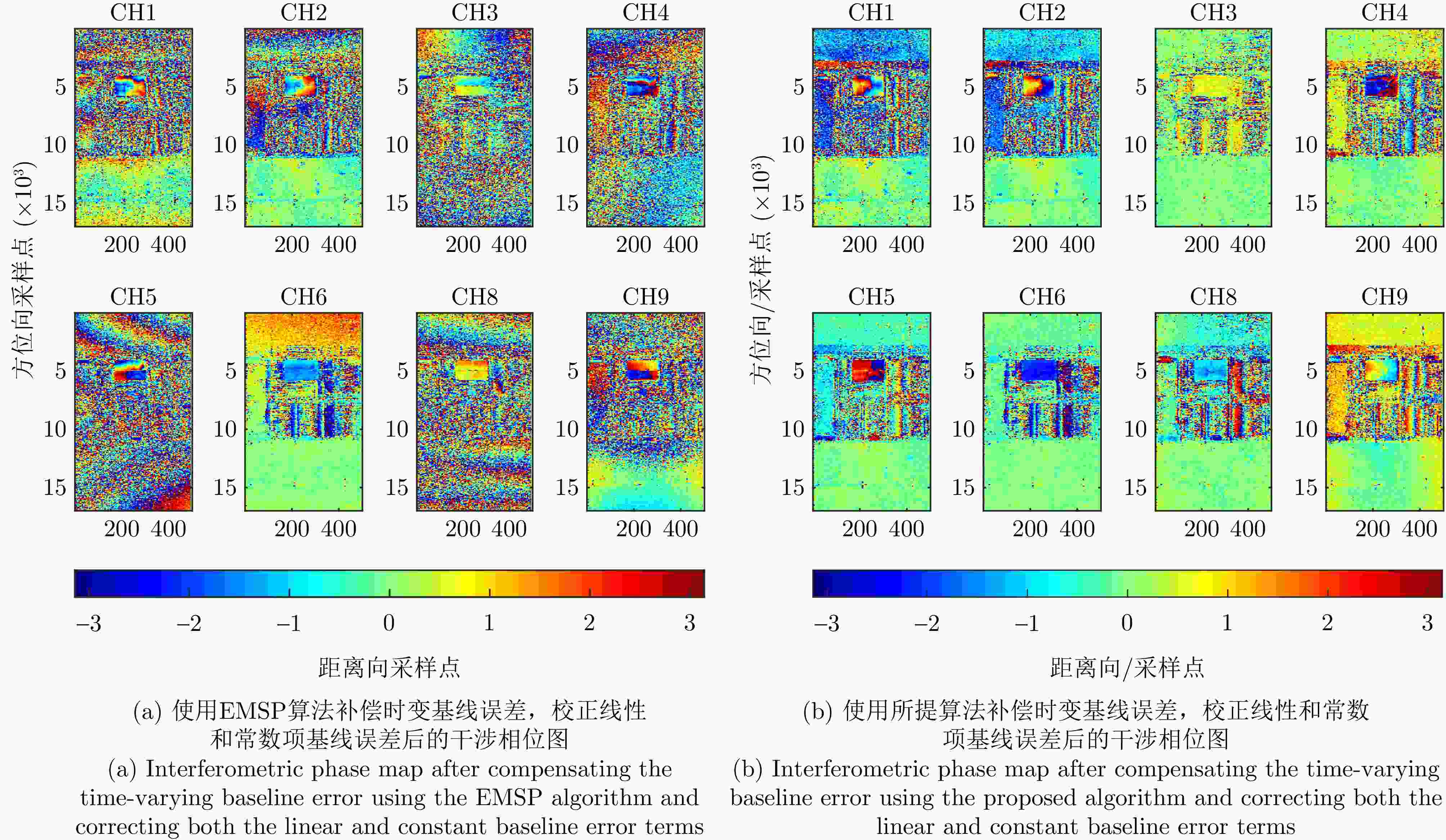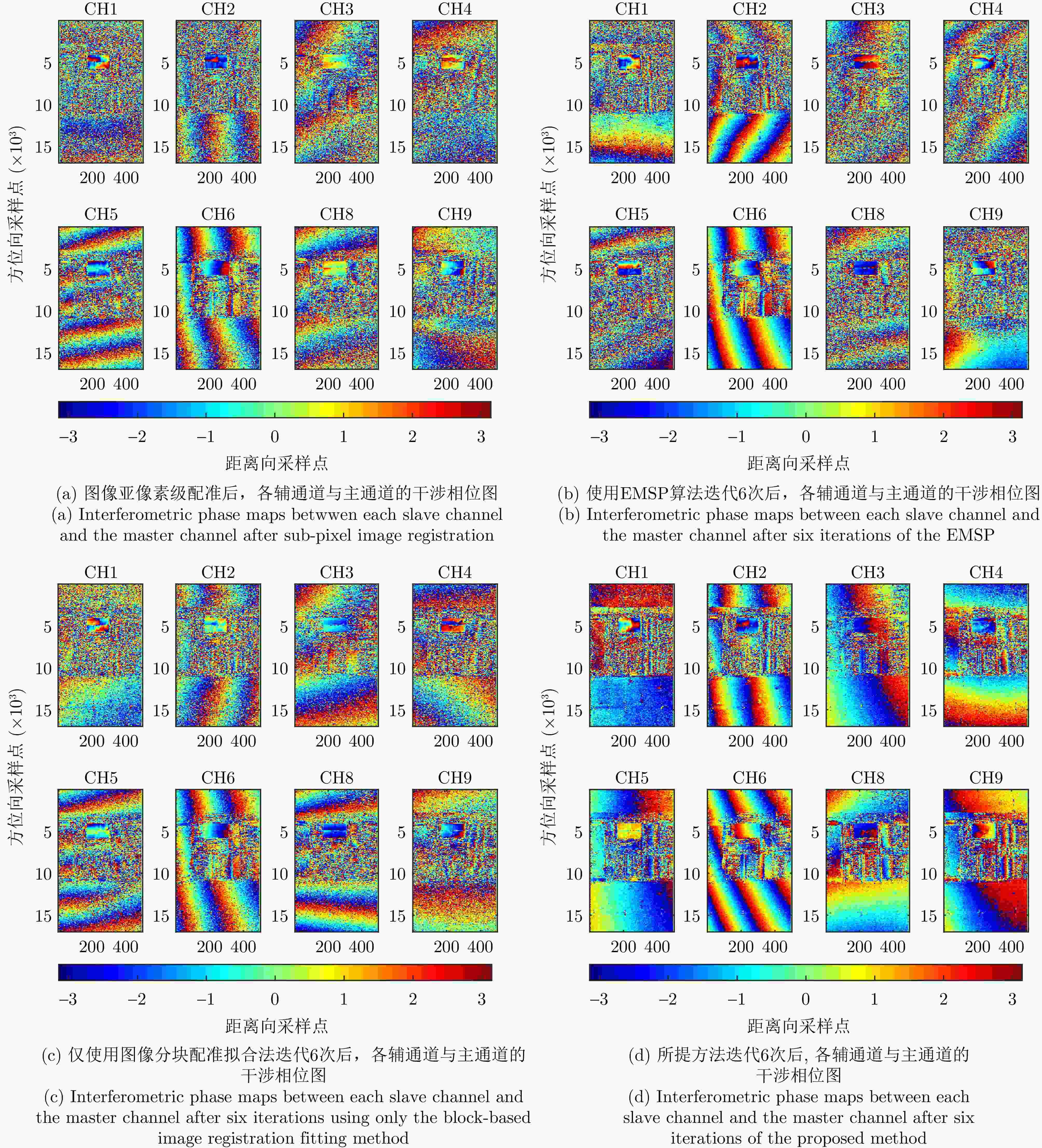 摘要: 轻小型无人机载分布式层析合成孔径雷达(SAR)系统受限于载荷,难以搭载高精度定位定姿系统,且其飞行轨迹易受低空大气湍流影响,导致系统中存在显著的残余时变基线误差,严重降低目标三维重建精度。与飞行高度较高的常规机载重轨三维SAR系统相比,轻小型无人机载分布式层析SAR系统的飞行高度低,对时变基线误差的补偿精度要求更为苛刻。在图像信噪比较低且系统中存在较大的时变基线误差的情况下,现有时变基线估计方法难以获得稳定可靠的估计结果。针对上述问题,该文提出一种基于图像方位偏移量的两步式时变基线误差估计算法。该方法通过分块配准与曲面拟合、子孔径处理两个步骤,依次估计时变基线误差,并采用迭代策略进一步提升估计精度。基于C波段轻小型无人机载分布式层析SAR的实测数据验证结果表明,与EMSP方法相比,所提方法在多数通道上可显著降低子孔径干涉相位差分的均方根值,有效提升通道间相干性,所提方法获得的点云高程向标准差由5.16 m降低至1.33 m,建筑目标的高度重建误差优于0.5 m,验证了所提方法的有效性与优势。Abstract: Small unmanned aerial vehicle (UAV)–borne distributed tomographic synthetic aperture radar (TomoSAR) systems exhibit remarkable residual time-varying baseline errors due to the limited precision of the position and orientation system on small UAV platforms. These errors critically degrade the performance of three-dimensional (3D) target reconstruction. Compared with airborne repeat-pass 3D synthetic aperture radar (SAR), distributed TomoSAR mounted on small UAVs imposes stricter compensation accuracy requirements for time-varying baseline errors because of the altitude constraints of the carrying platform. Under the conditions of low signal-to-noise ratio and substantial time-varying baseline errors, existing estimation methods often fail to provide stable and reliable results. In this paper, a two-step time-varying baseline error estimation method based on image azimuth displacement is proposed. The method sequentially estimates the low-frequency component through the co-registration of the master and slave images and the high-frequency component using a multisquint algorithm. Iterative refinement is applied to enhance estimation accuracy. The experimental results obtained from real C-band small UAV-borne distributed TomoSAR data demonstrate that, compared with the enhanced multisquint processing method, the proposed method considerably reduces the root mean square of differential interferometric phases across most channels, thereby effectively improving interchannel coherence. In addition, the elevation-direction standard deviation of the reconstructed point cloud is reduced from 5.16 to 1.33 m, and the height reconstruction error of building targets is less than 0.5 m, validating the effectiveness and superiority of the proposed method.