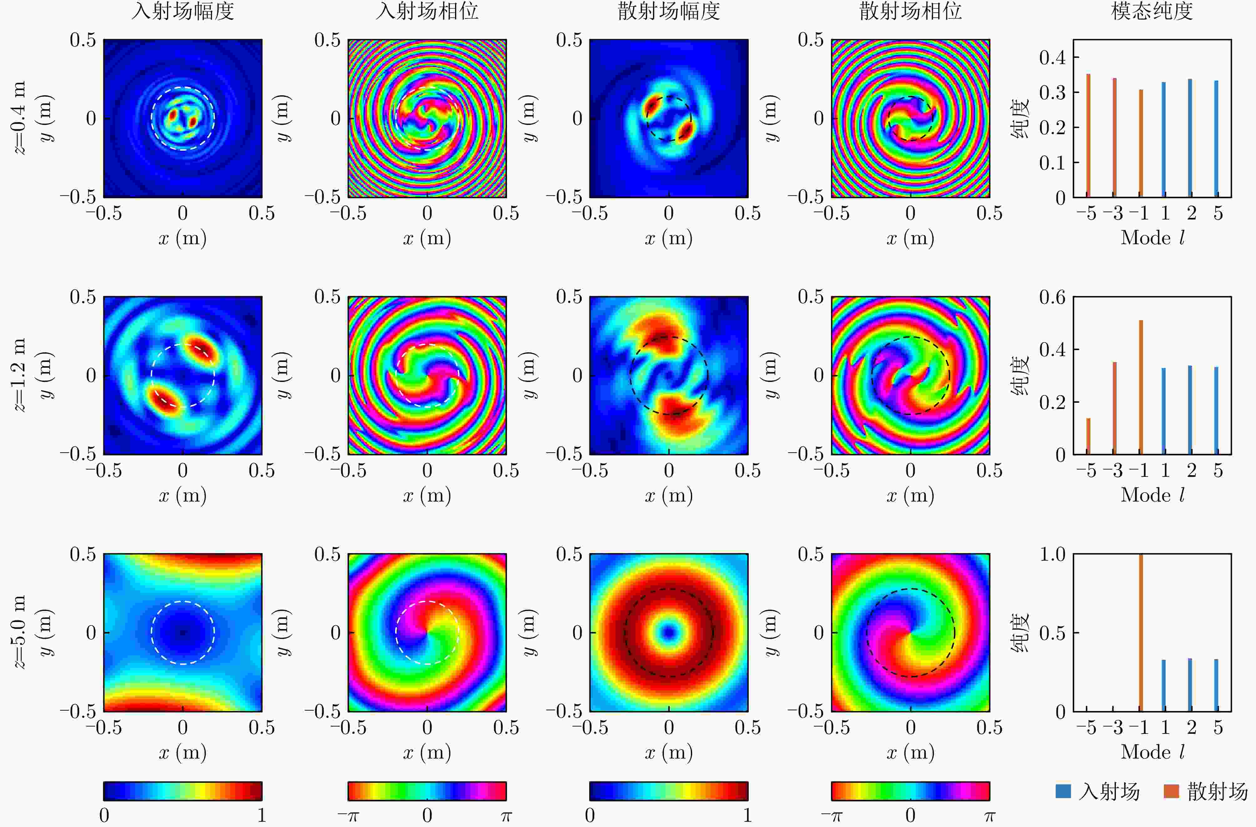 0.0207 ,散射场幅度分布的均方根误差为0.054,验证了理论的准确性。该研究揭示了多模态涡旋波与目标的相互作用机理,可为未来多模态涡旋雷达系统的目标识别与成像设计提供理论支撑。Abstract: Multimode vortex electromagnetic waves, which carry mutually orthogonal orbital angular momentum (OAM), have attracted extensive research interest in communications and radar systems due to their unique amplitude and phase characteristics. This study investigates the near-field scattering characteristics of metallic plate targets under the incidence of multimode vortex electromagnetic waves. First, an incidence model for multimode vortex waves is constructed based on annular aperture radiation theory, and the near-field scattering field of a perfect electric conductor circular plate is derived using the physical optics method. Subsequently, the effects of target longitudinal distance, transverse displacement, geometric features, and mode combination parameters (initial mode, mode interval, and number of modes) on the scattering characteristics are quantitatively analyzed, and the multimode near-field OAM radar cross section is calculated. The research results demonstrate that compared to plane wave incidence, the coherent superposition of multimode beams provides richer spatial feature information. The target’s efficiency in intercepting high-order mode energy significantly decreases with increasing propagation distance. Although the transverse displacement of the target induces substantial mode spectrum crosstalk, the original scattering features can be effectively reconstructed through vector superposition of scattering fields at symmetrical positions by exploiting spatial complementarity. Furthermore, the geometric shape of the target produces fine modulation on the scattering field when its size is comparable to that of the main lobe, and this modulation effect gradually diminishes as the target size increases. The theoretical calculations closely align with the simulation results, showing a main mode purity deviation of less than0.0207 and a root mean square error of 0.054 in the scattering field amplitude distribution, thus verifying the accuracy of the theory. This study reveals the interaction mechanism between multimode vortex waves and targets, providing theoretical support for target recognition and imaging system design in future multimode vortex radar systems. -