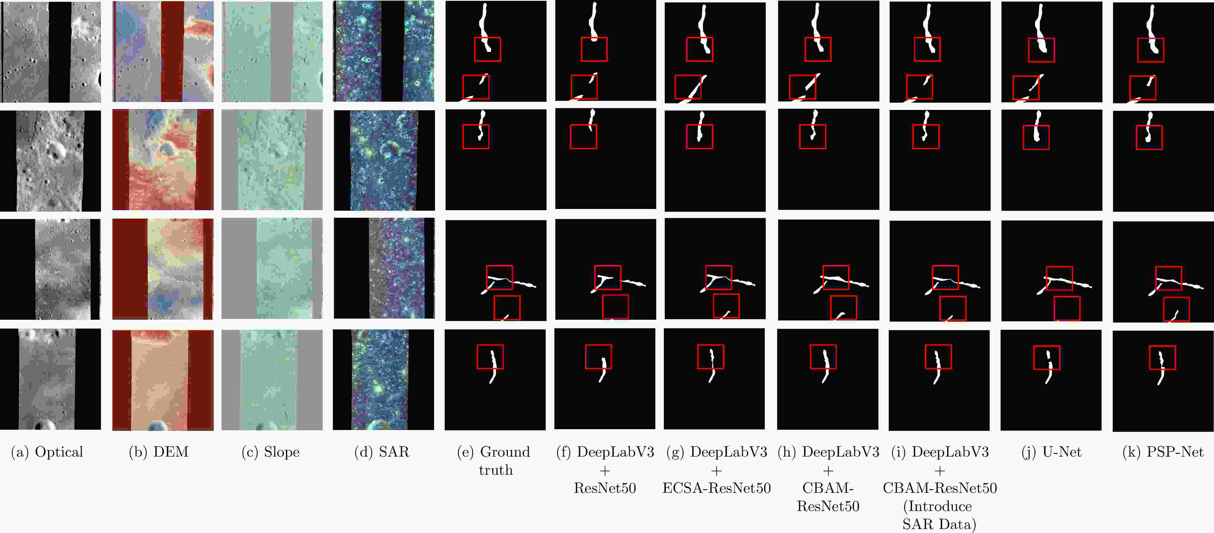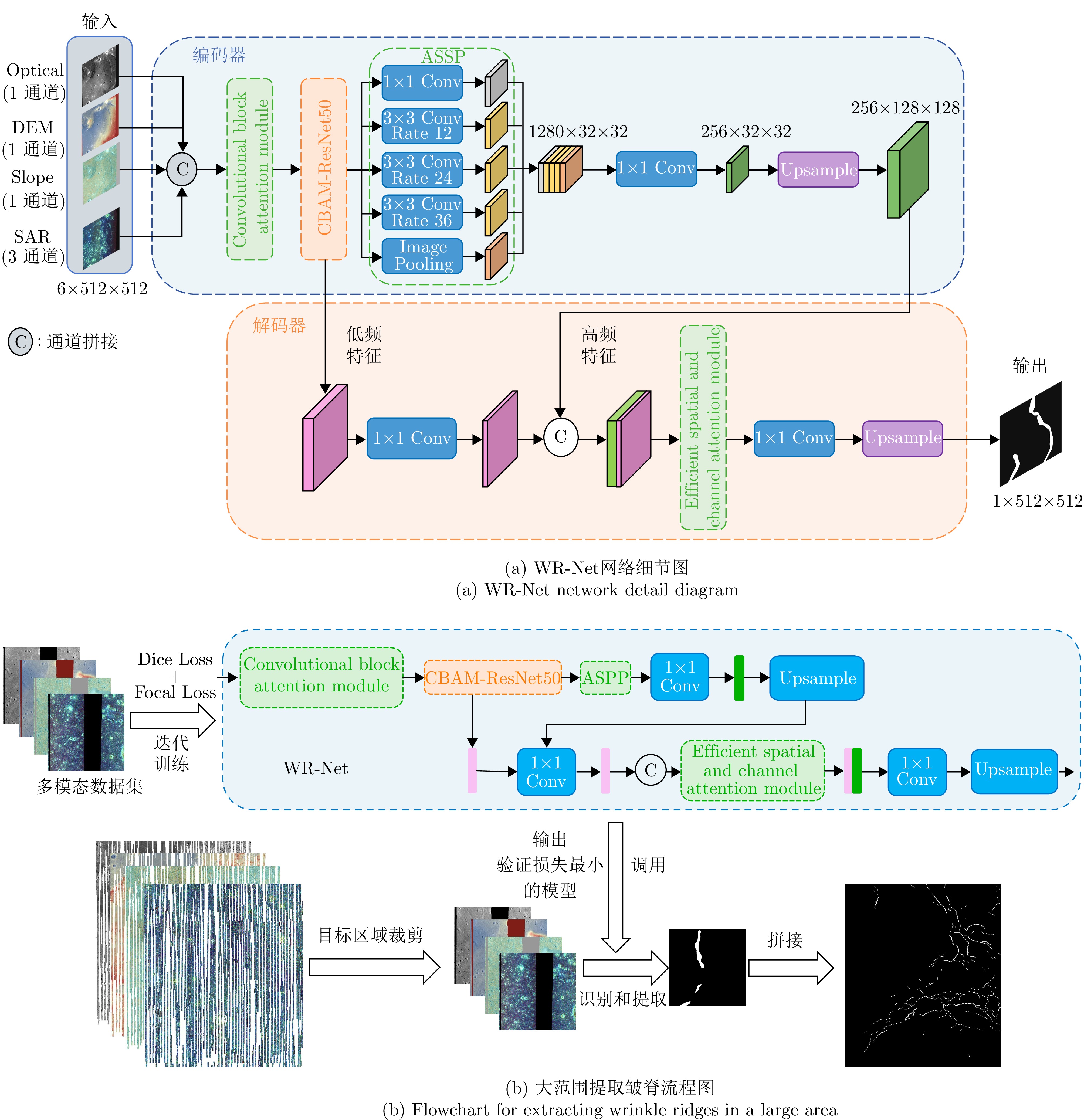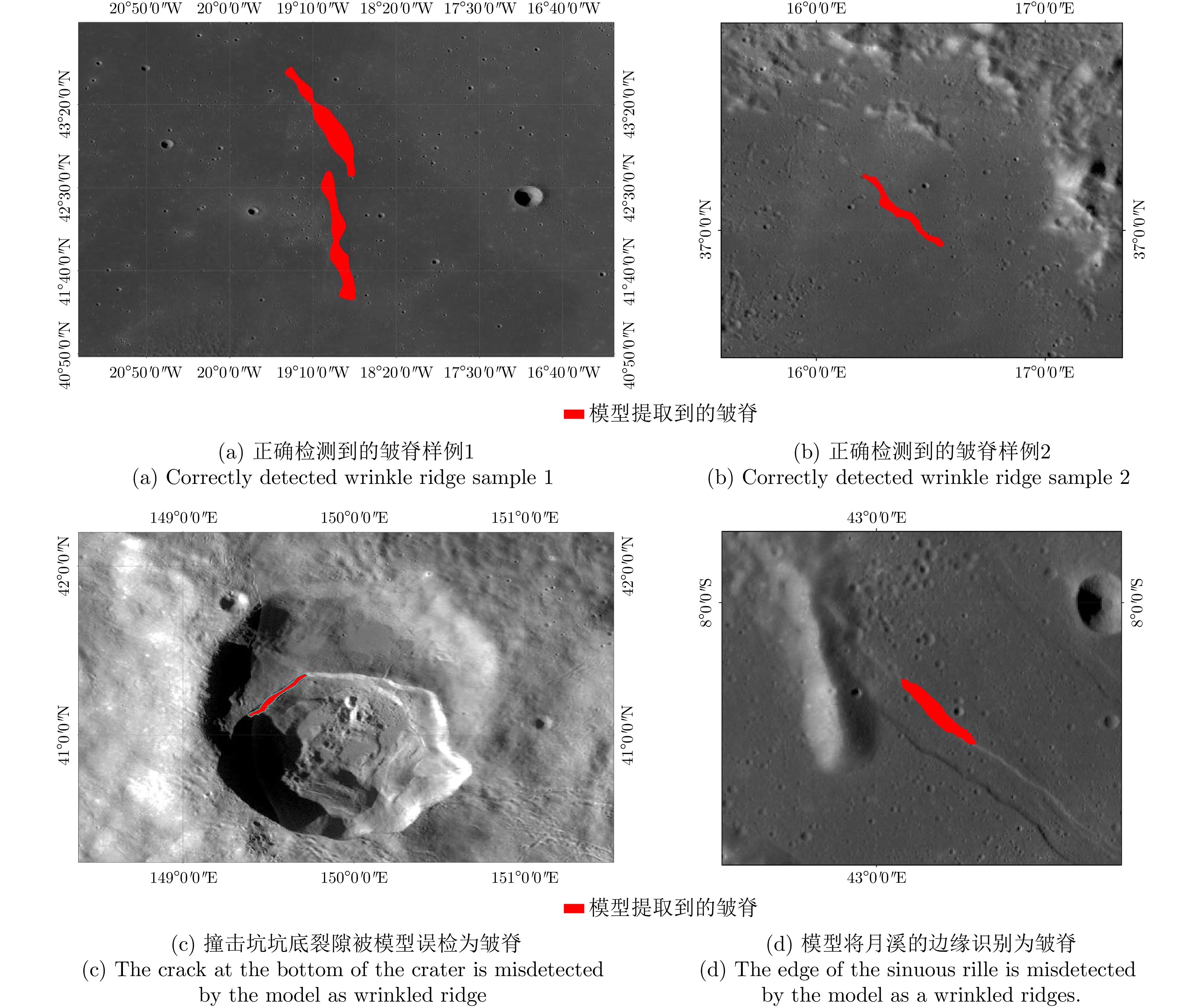 摘要: 月球皱脊是广泛分布于月表月海区域的重要线状构造,对研究月球应力场演化和火山活动历史具有重要意义。传统的皱脊识别与编目主要依赖人工解译,效率低且主观性强。该文提出了一种基于多模态语义分割的皱脊自动提取方法,通过构建高质量的皱脊遥感图像标注数据集,并引入合成孔径雷达(SAR)数据,通过迭代训练构建了基于DeepLabv3+的多模态语义分割网络WR-Net。该网络引入动态融合模块和注意力机制,有效优化了多模态图像的特征提取与融合过程,显著提升了模型的稳健性与精度。在多模态皱脊测试集上,WR-Net取得了优异的性能(Precision=95.516%, Recall=89.963%, F1-Score=92.657%, MIoU=92.944%)。进一步地,该团队利用WR-Net完成了月球南纬70度至北纬70度范围内皱脊的自动识别与提取,并对结果进行了编目与统计。该文提出的方法不仅适用于皱脊的识别,也为月球及其他行星体上类似线状结构的自动提取提供了有效范式。Abstract: Lunar wrinkle ridges are important linear structures that are widely distributed in the mare regions on the lunar surface and are of great importance for studying the evolution of the lunar stress field and the history of volcanic activities. Traditional lunar wrinkle ridge recognition and cataloging mainly rely on manual interpretation, which is inefficient and subjective. In this paper, an automatic lunar wrinkle ridge extraction method based on multimodal semantic segmentation is proposed. By constructing a high-quality lunar wrinkle ridge remote sensing image annotation dataset and introducing synthetic aperture radar data, a DeepLabv3+-based multimodal semantic segmentation network (WR-Net) is constructed through iterative training. A dynamic fusion module and an attention mechanism were introduced into WR-Net, which effectively optimized the feature extraction and fusion process of multimodal images and markedly improved the robustness and accuracy of the model. On the multimodal lunar wrinkle ridge test set, WR-Net achieved excellent performance (Precision = 95.516%, Recall = 89.963%, F1-Score = 92.657%, and MIoU = 92.944%). Furthermore, we used WR-Net to automatically identify and extract the lunar wrinkle ridges from the 70° south latitude to the 70° north latitude of the moon and cataloged and statistically analyzed the results. The proposed method is suitable for the recognition of lunar wrinkle ridges and provides an effective paradigm for the automatic extraction of similar linear structures on the moon and other planetary bodies.