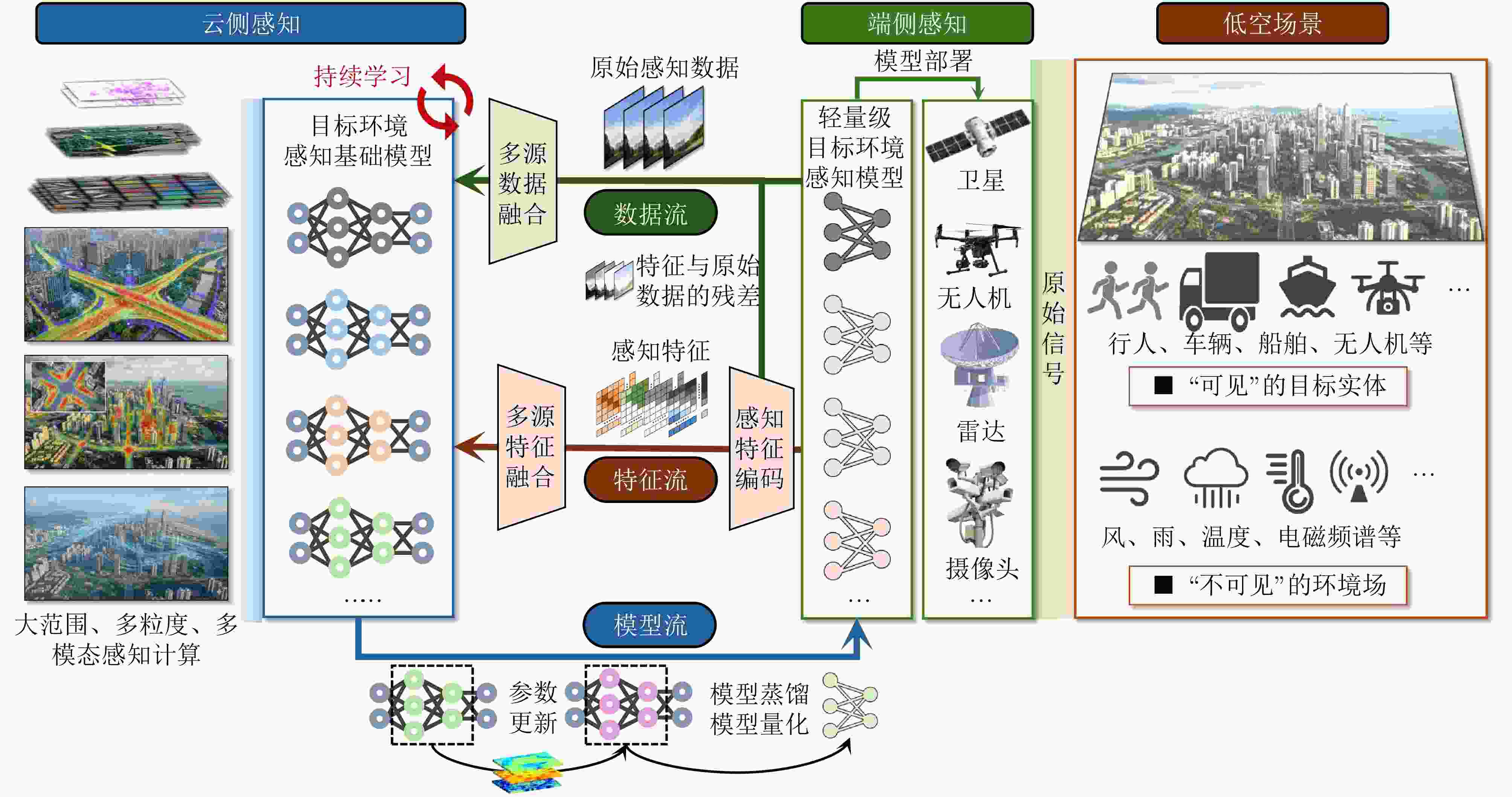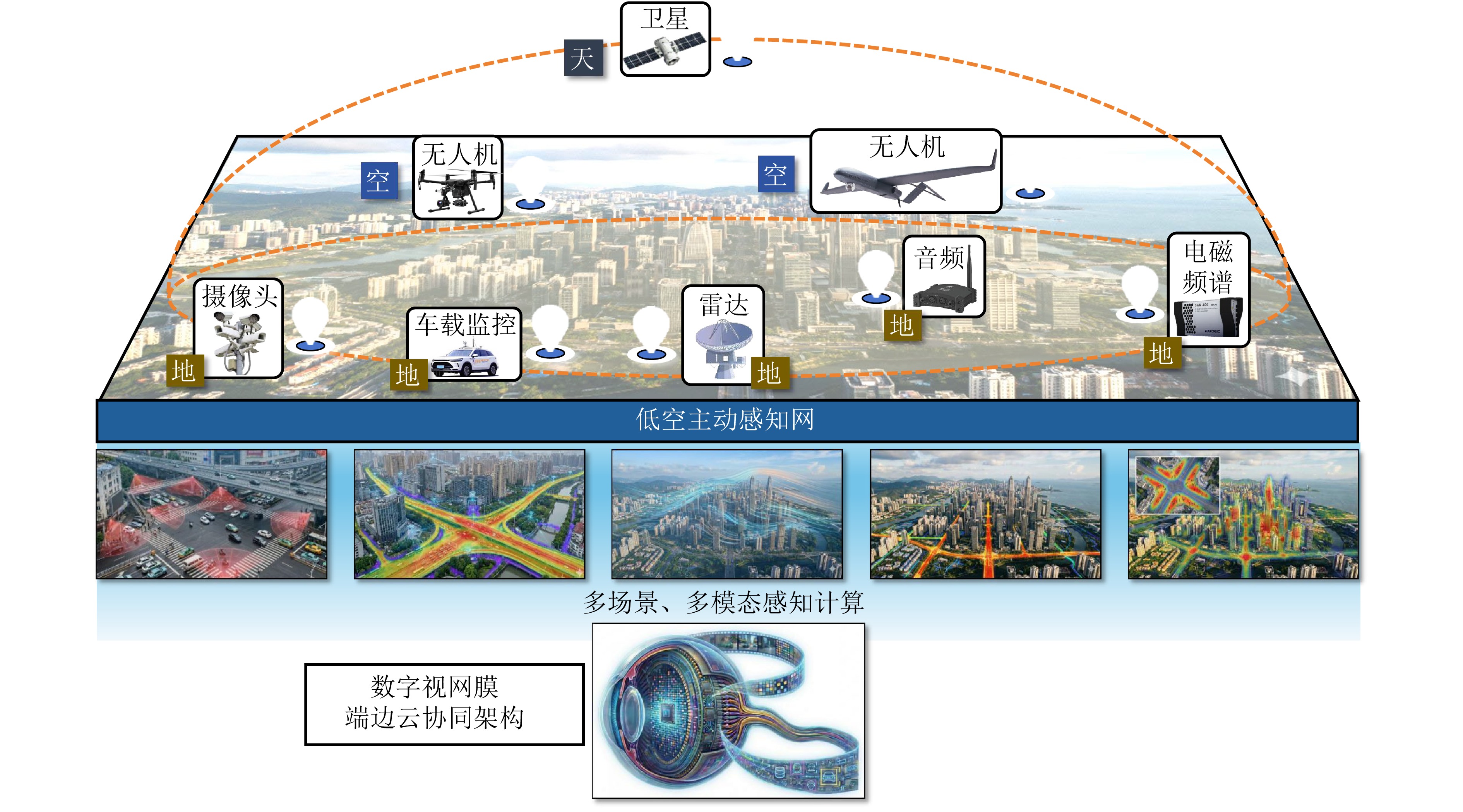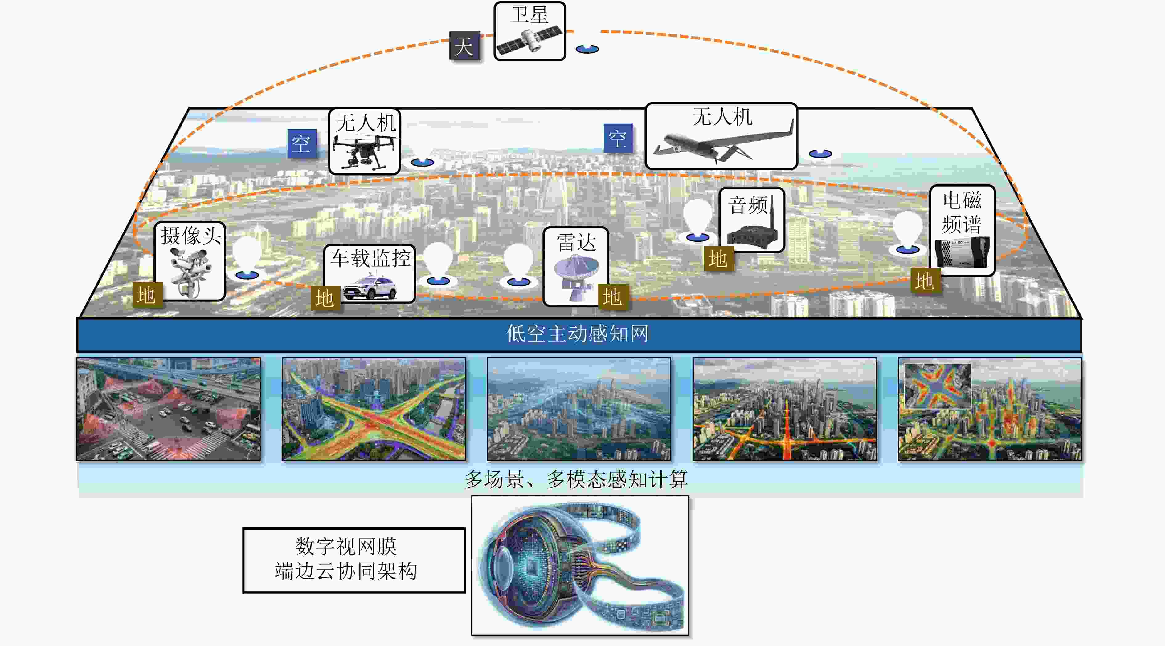 摘要: 低空智能感知技术旨在将低空目标与环境的物理空间转化为可计算的数字空间,是支撑低空经济活动安全有序开展的基础。该文系统分析了当前低空场景下大规模视觉感知、目标感知以及环境感知等技术的发展现状与面临的挑战。针对现有挑战,该文提出了基于数字视网膜端边云协同架构的低空主动感知网,并从整体网络架构、云侧基础模型底座、端侧目标与环境感知技术等维度,详细阐述了其核心机制与关键技术。最后,通过初步实验,验证了该文所提感知网络在空地带宽受限条件下实现高效协同感知计算的有效性。Abstract: Low-altitude perception technology aims to transform the physical space of low-altitude targets and environments into a computable digital space, providing a foundation for the safe and organized development of low-altitude economic activities. This paper systematically examines the current progress and challenges of technologies such as large-scale visual perception, object detection, and environmental sensing in low-altitude scenarios. To address these challenges, we introduce a low-altitude active perception network based on the digital retina featuring a collaborative architecture that integrates end, edge, and cloud computing. The key mechanisms and methods are outlined across various aspects, including the overall network structure, cloud-based foundation models, and end-based object and environmental perception technologies. Early applications and experimental results confirm the effectiveness of the proposed network in enabling efficient joint perception under bandwidth limitations.
