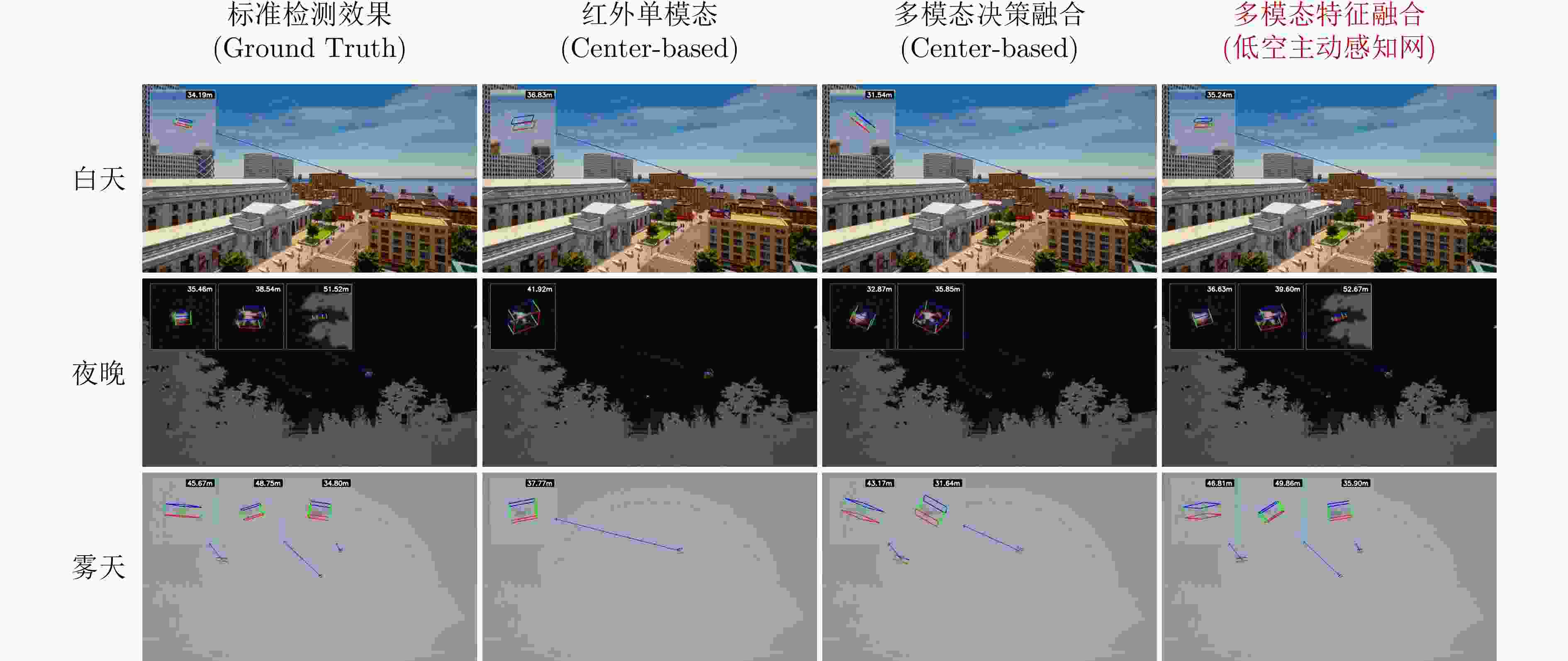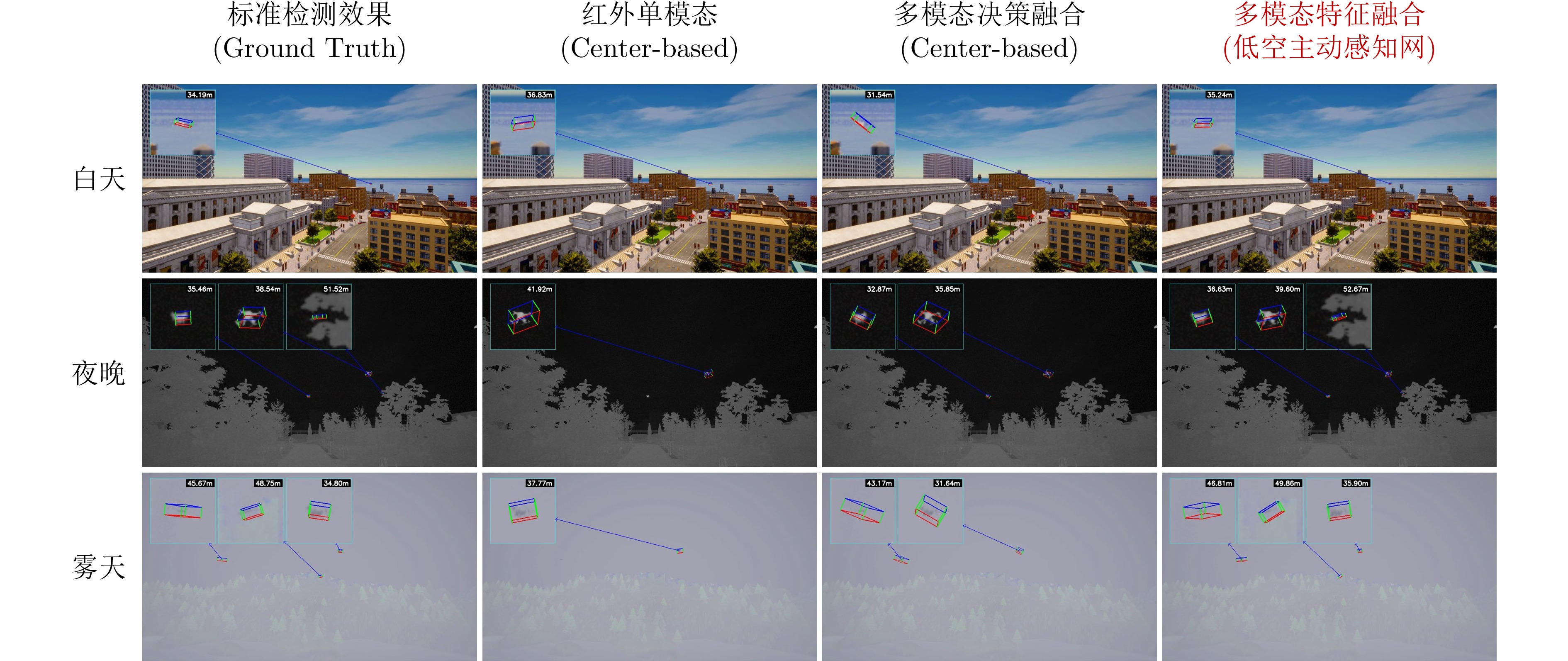 方法 模态与融合策略 旋转误差(°) 位置误差 (m) 尺寸误差(m) 3维目标检测精度(AP) YOLO-6D RGB-only(单模态) 26.47 7.21 0.43 11.78 YOLO-6D IR-only(单模态) 24.15 6.83 0.41 12.26 YOLO-6D 决策级融合 (Late Fusion) 22.73 5.95 0.40 13.89 Center-based RGB-only(单模态) 21.65 6.48 0.42 13.07 Center-based IR-only(单模态) 19.29 5.76 0.40 14.64 Center-based 决策级融合 (Late Fusion) 17.84 4.92 0.39 17.38 本文所提出的低空感知网方案 几何引导特征融合 10.57 3.64 0.35 26.72 注:加粗数值表示最优。 -