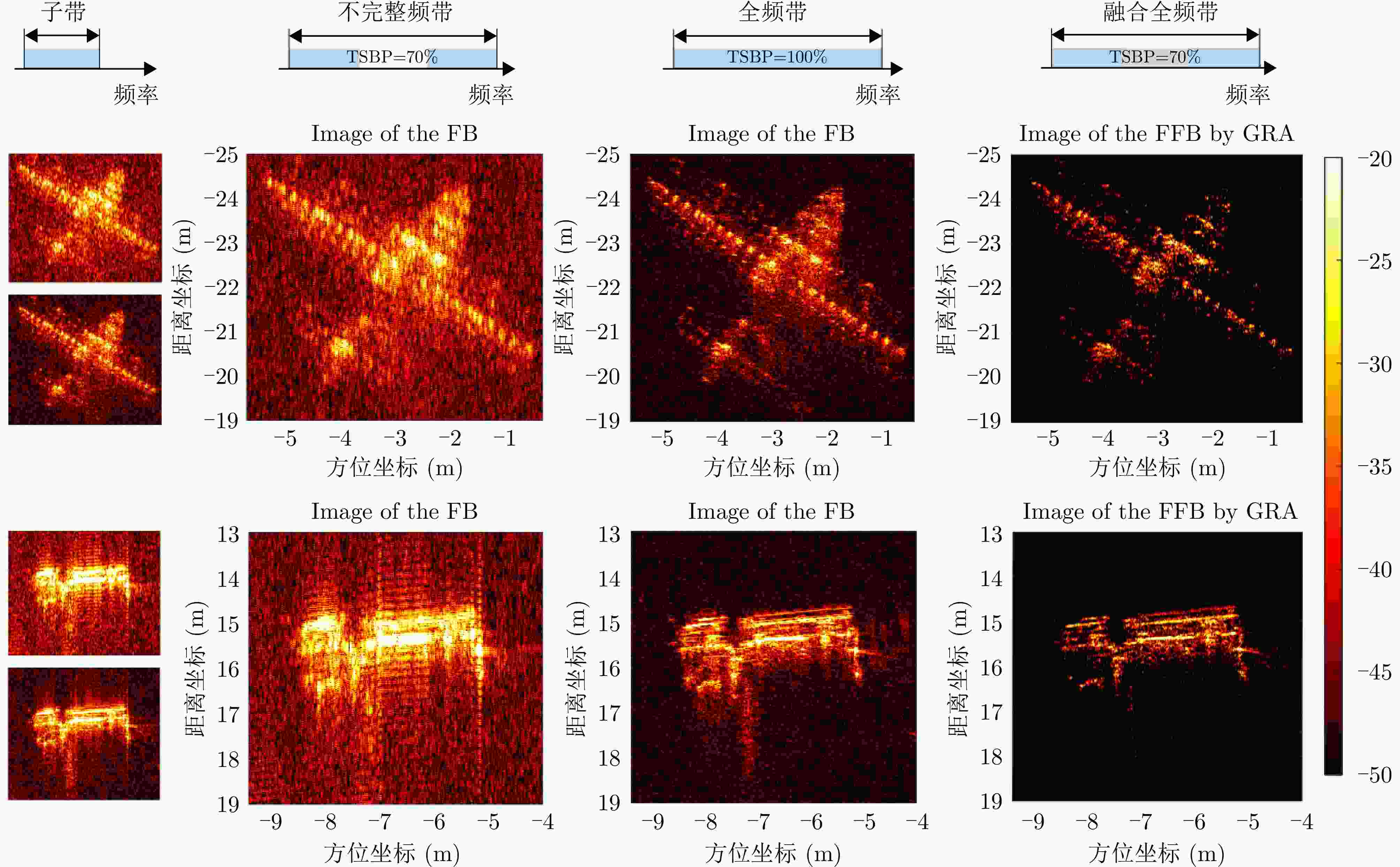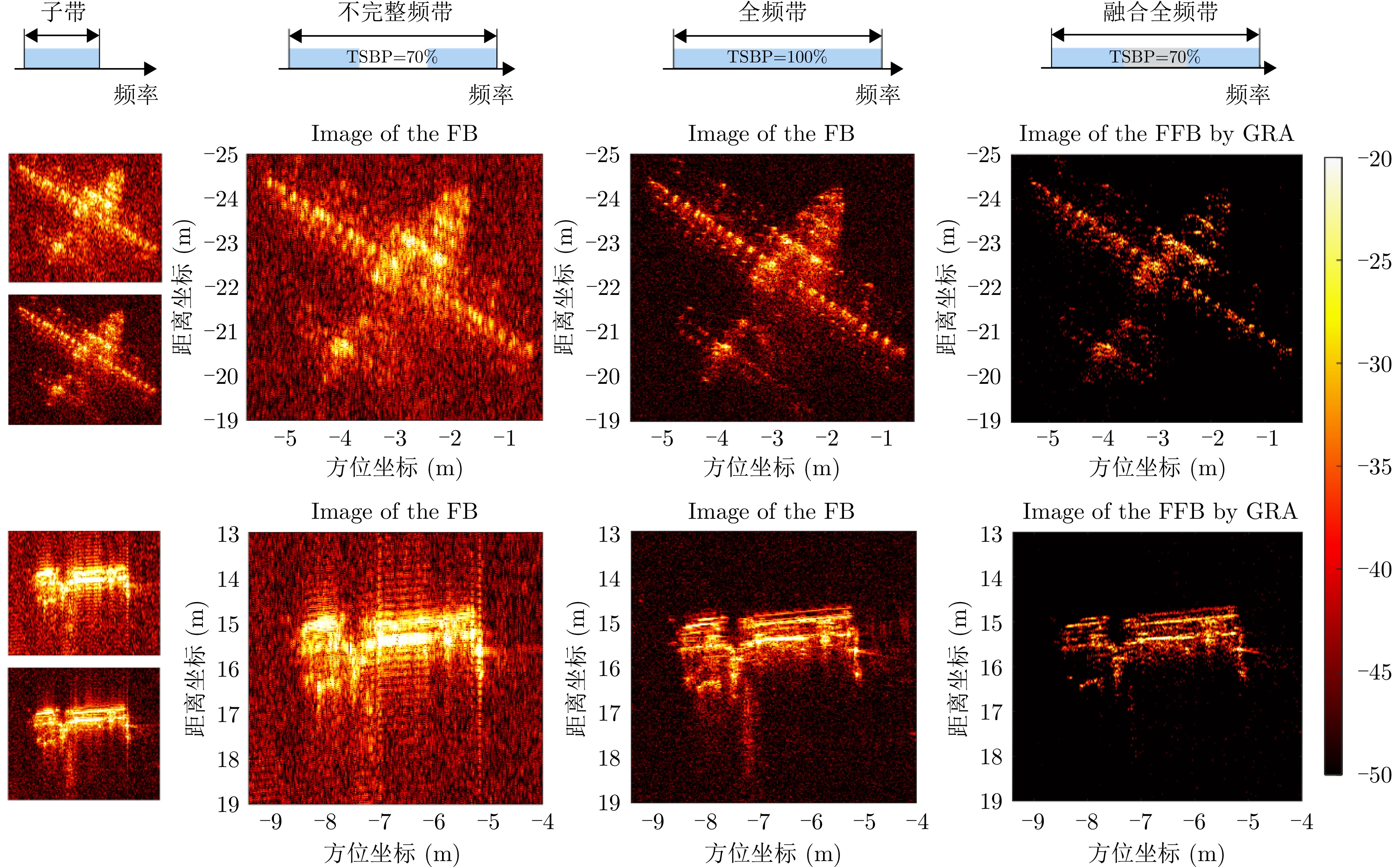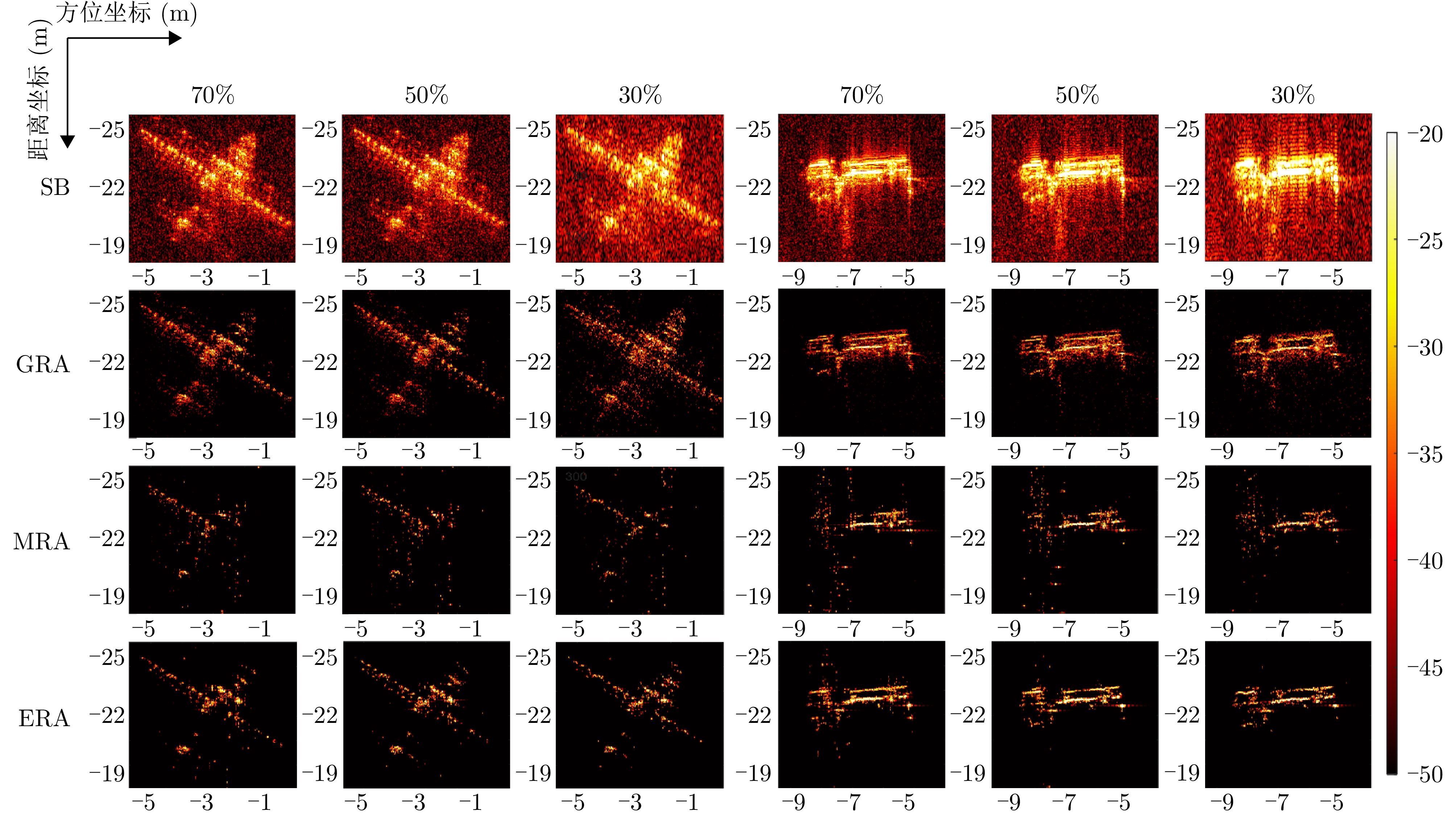 参数名 参数值 频率范围 12.2–18.2 GHz 去斜采样率 312.5 MHz 脉冲重复时间 180 μs 中心视角 60° 最远作用距离 1.4 km 表 3 不同TSBP下的图像质量参数Tab 3: Parameters of image quality under different TSBPs
