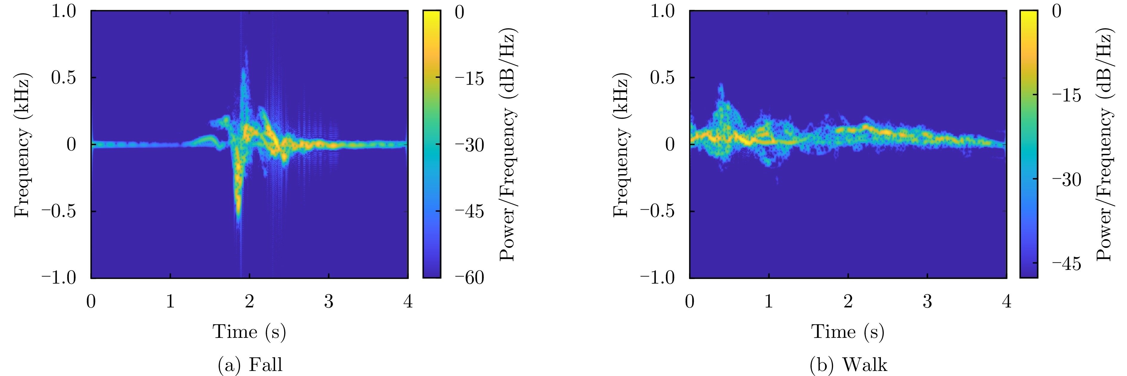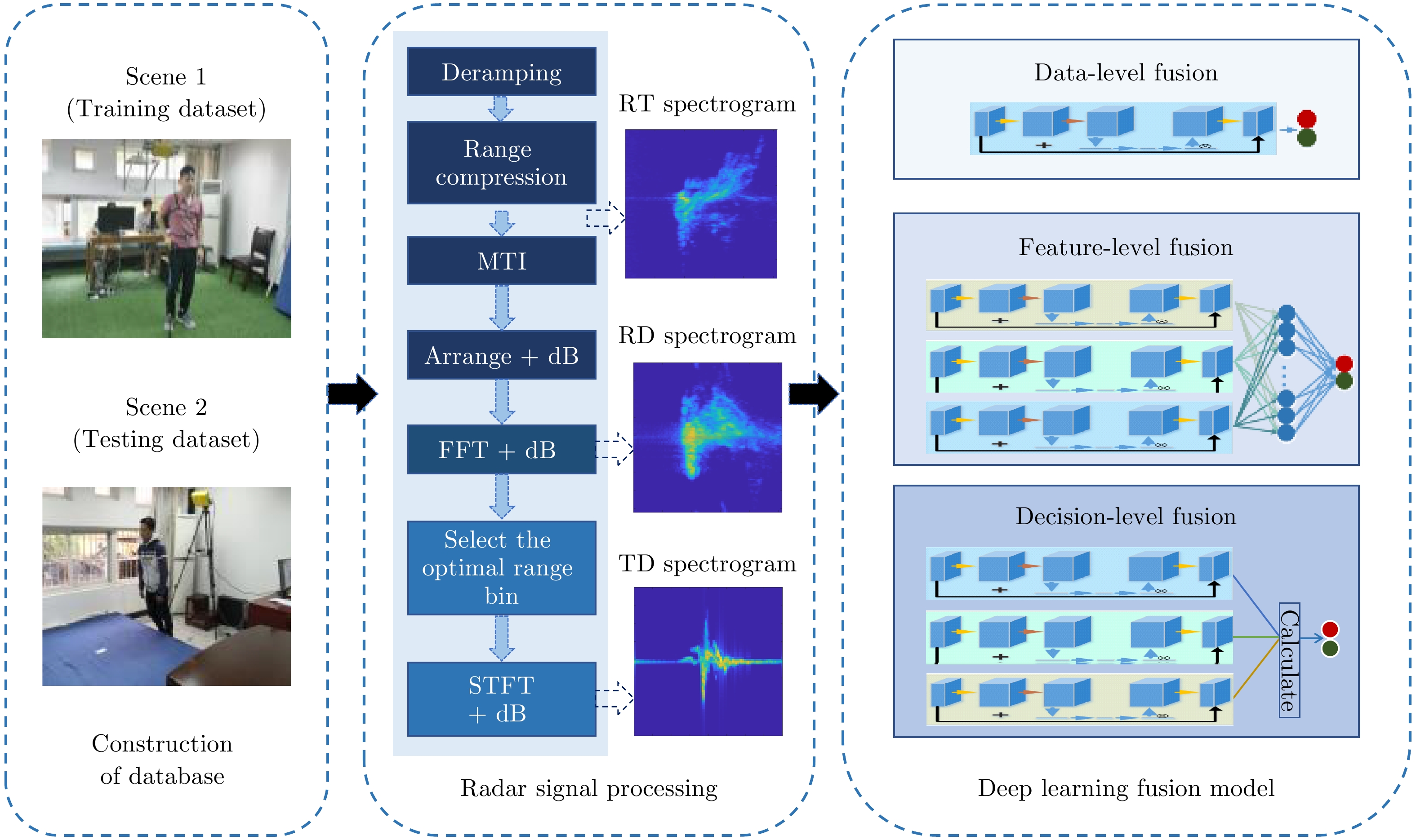 0.9956 ,在新场景下测试的准确率为0.9778 ,具有良好的泛化能力。Abstract: Compared with narrowband Doppler radar, ultrawideband radar can simultaneously acquire the range and Doppler information of targets, which is more beneficial for behavior recognition. To improve the recognition performance of fall behavior, frequency-modulated continuous-wave ultrawideband (UWB) radar was applied to collect daily behavior and fall data of 36 subjects in two real indoor complex scenes, and a multi-scene fall detection dataset was established with various action types; the range-time, time-Doppler, and range-Doppler spectrograms of the subjects were obtained after preprocessing radar data; based on the MobileNet-V3 lightweight network, three types of deep learning fusion networks at the data level, feature level, and decision level were designed for the radar spectrograms, respectively. A statistical analysis shows that the decision level fusion method proposed in this paper can improve fall detection performance compared with those using one type of spectrogram, the data level and the feature level fusion methods (all P values by significance test method are less than 0.003). The accuracies of 5-fold cross-validation and testing in the new scene of the decision level fusion method are0.9956 and0.9778 , respectively, which indicates the good generalization ability of the proposed method.-