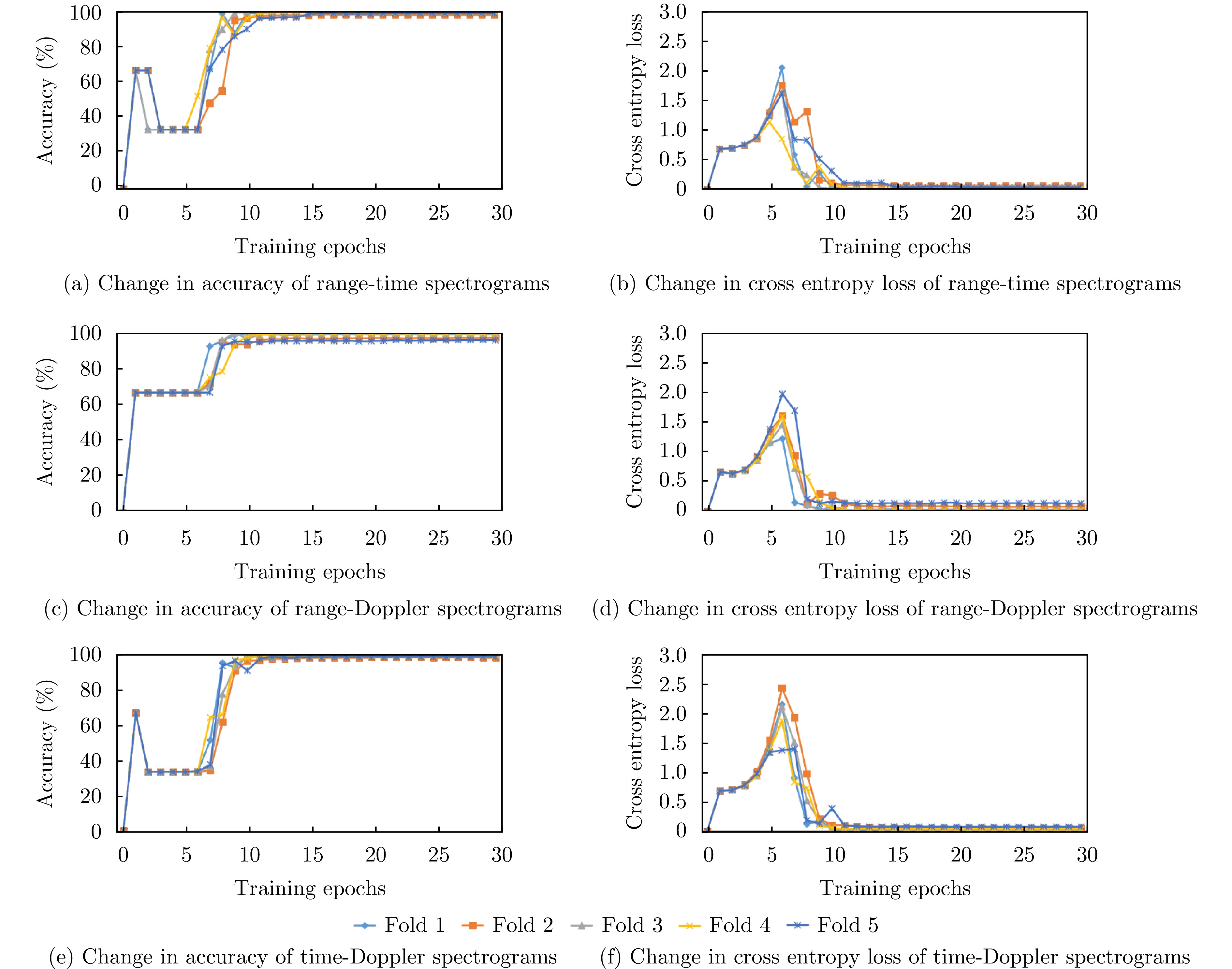 Network type Training time (h) Network size (MB) Average testing time (s) MobileNet-V3 (range-time spectrograms) 0.2833 5.9082 0.0035 Data-level 2.3500 5.9092 0.0030 Feature-level 1.5447 11.9072 0.0046 Decision-level 0.8500 17.7246 0.1030 表 2 Comparison of evaluation indicators for 5-fold cross-validation of fall detection (Scene 1)
