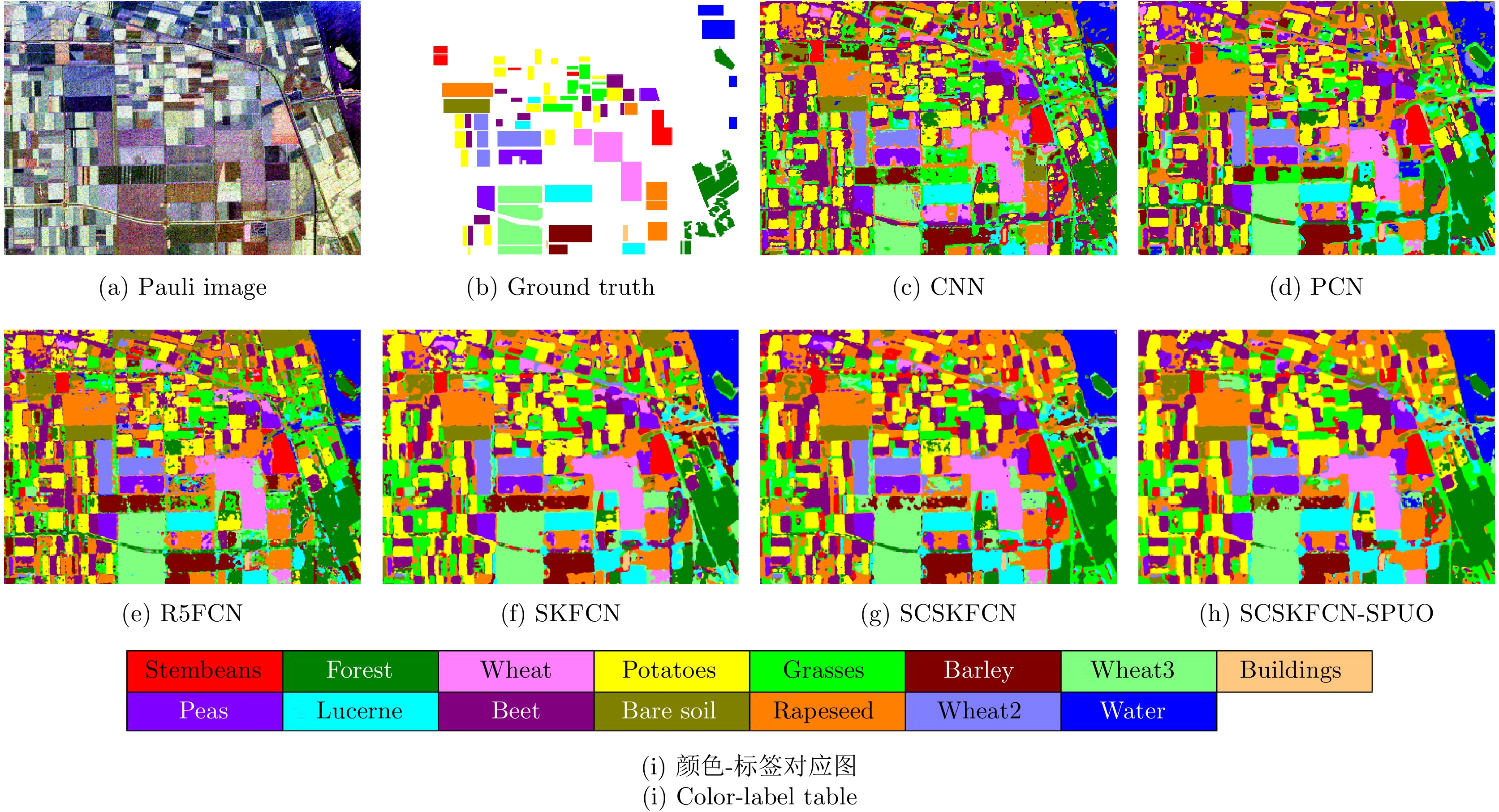 Method 1 2 3 4 5 6 7 8 9 10 CNN 99.30 93.36 92.22 91.59 93.56 92.79 95.73 97.93 97.54 98.59 PCN 92.11 95.76 98.71 96.49 91.07 96.27 97.52 96.87 96.13 92.23 R5FCN 99.86 98.32 99.32 96.27 93.03 92.12 96.00 97.45 98.15 98.39 SKFCN 99.89 97.39 99.60 98.55 95.42 97.28 96.81 98.80 97.28 98.98 SCSKFCN 99.96 98.60 99.75 98.74 96.47 97.60 97.73 98.99 97.89 98.79 Proposed 99.98 98.87 99.91 99.44 98.93 98.07 99.03 99.78 97.45 99.17 Method 11 12 13 14 15 OA Kappa Training (s) Test (s) CNN 92.25 96.69 98.84 96.78 65.42 95.19 94.76 247.7 3.1 PCN 96.62 96.32 99.05 98.06 81.26 96.36 96.04 216.8 1.2 R5FCN 97.12 97.68 99.61 99.08 86.12 97.41 97.18 89.3 0.9 SKFCN 99.15 99.08 99.61 99.46 83.77 98.46 98.32 105.6 1.0 SCSKFCN 99.47 99.43 99.64 99.73 82.65 98.80 98.70 112.4 1.1 Proposed 99.56 99.68 99.89 99.50 90.51 99.24 99.18 (19.1)+132.8 1.1 *注:Water(1); Stembeans(2); Forest(3); Potatoes(4); Grasses(5); Beet(6); Rapeseed(7); Peas(8); Lucerne(9); Bare soil(10); Wheat2(11); Wheat1(12); Wheat3(13); Barley(14); Building(15); Proposed表示SCSKFCN-SPUO方法 表 2 Oberpfaffenhofen图像分类结果表(%)