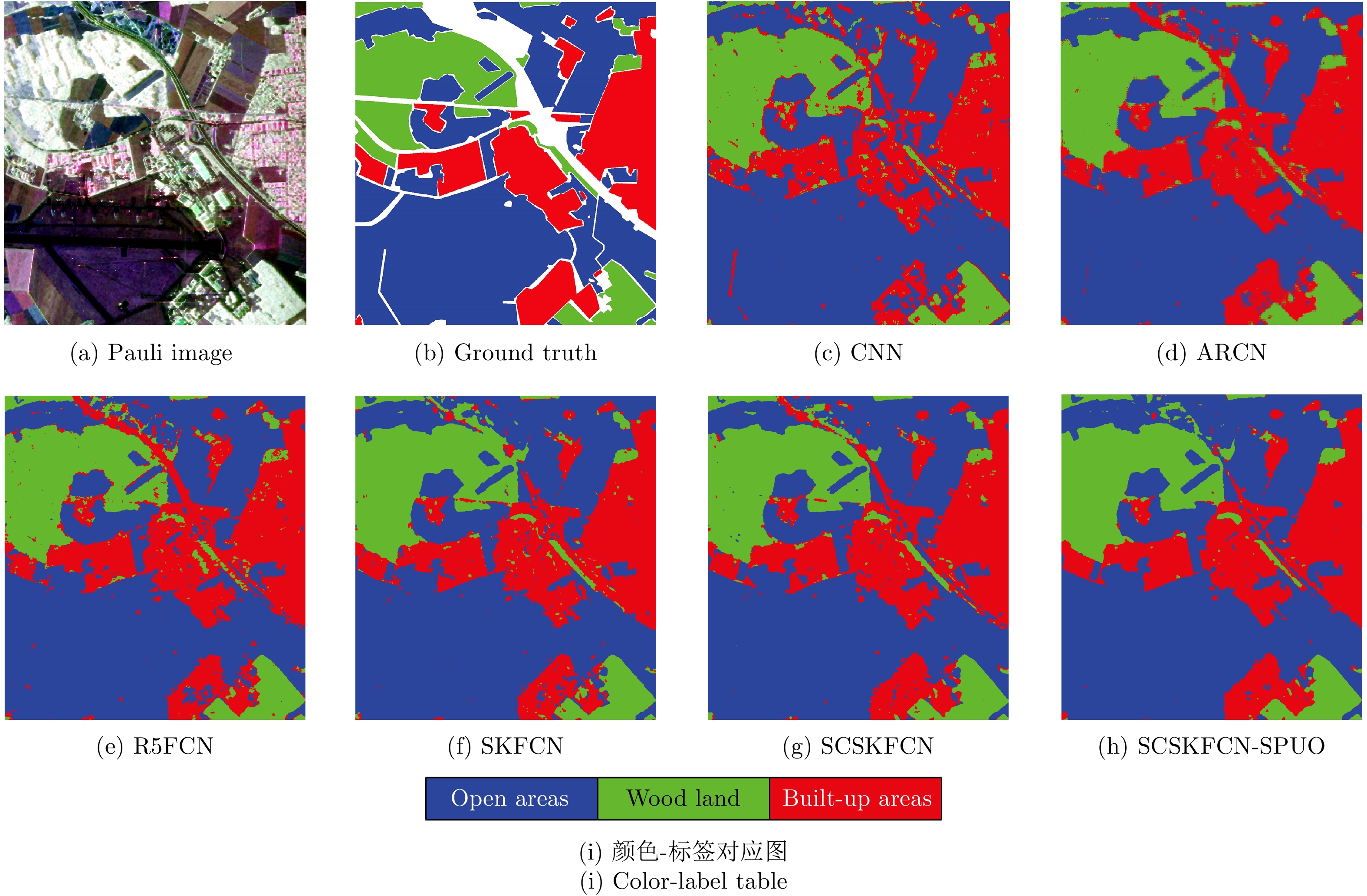 Class CNN ARCN R5FCN SKFCN SCSKFCN Proposed Wood land 95.02 96.13 94.97 96.25 96.68 97.18 Open areas 97.17 97.32 97.51 97.76 97.99 98.80 Built-up areas 86.42 93.92 90.47 94.27 94.64 94.86 OA 94.09 96.25 95.27 96.60 96.90 97.51 Kappa 89.88 93.64 91.95 94.23 94.74 95.76 Training (s) 225.9 189.6 120.1 137.2 159.2 (50.3)+173.6 Test (s) 4.6 1.6 1.5 1.7 1.9 1.9 *注:Proposed表示SCSKFCN-SPUO方法 -