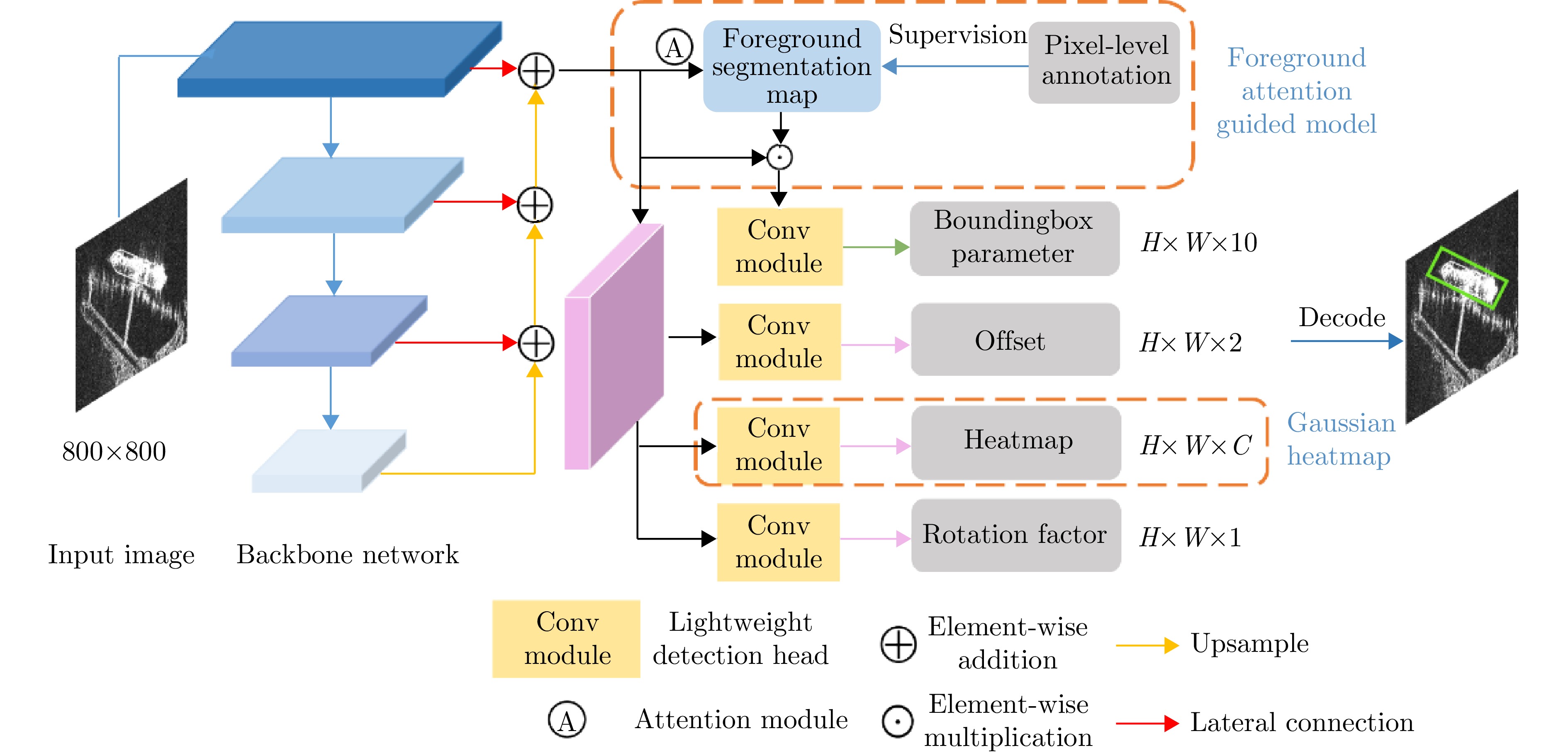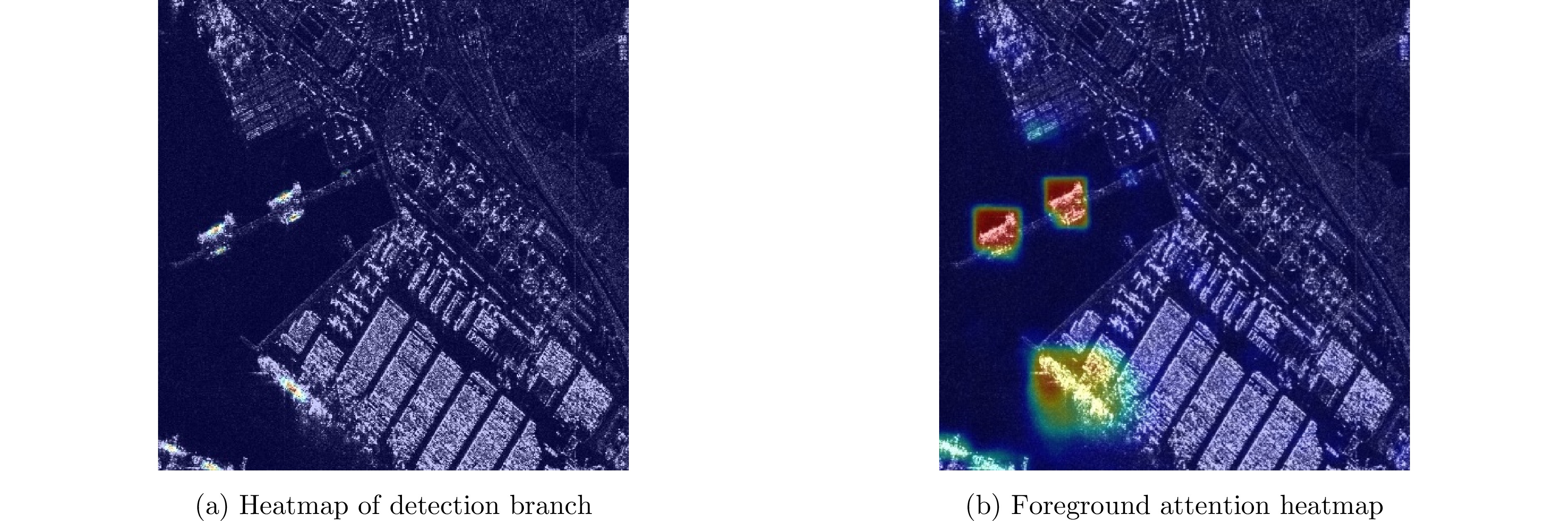 • 摘要: 基于有向边界框的合成孔径雷达(SAR)舰船目标检测器能输出精准的边界框,但仍存在模型计算复杂度高、推理速度慢、存储消耗大等问题,导致其难以在星载平台上部署。基于此该文提出了结合特征图和检测头分支知识蒸馏的无锚框轻量化旋转检测方法。首先,结合目标的长宽比和方向角信息提出改进高斯核,使生成的热度图能更好地刻画目标形状。然后在检测器预测头部引入前景区域增强分支,使网络更关注前景特征且抑制背景杂波的干扰。在训练轻量化网络时,将像素点间的相似度构建为热度图蒸馏知识。为解决特征蒸馏中正负样本不平衡问题,将前景注意力区域作为掩模引导网络蒸馏与目标相关的特征。另外,该文提出全局语义模块对像素进行上下文信息建模,能够结合背景知识加强目标精确表征。基于HRSID数据集的实验结果表明所提方法在模型参数仅有9.07 M的轻量化条件下,mAP能达到80.71%,且检测帧率满足实时应用需求。