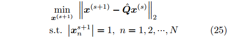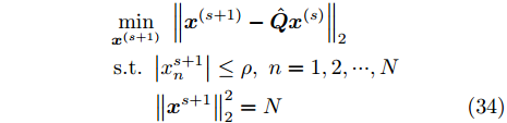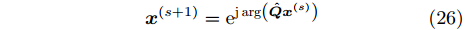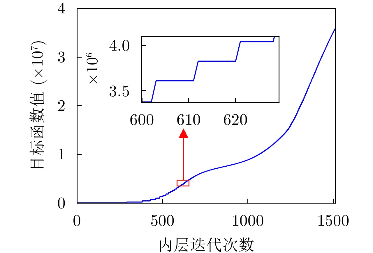 ${{\mathcal{M}}}$不唯一,$k = k + 1$,重复步骤23 if $\forall m \in {{\mathcal{M}}}$, $ x_m^{(s)} = 0 $ do 4 if $m \in {{\mathcal{M}}}$ do 5 $x{_m^{(s + 1)} } = \sqrt {\left( {E - k{\xi ^2} } \right)/\left( {N - k} \right)}$ 6 else do 7 $x_m^{{(s + 1)} } = \xi { {\rm{e} }^{ {\text{j} }\arg x_m^{{(s)} } } }$ 8 return ${{\boldsymbol{x}}^{(s + 1)}}$ 9 else do