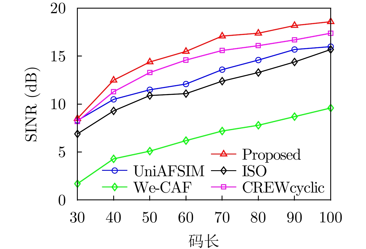 10 $\varpi = \sqrt {\left( {E - k{\xi ^2} } \right)/\sum\limits_{m \in { {\mathcal{M} } } } { { {\left| {x_m^{{(s)} } } \right|}^2} } }$11 if $\forall m \in {{\mathcal{M}}}$, $\varpi x_m^{{(s)} } > \xi$ do 12 $k = k + 1$,返回步骤2 13 else do 14 if $m \in {{\mathcal{M}}}$ do 15 $x{_m^{(s + 1)} } = \varpi x_m^{(s)}$ 16 else do 17 $x_m^{{(s + 1)} } = \xi { {\rm{e} }^{ {\text{j} }\arg x_m^{{(s)} } } }$ 18 end 19 end 20 end 21 return ${{\boldsymbol{x}}^{(s + 1)}}$ 表 1 不同码长下5种算法性能统计