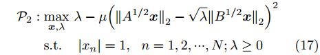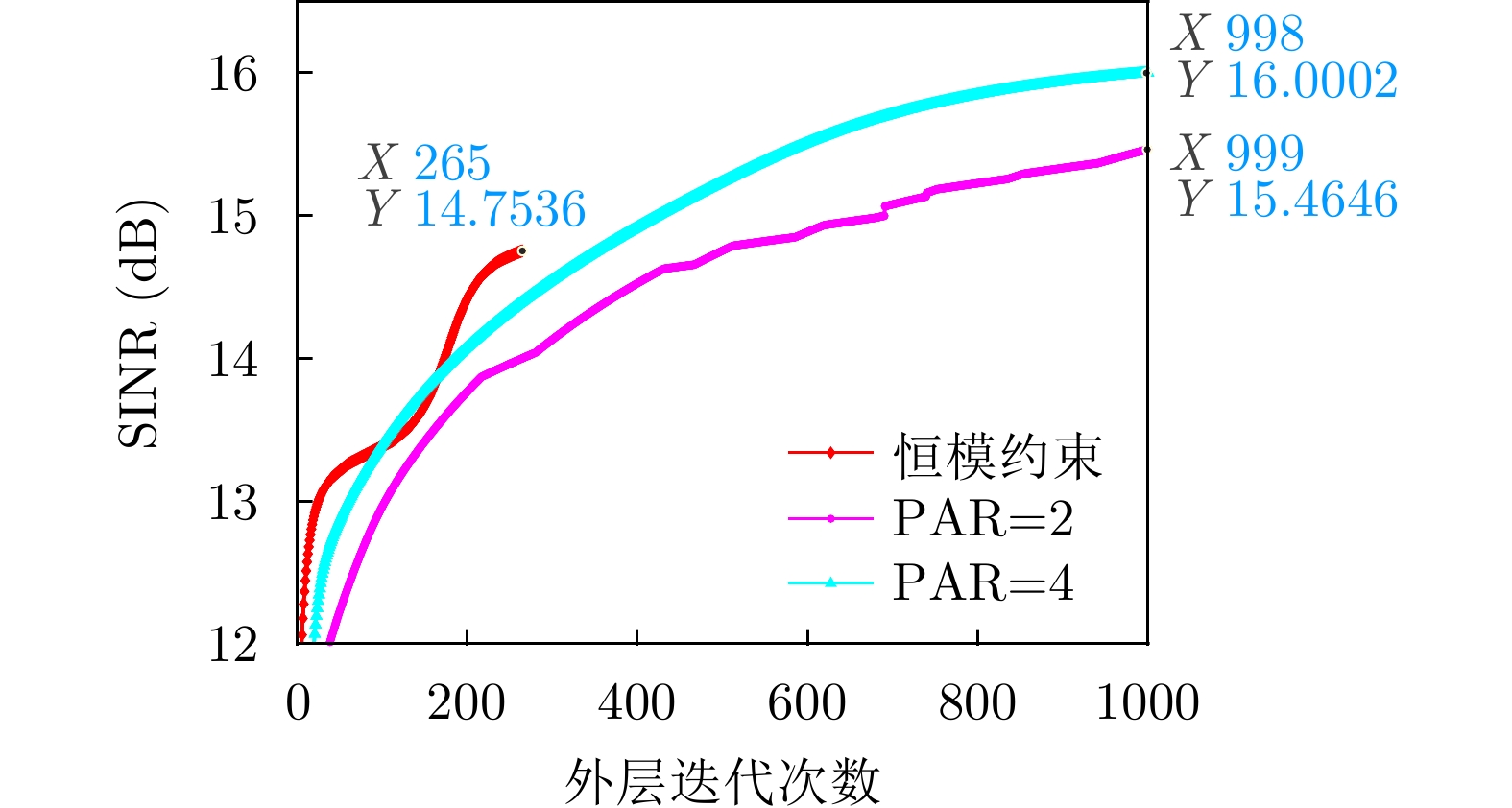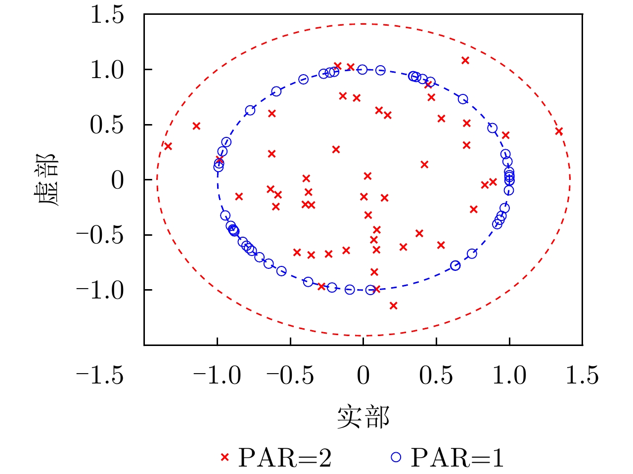 数$\lambda $,参数$\mu $。迭代终止条件${\varepsilon _1}$, ${\varepsilon _2}$2 while ${\text{error } } \ge {\varepsilon _1}$ do 3 式(13)、式(14)更新A, B 4 共轭梯度法在Stiefel流形空间求解U 5 条件式(29)更新$\mu $ 6 式(28)更新$\lambda $ 7 式(22)更新Q 8 求Q最大特征值$\gamma $,并更新${\boldsymbol{\hat Q}}$ 9 while ${\text{error } } \ge {\varepsilon _2}$ do 10 式(26)进行类幂内层迭代 11 end while 12 式(11)计算接收滤波器h 13 end while 14 return ${\boldsymbol{x}},{\boldsymbol{h}}$ 2 低PAR约束下最近邻向量问题求解方法