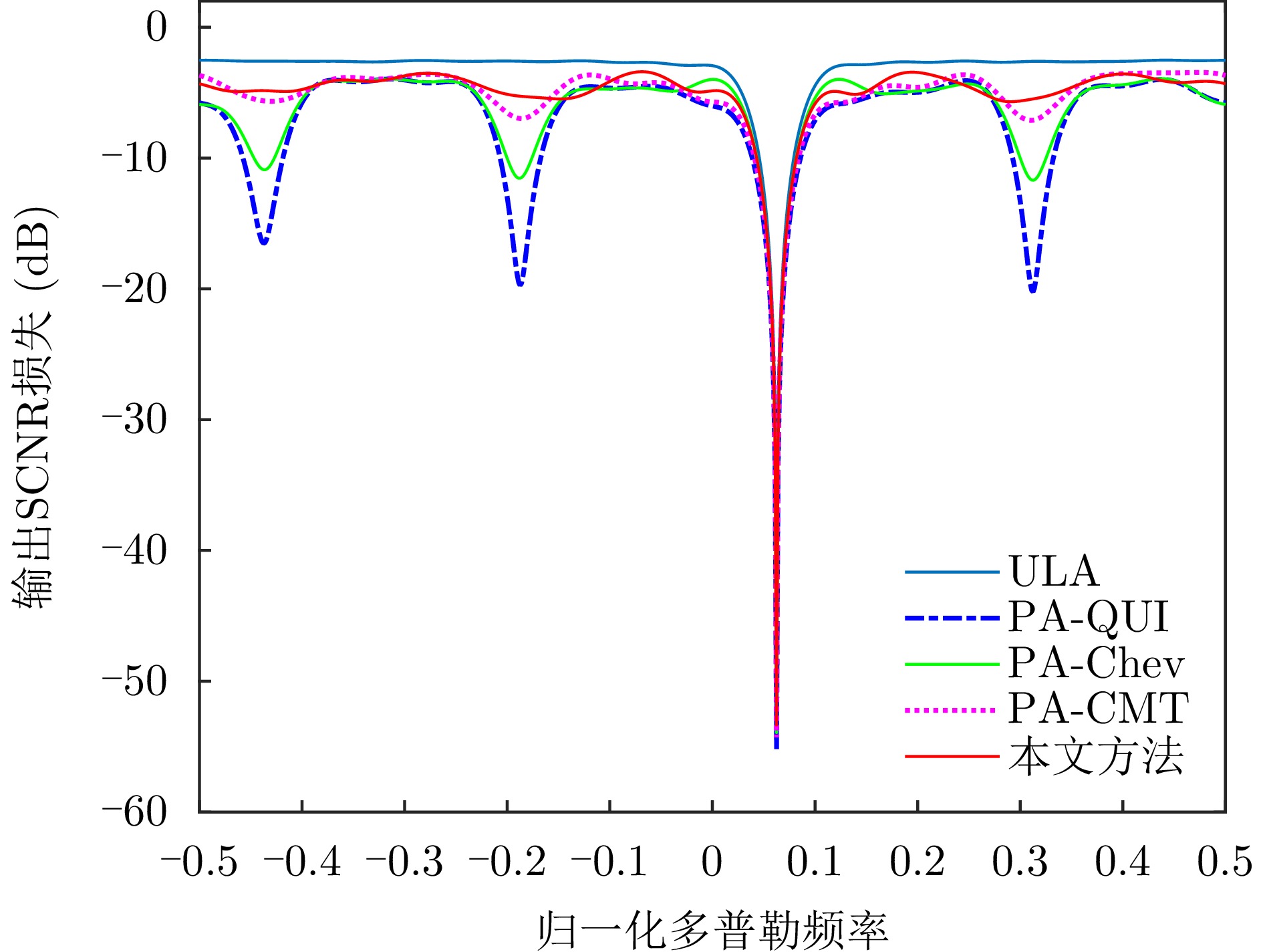 参数 数值 参数 数值 阵元总数 52 子阵数 10 子阵内阵元数 16 重叠阵元数 12 脉冲数 16 工作载频 1.2 GHz 波长 0.25 m 脉冲重频 2 kHz 信号带宽 5 MHz 平台高度 10 km 平台速度 125 m/s 目标方位角 82.79° 目标俯仰角 4.99° 目标斜距 115 km 空间频率展宽 0.1 多普勒滤波器带宽 0.06 幅度误差 0.03 相位误差 3° 信噪比 –5 dB 杂噪比 50 dB -