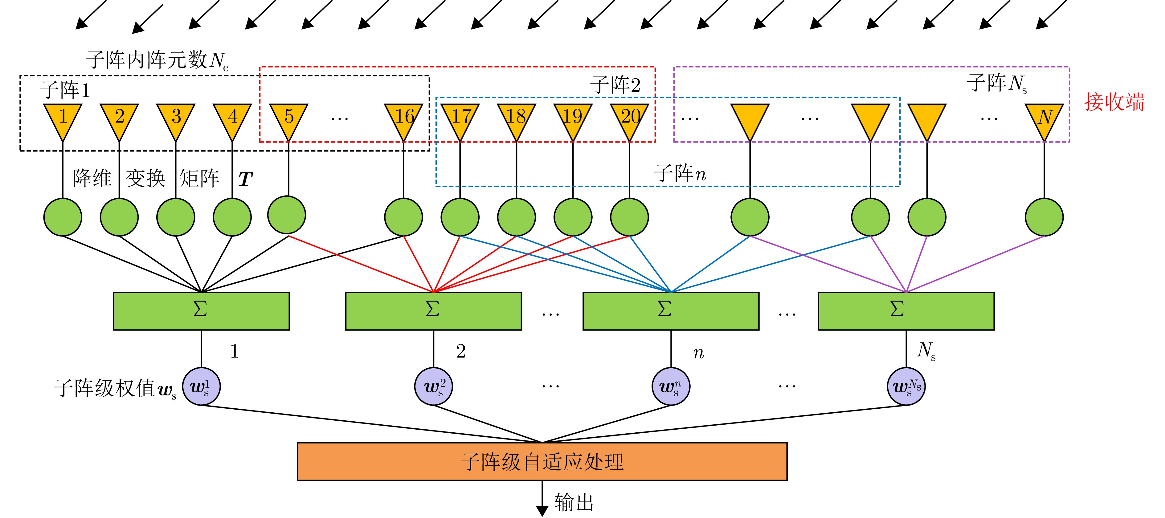 摘要: 机载雷达接收端采用子阵处理时面临栅瓣杂波导致的复杂空时耦合分布,使主瓣波束方向存在多个由栅瓣杂波导致的检测性能凹口,目标检测性能恶化严重。针对此问题,该文首先分析了子阵处理中栅瓣杂波空时谱分布特性,并在此基础上提出了基于接收子阵波束设计的空时二维杂波抑制方法。该方法采用重叠子阵构型方案,通过子阵方向图设计形成在子阵间栅瓣区域处的宽凹口,实现对子阵间栅瓣区域杂波的预滤波。进一步构建子阵级空时处理器,由于栅瓣杂波已经在子阵内完成预滤波,避免了栅瓣杂波在空时二维平面上的耦合扩散,从而提高了杂波抑制和动目标检测性能。仿真结果表明,所提方法显著改善了栅瓣杂波区的输出信杂噪比损失性能。Abstract: Airborne radar receivers that utilize subarray processing face challenges owing to the complex space-time coupling distribution caused by grating-lobe clutter. This results in multiple performance notches in the main beam, which severely affects target detection performance. To address this issue, we analyze the characteristics of grating-lobe clutter distribution in subarray processing and propose an approach for space-time clutter suppression based on the design of a receiving subarray beam pattern. Our approach leverages an overlapping subarray scheme to form wide nulls in the regions between subarrays where grating-lobe clutter is prevalent through beam pattern design. This design facilitates grating-lobe clutter pre-filtering between subarrays. Furthermore, we develop a subarray-level space-time processor that avoids the grating-lobe clutter coupling diffusion in the space-time two-dimensional plane by performing clutter pre-filtering within each subarray. This strategy enhances clutter suppression and moving-target-detection capabilities. Simulation results verify that the proposed method can remarkably improve the output signal to clutter plus noise ratio loss performance in grating-lobe clutter regions.