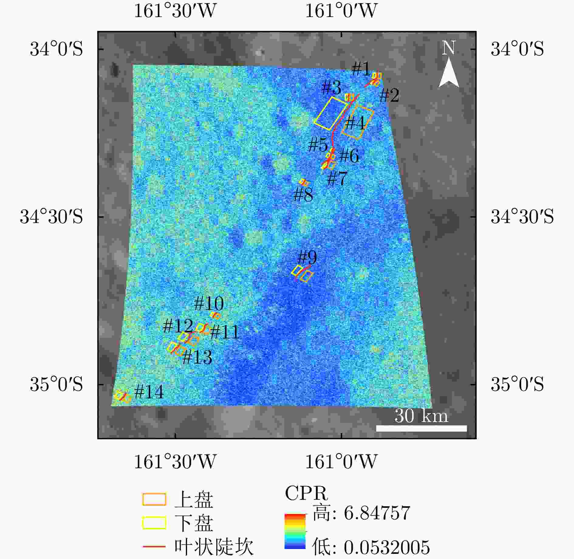 陡坎 ID S0均值 CPR均值 m均值 χ均值 1 0.069 0.479 0.355 26.561 2 0.074 0.490 0.436 40.267 3 0.081 0.451 0.526 41.073 4 0.090 0.546 0.448 39.420 5 0.089 0.427 0.549 37.492 6 0.069 0.480 0.467 37.789 7 0.074 0.541 0.451 37.452 8 0.060 0.612 0.449 36.708 9 0.191 0.389 0.557 38.395 10 0.058 0.867 0.413 33.714 11 0.060 0.718 0.400 30.893 12 0.071 0.656 0.439 33.451 13 0.073 0.637 0.394 28.003 14 0.094 0.879 0.386 17.771 均值 0.083 0.583 0.448 34.213 表 2 研究区域叶状陡坎上盘和下盘散射特性的统计结果