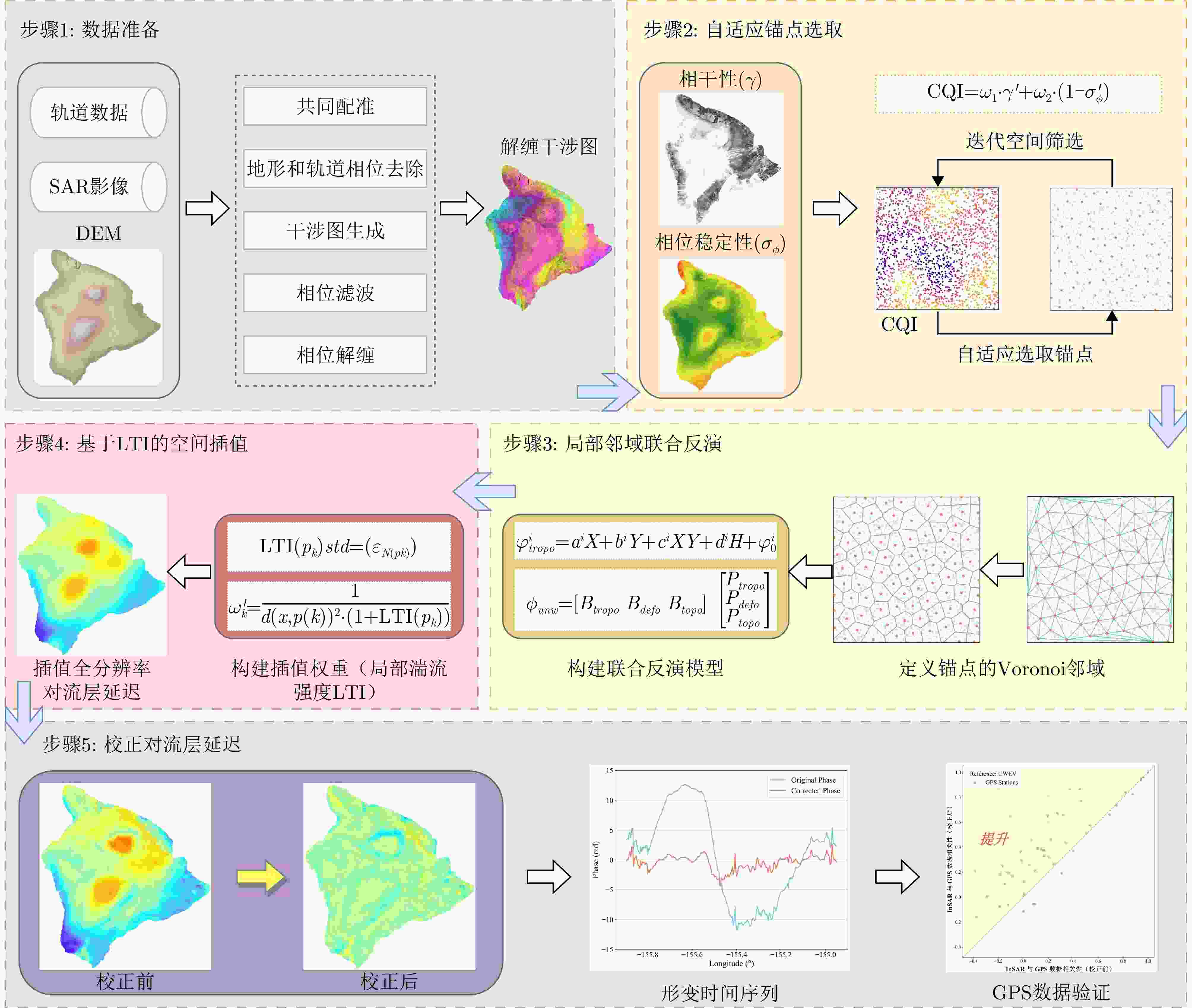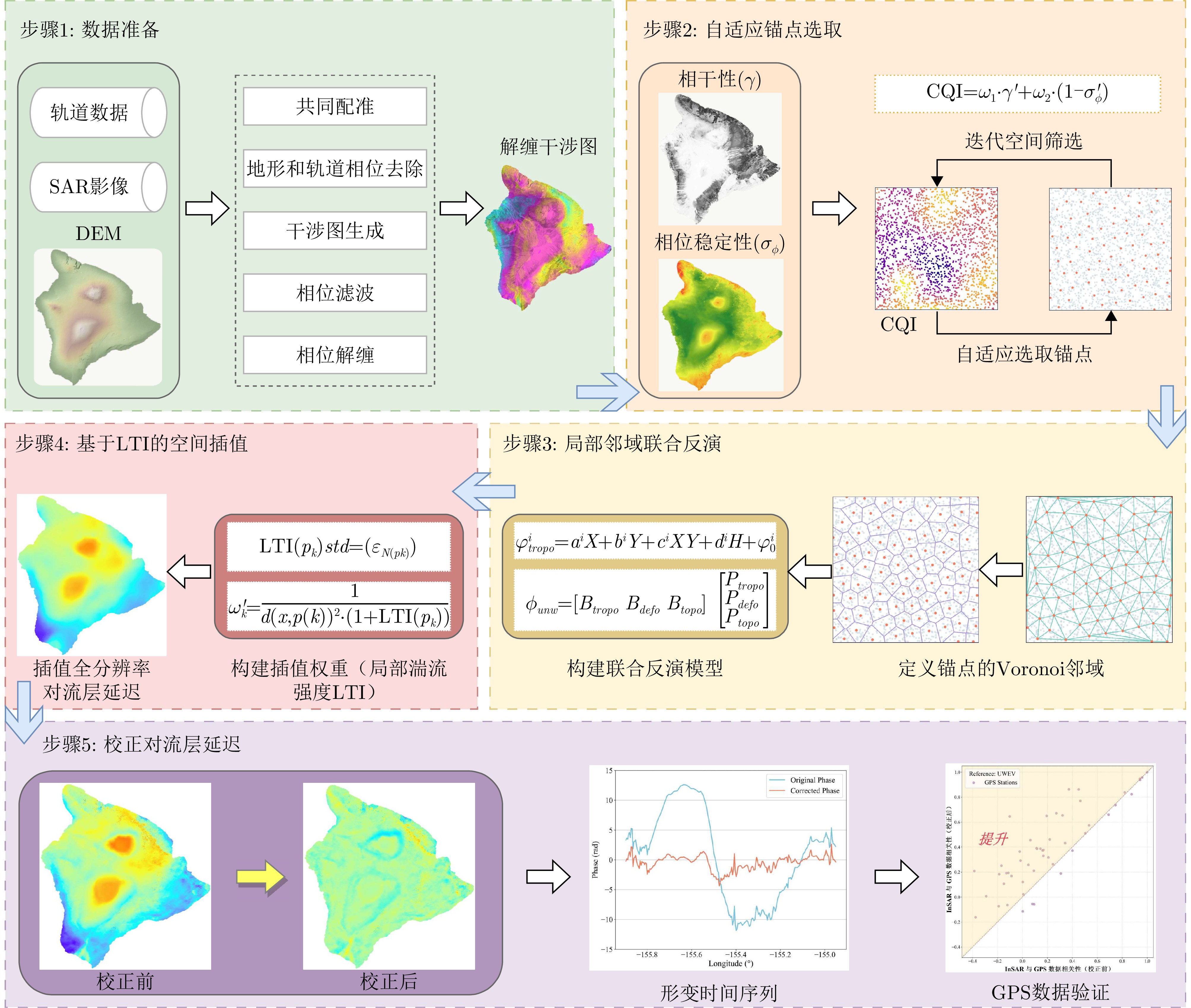 摘要: 对流层延迟是干涉合成孔径雷达(InSAR)的主要误差源之一,尤其在地形复杂或大气异质性强的区域,严重限制了其获取精确地表位移的能力。现有的校正方法或受限于外部数据的粗分辨率,或在对形变与高程关系建模以及处理复杂的湍流效应时能力不足。为此,该文提出了一种基于空间自适应锚点网络的对流层校正方法。该方法利用融合相位稳定性与时序相干性的综合质量指数(CQI),结合空间迭代筛选策略,构建锚点网络,实现数据质量驱动的空间采样。在每个锚点的邻域内,构建局部联合反演模型,在时空域上稳健地分离形变、地形残差和对流层延迟。此外,引入了局部湍流强度(LTI)因子,抑制插值过程中强湍流区域的误差传播。该团队使用夏威夷和青藏高原的Sentinel-1数据进行的验证表明,所提方法将干涉图相位标准差降低了73%以上,显著优于其他方法。校正后InSAR与GPS测量的时序位移之间的均方根误差(RMSE)从44.4 mm降低至9.3 mm,一致性提高了79%。该文所提方法能够有效且鲁棒地校正对流层延迟,提高InSAR测量精度,增强不同地形条件下形变监测的可靠性。