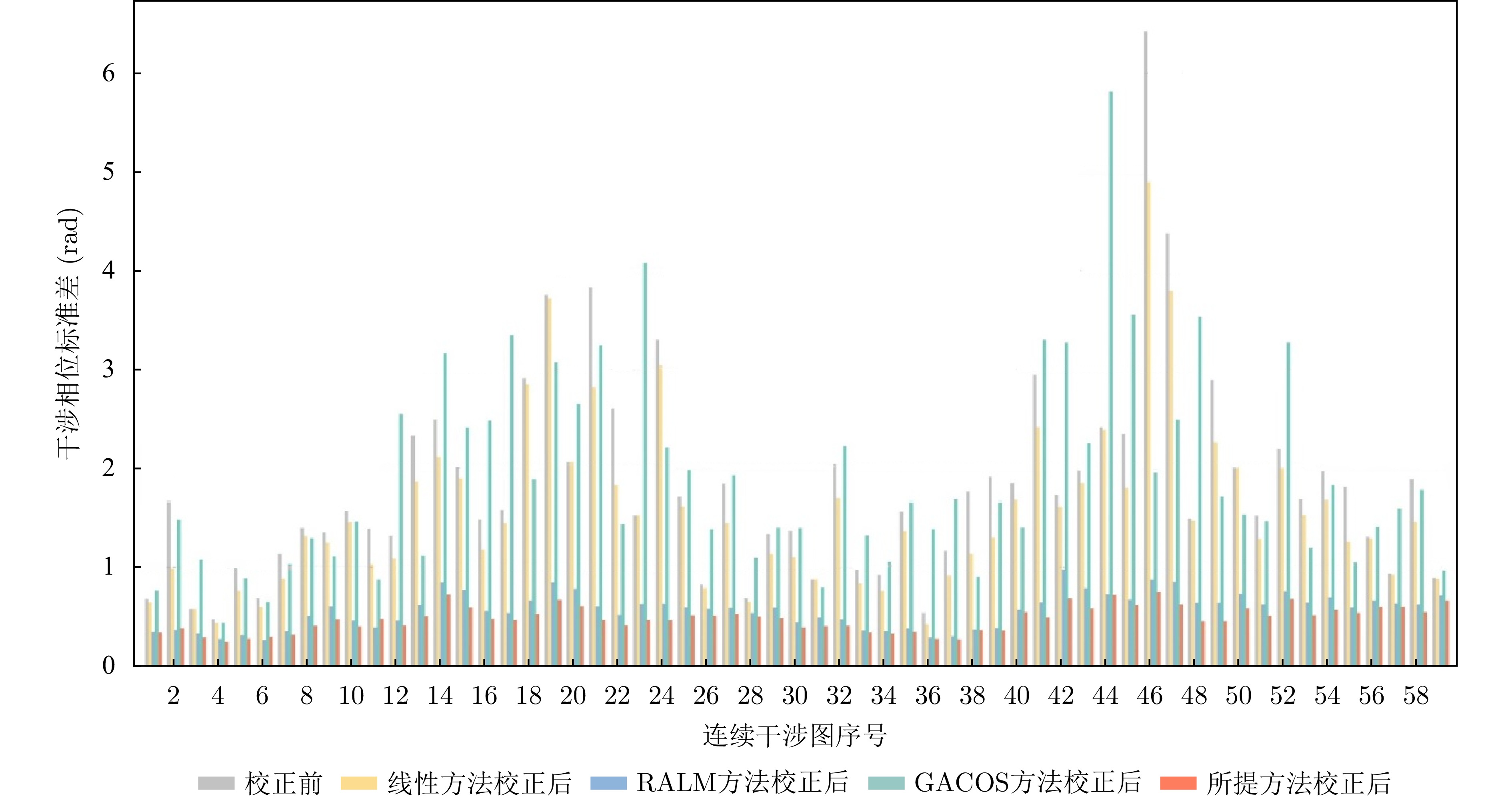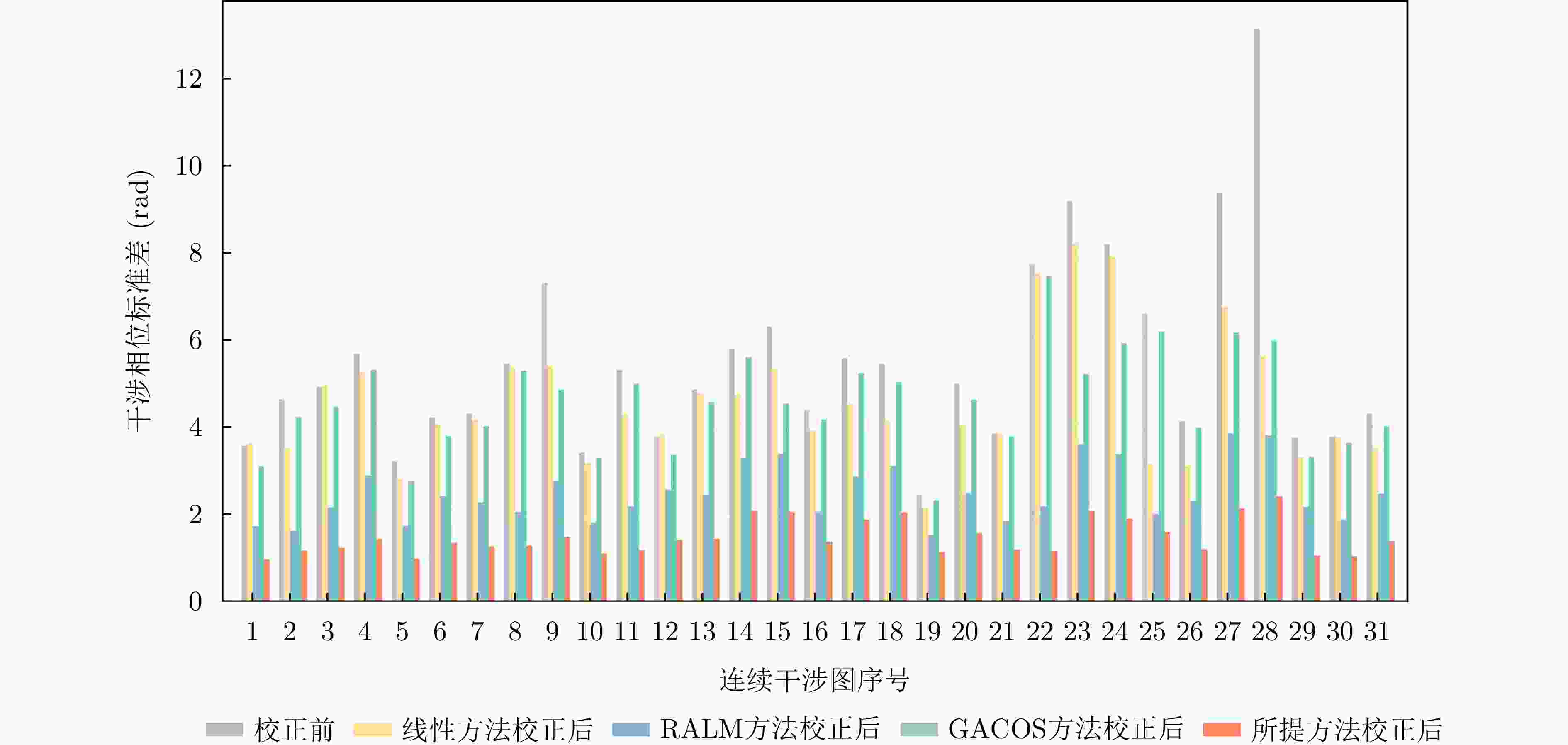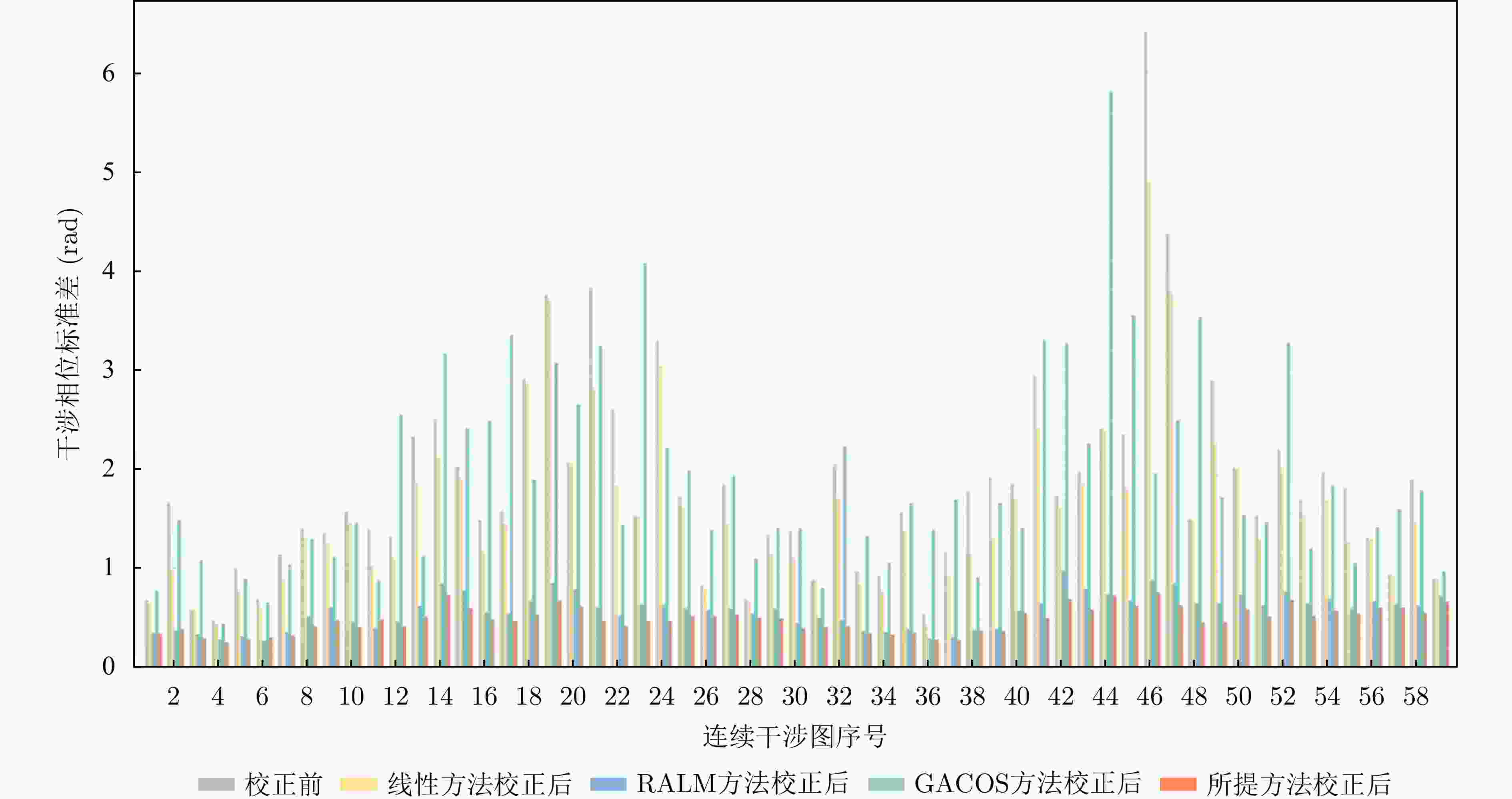 方法 相位标准差均值 (rad) 相位标准差中值 (rad) 相位标准差最小值 (rad) 相位标准差最大值 (rad) 相位标准差降低比例 未校正 1.82 1.66 0.47 6.43 N/A 线性 1.56 1.45 0.42 4.90 14.4% RALM 0.57 0.59 0.27 0.97 68.7% GACOS 1.90 1.60 0.44 5.82 -4.4% 所提方法 0.48 0.47 0.24 0.74 73.8% -