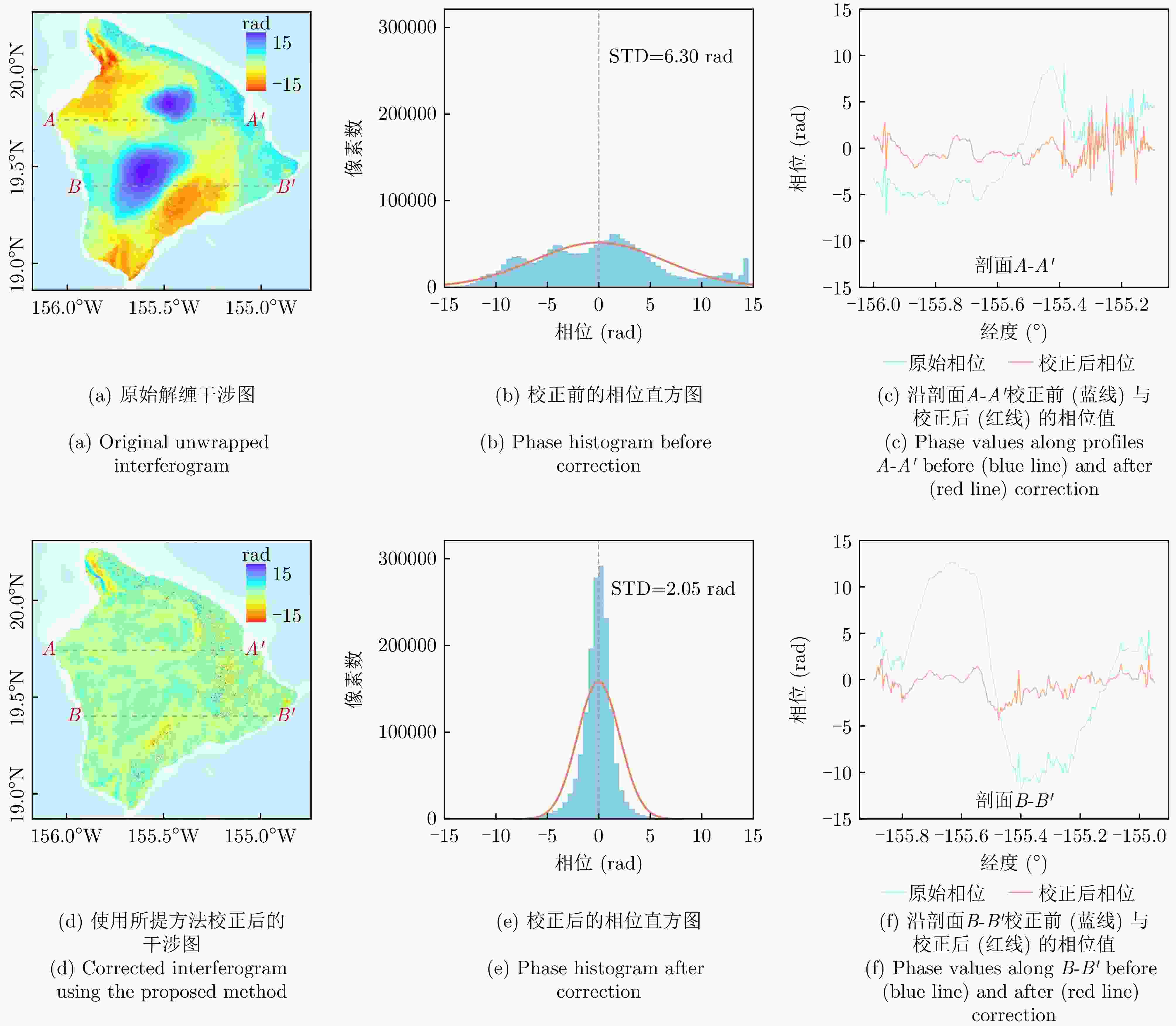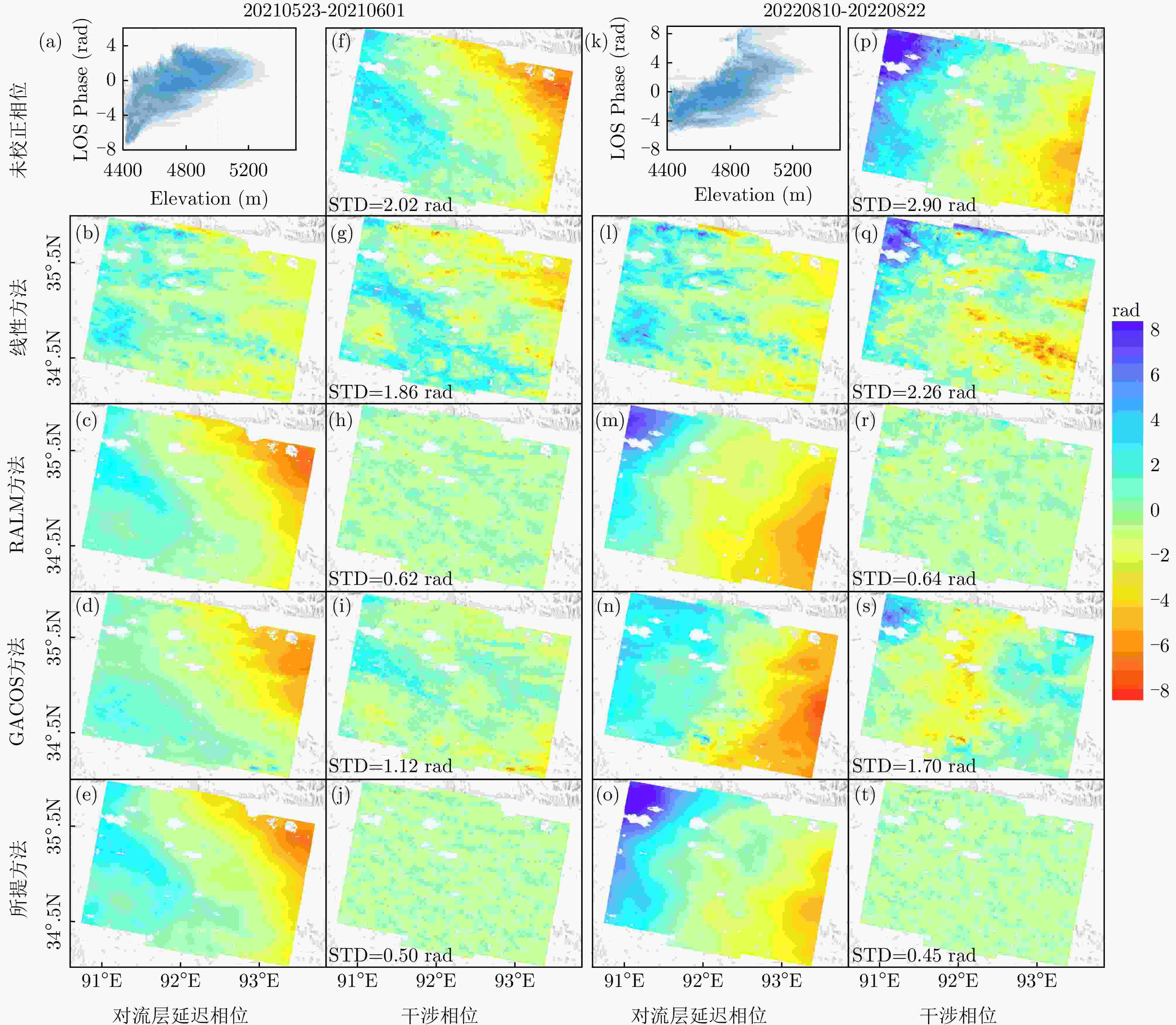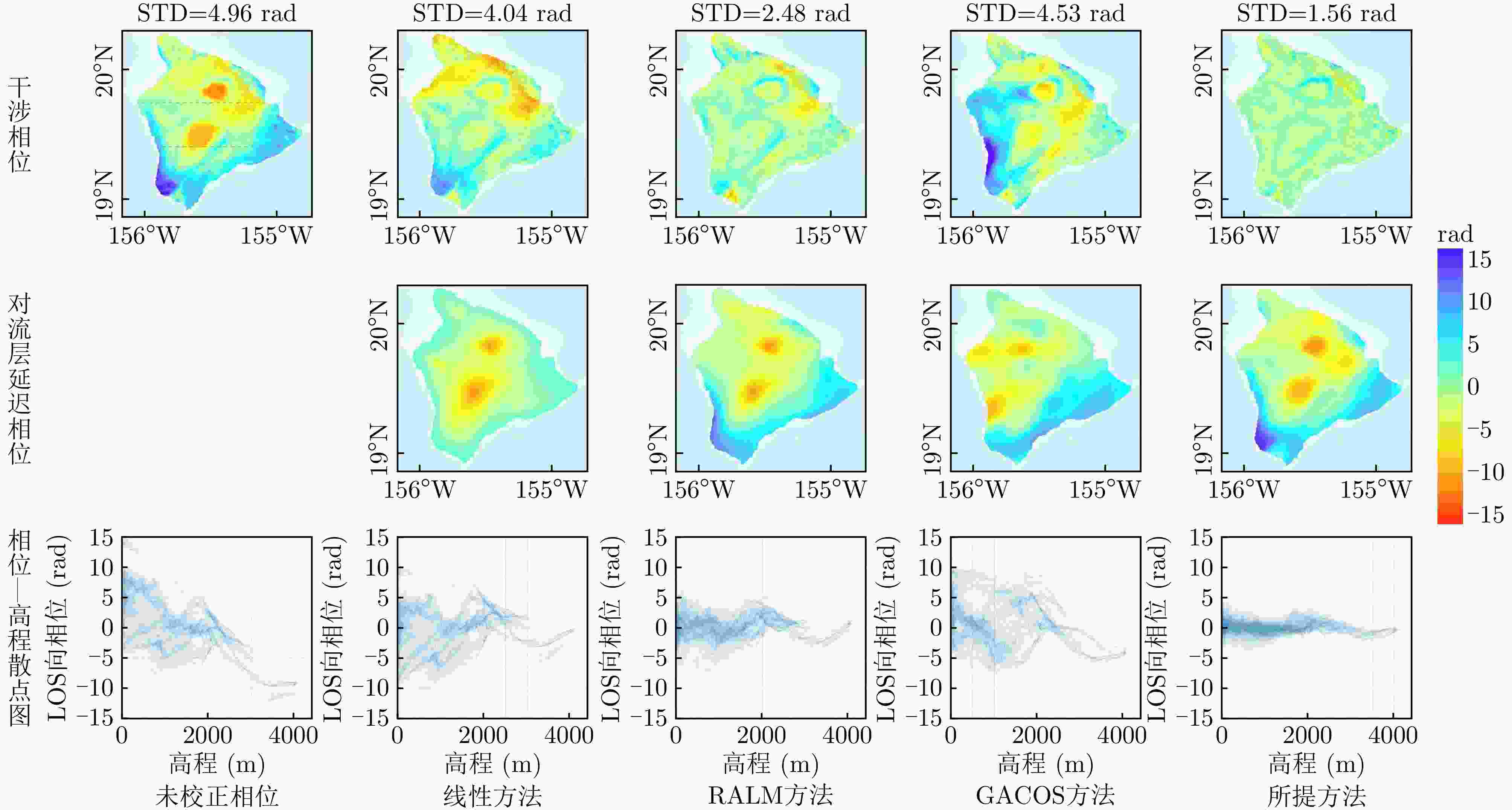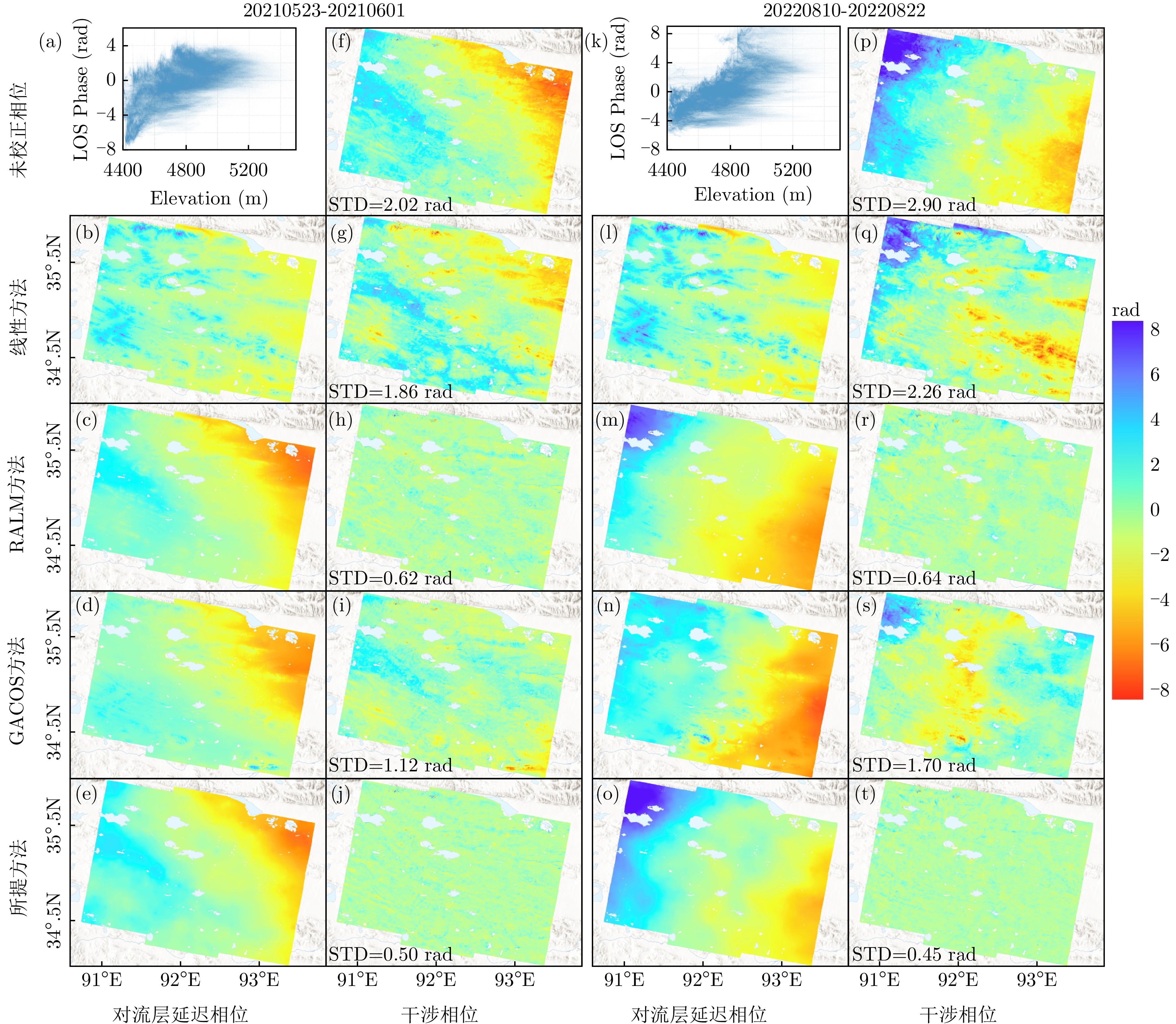 方法 相位标准差均值 (rad) 相位标准差中值 (rad) 相位标准差最小值 (rad) 相位标准差最大值 (rad) 相位标准差降低比例 未校正 1.82 1.66 0.47 6.43 N/A 线性 1.56 1.45 0.42 4.90 14.4% RALM 0.57 0.59 0.27 0.97 68.7% GACOS 1.90 1.60 0.44 5.82 -4.4% 所提方法 0.48 0.47 0.24 0.74 73.8% -