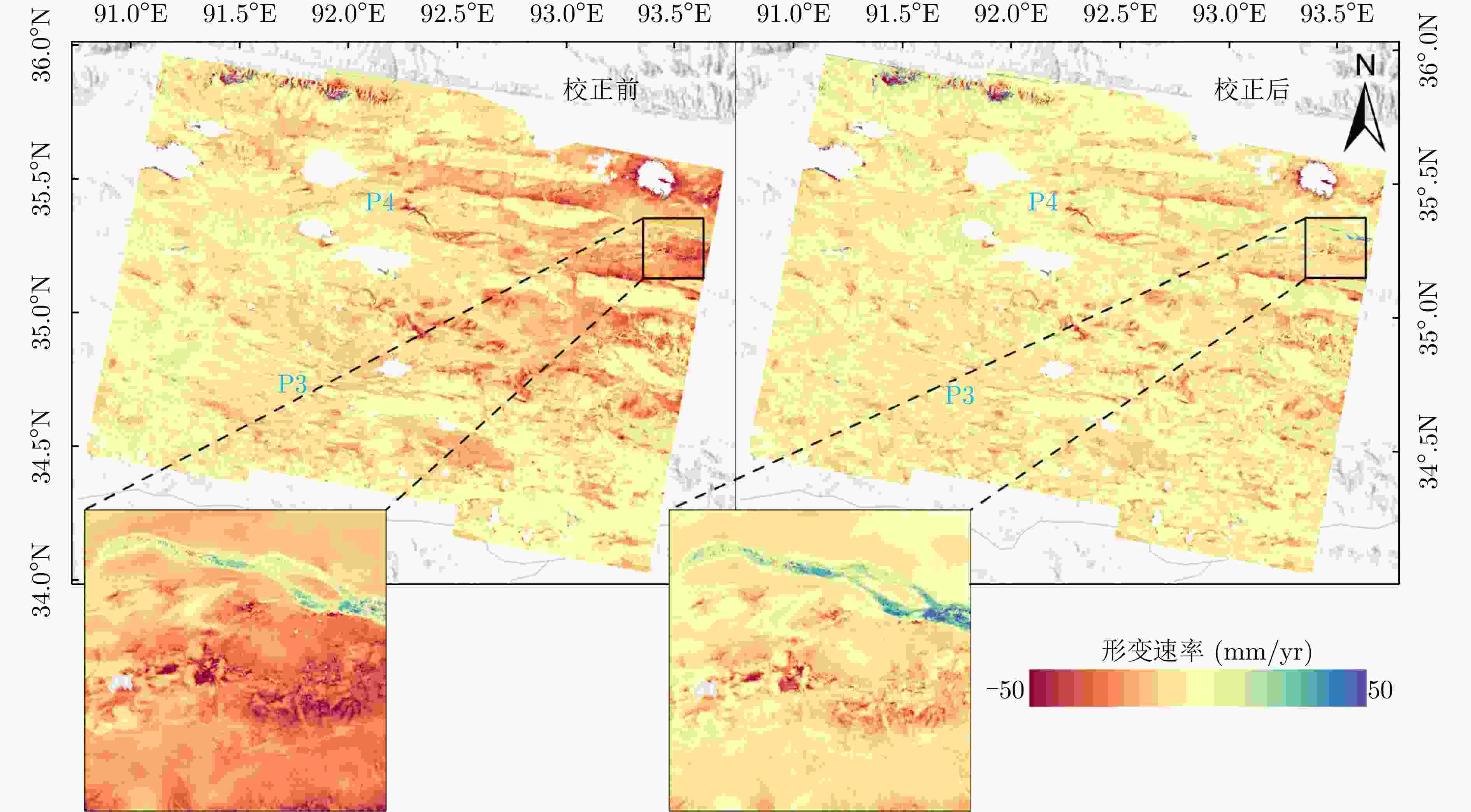 方法 相位标准差均值 (rad) 相位标准差中值 (rad) 相位标准差最小值 (rad) 相位标准差最大值 (rad) 相位标准差降低比例 未校正 5.47 4.93 2.44 13.13 N/A 线性 4.54 4.14 2.14 8.22 17.0% RALM 2.48 2.29 1.53 3.85 54.8% GACOS 4.43 4.23 2.19 7.23 18.8% 所提方法 1.46 1.37 0.96 2.41 73.2% 表 3 北麓河不同校正方法的相位标准差统计对比