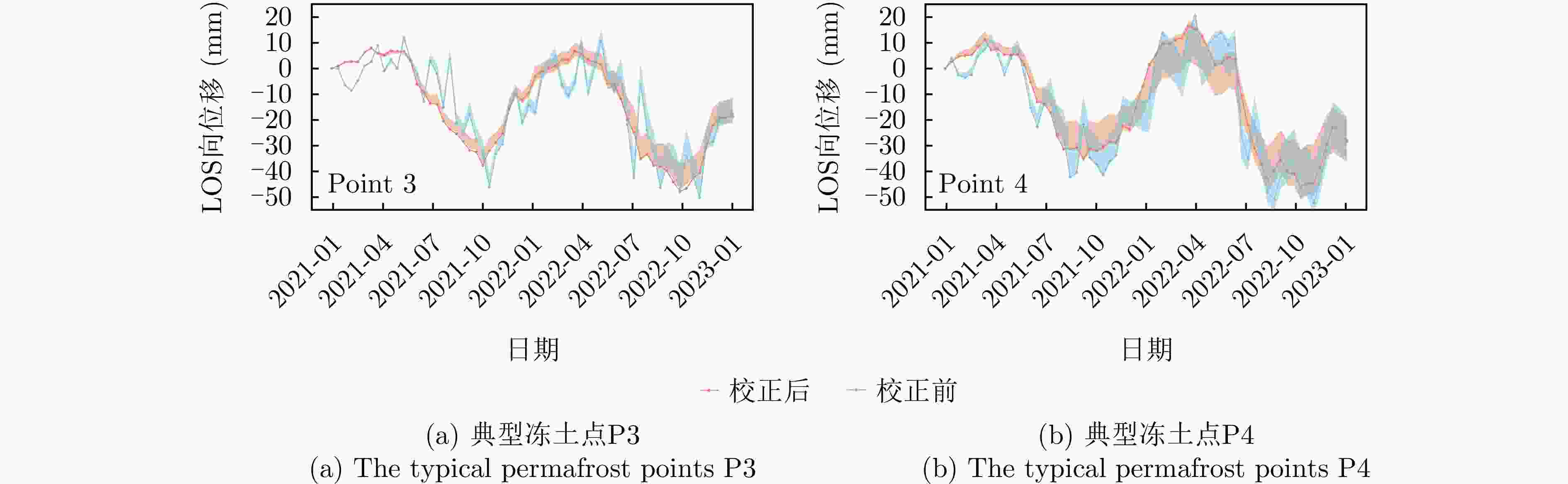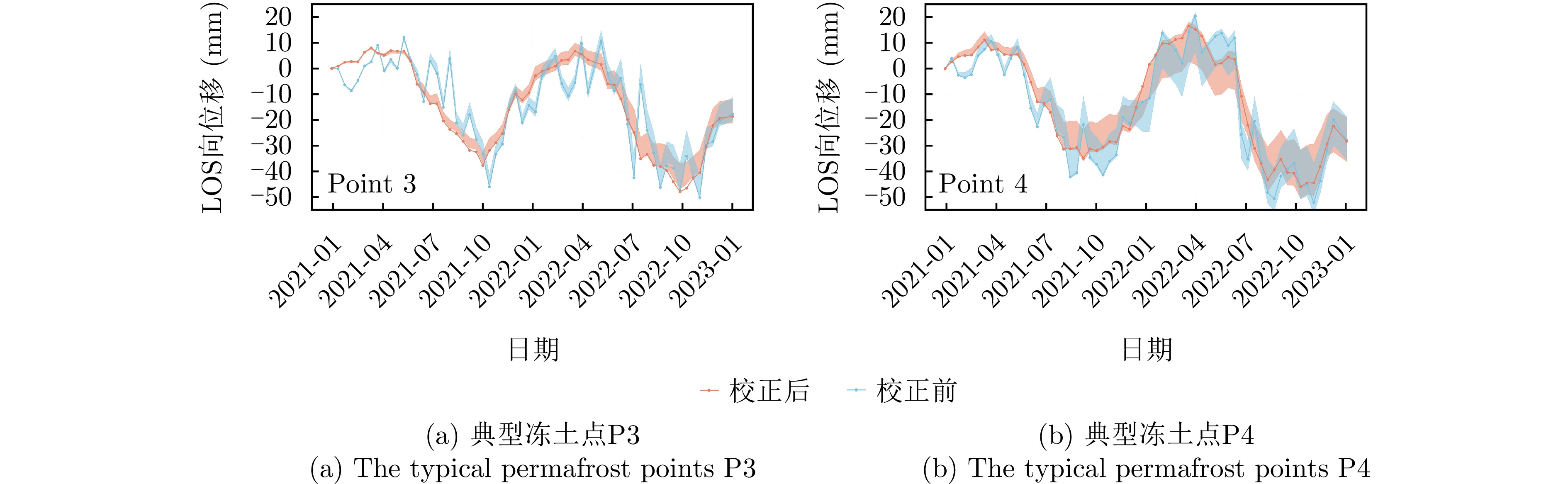 图 13 两个典型冻土点校正前 (蓝色阴影线) 与校正后 (红色实线) 的视线方向 (LOS) 形变时间序列对比。阴影区域表示该点周围 400 米半径范围内的标准差范围