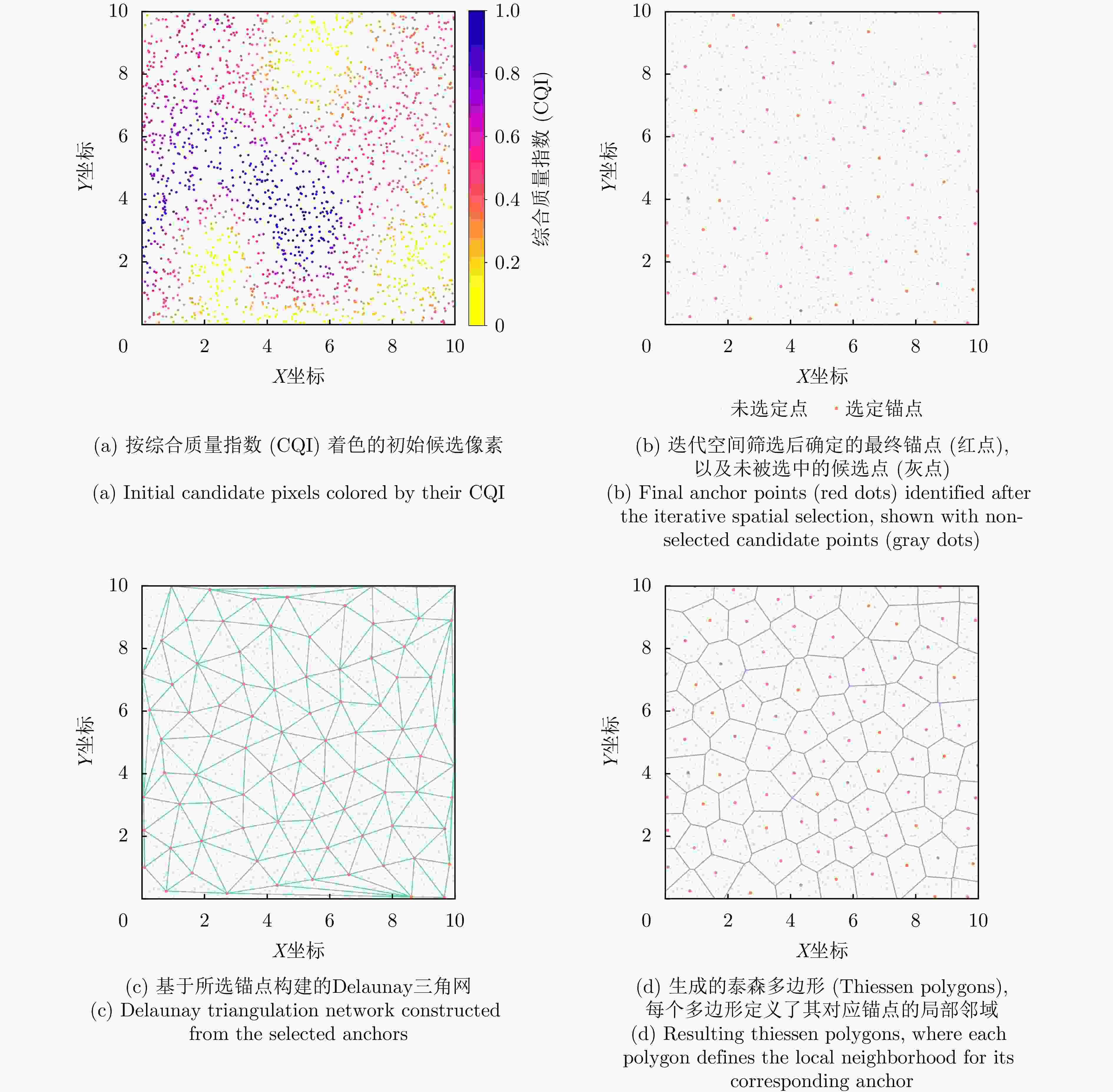 像素设为 False (未锁定)。3: 对于 候选像素集$ {S}_{C} $中的每个像素$ {p}_{i} $执行: 4: 获取像素$ {p}_{i} $的空间坐标$ ({r}_{i},{c}_{i}) $。 5: 如果$ {\text{Mask}}_{\text{locked}}({r}_{i},{c}_{i}) $的值为False,则: 6: 将像素$ {p}_{i} $加入最终锚点集合$ {S}_{A} $。 7: 以坐标$ ({r}_{i},{c}_{i}) $为圆心,$ {d}_{\min } $为半径,定义一个圆形排他