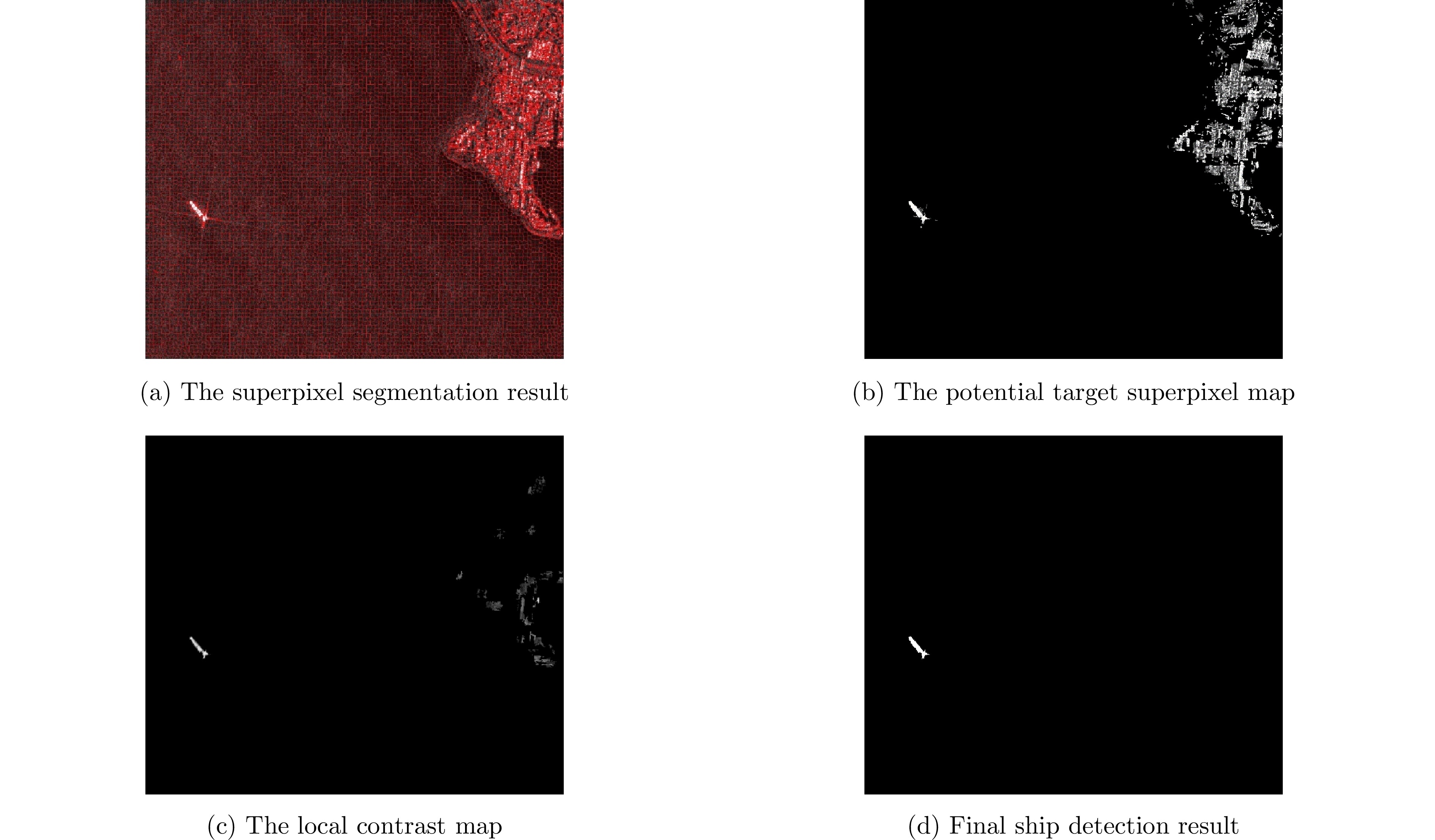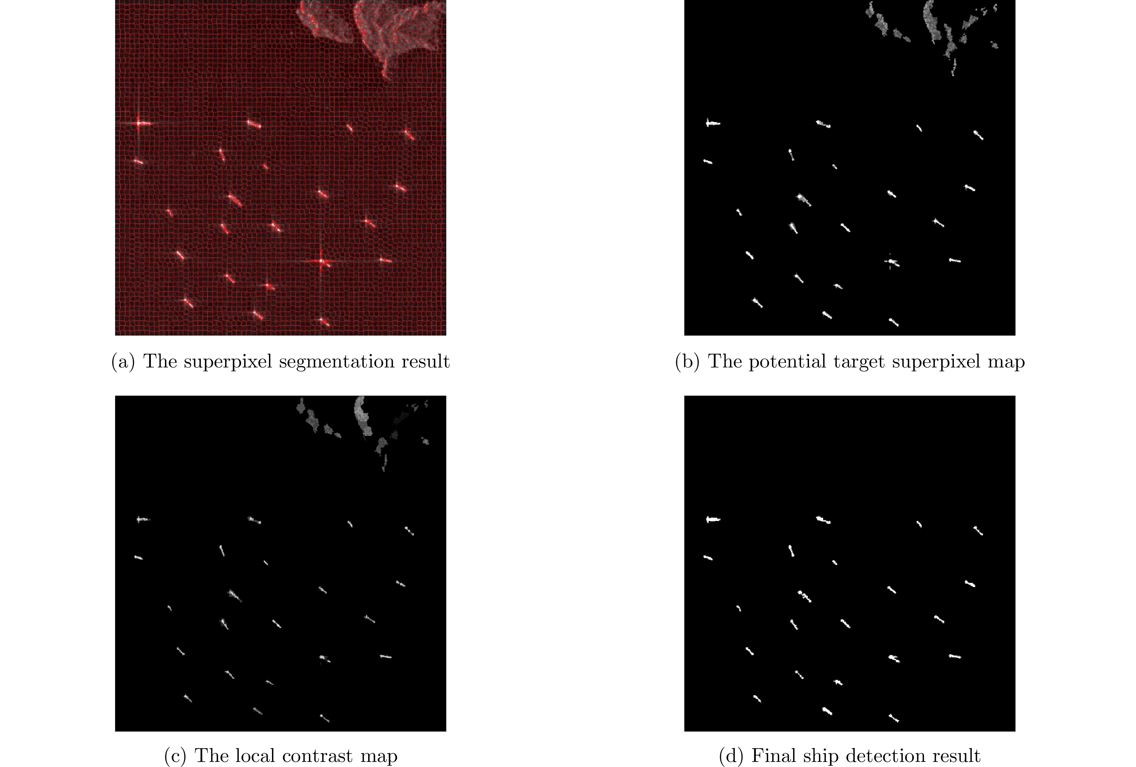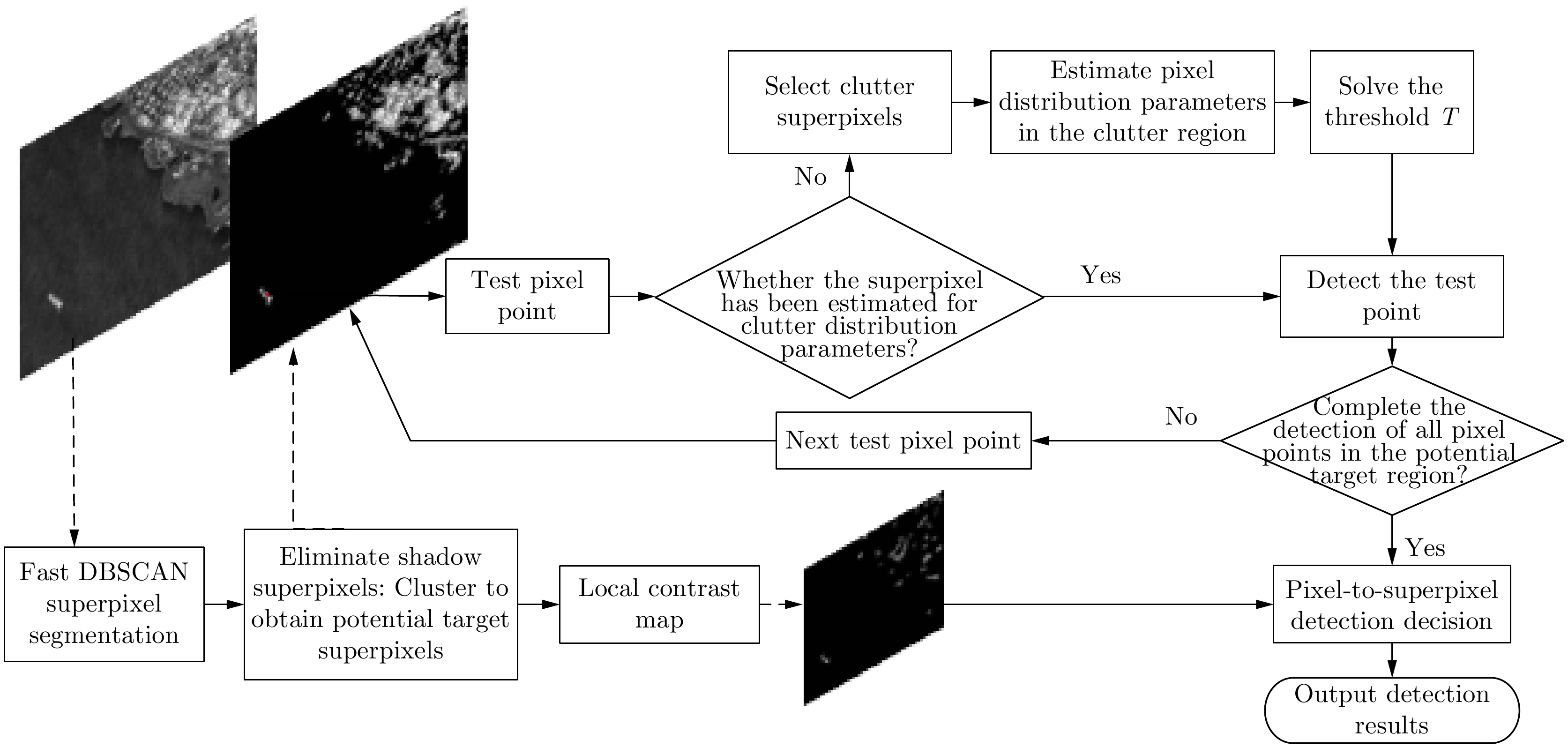 Synthetic Aperture Radar (SAR) image ship target detection has attracted considerable attention. As a state-of-the-art method, the Constant False Alarm Rate (CFAR) detection algorithm is often used in SAR image ship target detection. However, the detection performance of the classical CFAR is easily affected by speckle noise. Moreover, the detection results based on the sliding window are sensitive to the size of the sliding window. Thus, ensuring that there are no target pixels in the cluttered background is difficult, which easily leads to a high computational load. This study proposes a new ship target detection method for SAR images based on fast superpixel-based non-window CFAR to solve these problems. The superpixel generation method of Density Based Spatial Clustering of Applications with Noise is used to generate superpixels for SAR images. Under the assumption that SAR data obey the Rayleigh mixture distribution, we define a superpixel dissimilarity measure. Then, the clutter parameters of each pixel are accurately estimated using superpixels, which can avoid the shortcomings of the traditional CFAR sliding window even in the case of multiple targets. A local contrast based on the Coefficient of Variation (CoV) of the SAR image is proposed to optimize the CFAR detection result, which can eliminate a large number of false alarms from man-made targets in urban areas. The experimental results of five real SAR images show that the proposed method for ship target detection in SAR images with different scenes is robust compared with other state-of-the-art methods.