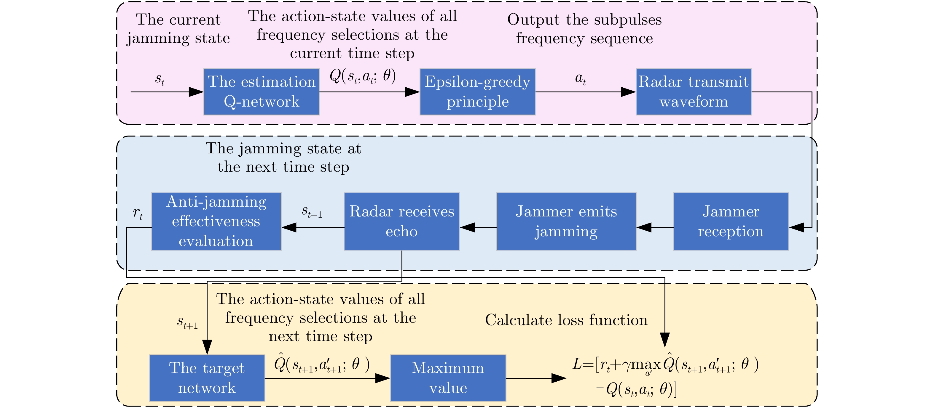 Dense false target jamming generates a large number of false targets around the real target, leading to dual jamming effects of deception and suppression. This severely affects the target detection ability of the radar. Therefore, this study proposes a range-Doppler two-dimensional jamming reconstruction algorithm based on the interpulse code agile waveform to suppress dense false target jamming. Based on the range-gating characteristics of the interpulse code agile waveform, the jamming and target echo reconstruction in the range-Doppler domain is realized by alternate inversion. Reconstruction jamming is eliminated by the iterative cancellation method. First, the jamming and target echo are processed by constructing receiving filter banks with different range intervals. Second, a joint mismatched filter bank is used to make the range sidelobe structure of each pulse filter output approximately the same. This reduces the divergence energy along the Doppler dimension after the pulse Doppler processing of the interpulse code agile waveform. The filter matrix is then constructed using the energy distribution characteristics of the jamming and target echo in different range-Doppler regions. Finally, accurate jamming and target echo reconstruction are achieved by alternate inversion to suppress dense false target jamming. Simulation results demonstrate the superior performance of the proposed algorithm in terms of jamming suppression and running time compared with traditional algorithms. These procedures significantly improve the target detection capability of the radar in strong jamming scenarios.