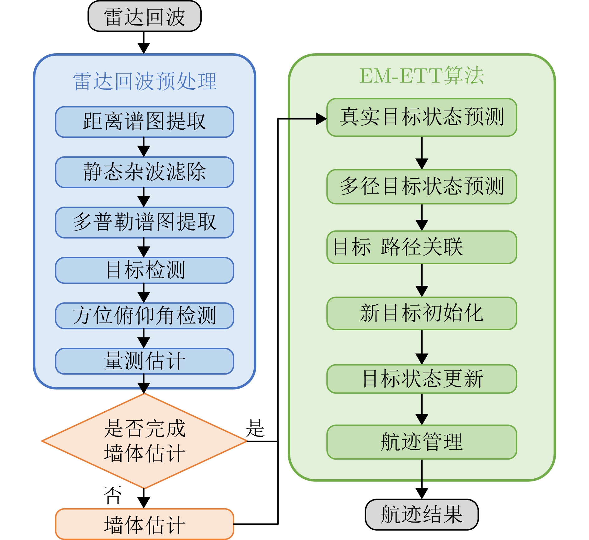 With the widespread use of millimeter-wave radar technology in indoor target detection and tracking, multipath effects have become a key factor affecting tracking accuracy. Indoor millimeter-wave radar target tracking is highly susceptible to multipath interference, and conventional point-target tracking methods, which ignore the extended characteristics of targets and the multipath propagation mechanism, struggle to effectively suppress ghost targets caused by multipath reflections. To address this issue, this paper proposes an extension mapping-based extended target tracking (EM-ETT) method for indoor target tracking using millimeter-wave radar. First, a random matrix model is used to characterize the target’s geometric shape, with the extension modeled as an inverse Wishart distribution. Next, an extended projection framework is constructed by integrating a Monte Carlo-based statistical propagation mechanism. Through nonlinear multipath mapping of scattering points from the true target, ghost point clouds are generated, and their extended state priors are estimated. Furthermore, a target–path association method is introduced to establish path associations in multipath propagation based on geometric consistency and likelihood evaluation, enhancing state discrimination capability. Experimental results demonstrate that in multitarget scenarios with multipath interference, the proposed method significantly improves state estimation accuracy and effectively prevents the generation of false trajectories. Compared with conventional point-target tracking algorithms, the proposed method exhibits significant advantages in both tracking accuracy and robustness.