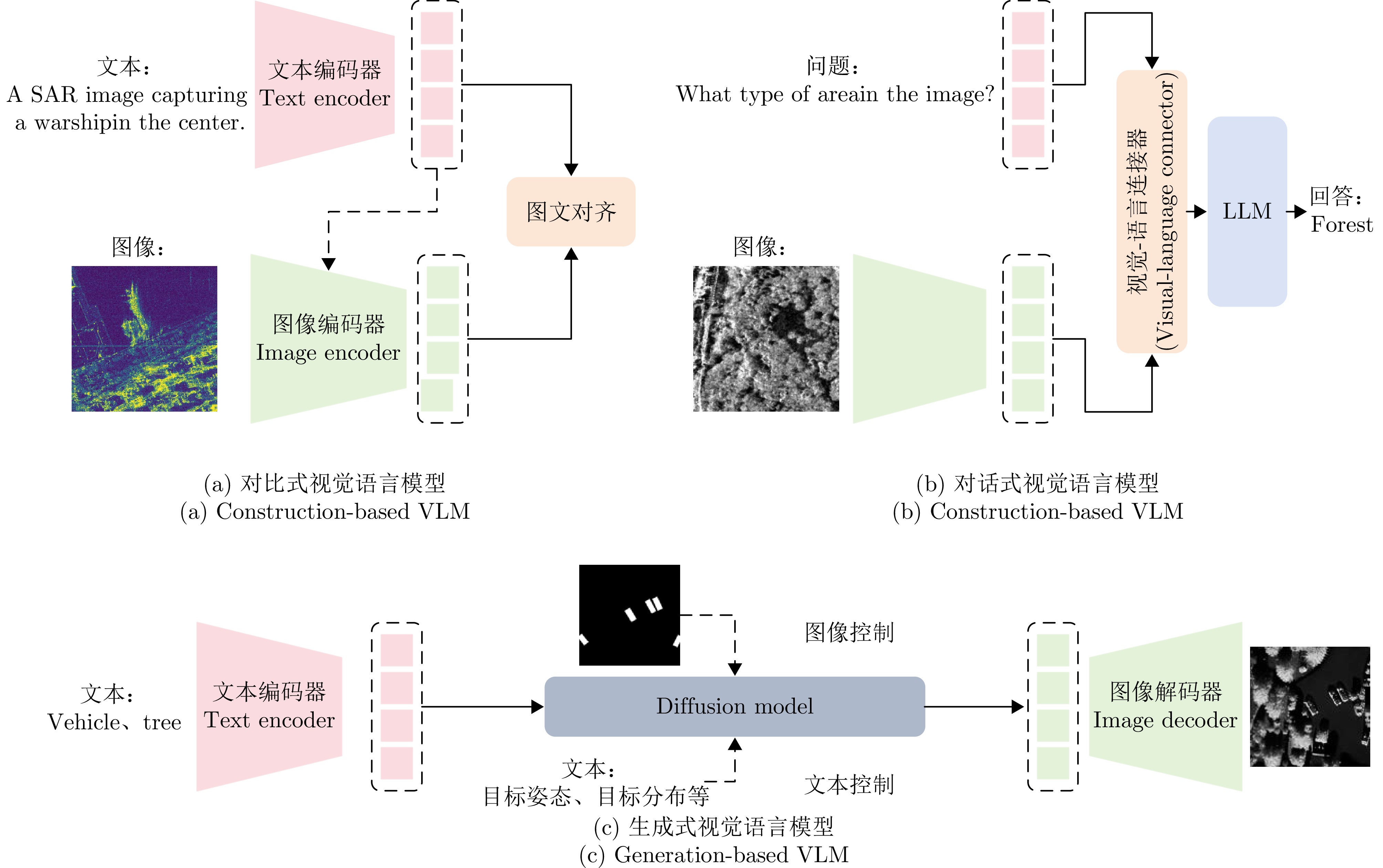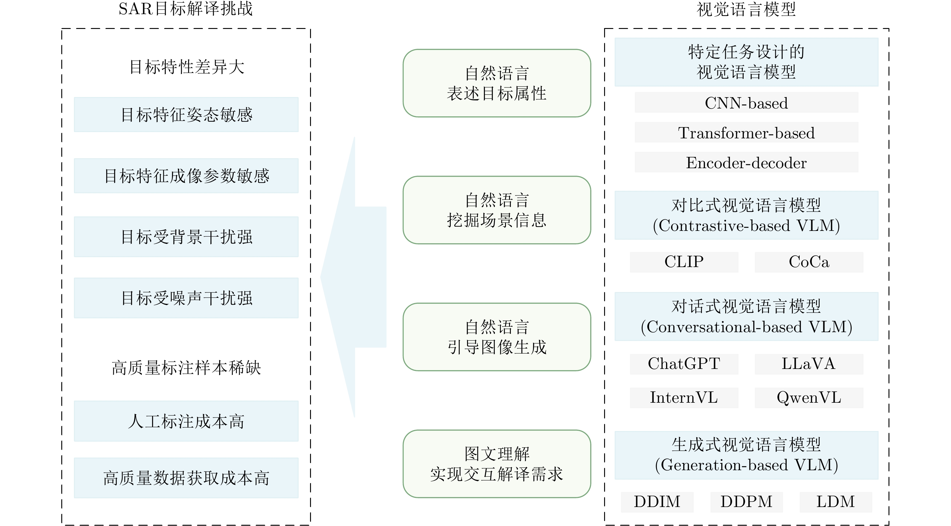 Synthetic Aperture Radar (SAR) is widely used in military and civilian applications, with intelligent target interpretation of SAR images being a crucial component of SAR applications. Vision-language Models (VLMs) play an important role in SAR target interpretation. By incorporating natural language understanding, VLMs effectively address the challenges posed by large intraclass variability in target characteristics and the scarcity of high-quality labeled samples, thereby advancing the field from purely visual interpretation toward semantic understanding of targets. Drawing upon our team’s extensive research experience in SAR target interpretation theory, algorithms, and applications, this paper provides a comprehensive review of intelligent SAR target interpretation based on VLMs. We provide an in-depth analysis of existing challenges and tasks, summarize the current state of research, and compile available open-source datasets. Furthermore, we systematically outline the evolution, ranging from task-specific VLMs to contrastive-, conversational-, and generative-based VLMs and foundational models. Finally, we discuss the latest challenges and future outlooks in SAR target interpretation by VLMs.
