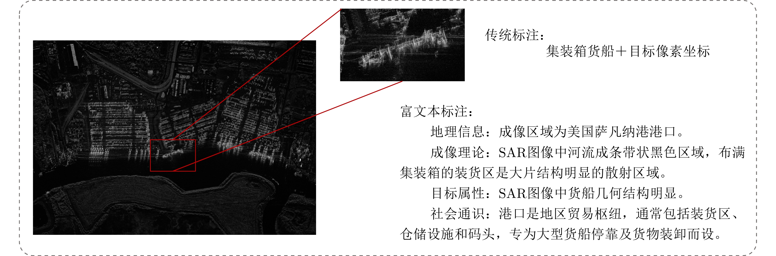 Synthetic Aperture Radar (SAR), as an active microwave remote sensing system, offers all-weather, all-day observation capabilities and has considerable application value in disaster monitoring, urban management, and military reconnaissance. Although deep learning techniques have achieved remarkable progress in interpreting SAR images, existing methods for target recognition and detection primarily focus on local feature extraction and single-target discrimination. They struggle to comprehensively characterize the global semantic structure and multitarget relationships in complex scenes, and the interpretation process remains highly dependent on human expertise with limited automation. SAR image captioning aims to translate visual information into natural language, serving as a key technology to bridge the gap between “perceiving targets” and “cognizing scenes,” which is of great importance for enhancing the automation and intelligence of SAR image interpretation. However, the inherent speckle noise, the scarcity of textural details, and the substantial semantic gap in SAR images further exacerbate the difficulty of cross-modal understanding. To address these challenges, this paper proposes a spatial-frequency aware model for SAR image captioning. First, a spatial-frequency aware module is constructed. It employs a Discrete Cosine Transform (DCT) mask attention mechanism to reweight spectral components for noise suppression and structure enhancement, combined with a Gabor multiscale texture enhancement submodule to improve sensitivity to directional and edge details. Second, a cross-modal semantic enhancement loss function is designed to bridge the semantic gap between visual features and natural language through bidirectional image-text alignment and mutual information maximization. Furthermore, a large-scale fine-grained SAR image captioning dataset, FSAR-Cap, containing 72400 high-quality image-text pairs, is constructed. The experimental results demonstrate that the proposed method achieves CIDEr scores of 151.00 and 95.14 on the SARLANG and FSAR-Cap datasets, respectively. Qualitatively, the model effectively suppresses hallucinations and accurately captures fine-grained spatial-textural details, considerably outperforming mainstream methods.