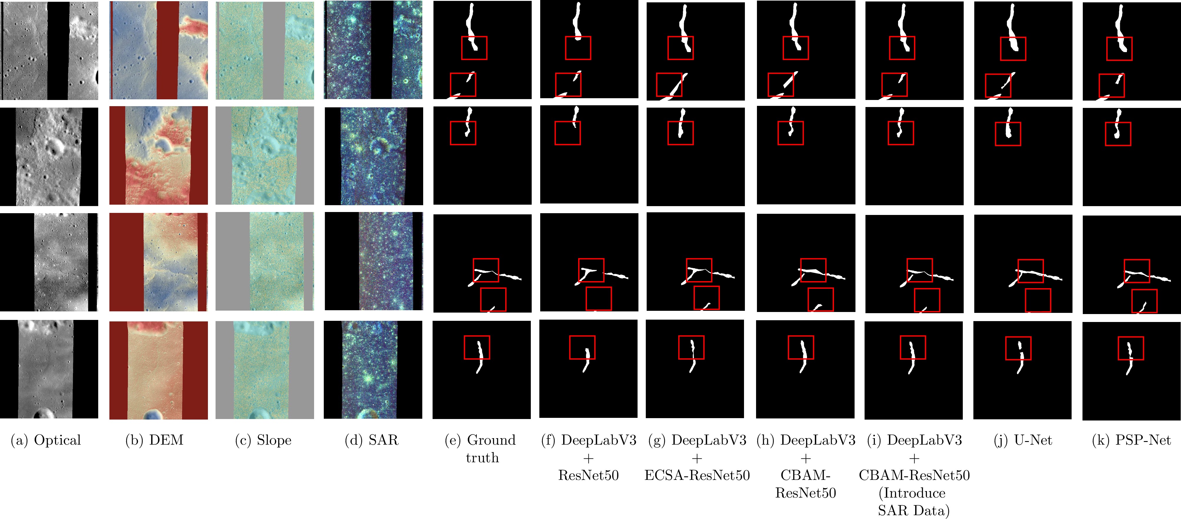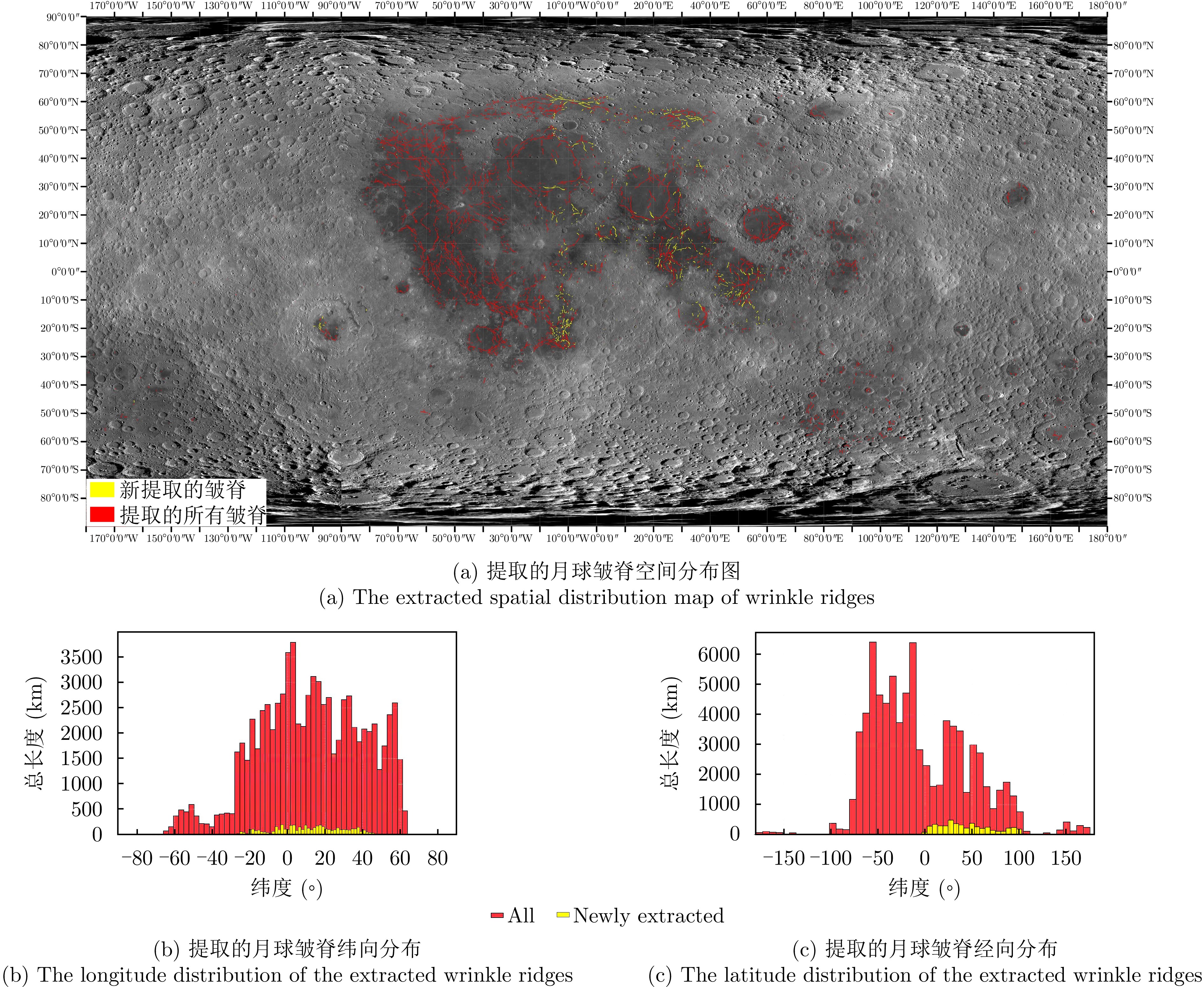 Lunar wrinkle ridges are important linear structures that are widely distributed in the mare regions on the lunar surface and are of great importance for studying the evolution of the lunar stress field and the history of volcanic activities. Traditional lunar wrinkle ridge recognition and cataloging mainly rely on manual interpretation, which is inefficient and subjective. In this paper, an automatic lunar wrinkle ridge extraction method based on multimodal semantic segmentation is proposed. By constructing a high-quality lunar wrinkle ridge remote sensing image annotation dataset and introducing synthetic aperture radar data, a DeepLabv3+-based multimodal semantic segmentation network (WR-Net) is constructed through iterative training. A dynamic fusion module and an attention mechanism were introduced into WR-Net, which effectively optimized the feature extraction and fusion process of multimodal images and markedly improved the robustness and accuracy of the model. On the multimodal lunar wrinkle ridge test set, WR-Net achieved excellent performance (Precision = 95.516%, Recall = 89.963%, F1-Score = 92.657%, and MIoU = 92.944%). Furthermore, we used WR-Net to automatically identify and extract the lunar wrinkle ridges from the 70° south latitude to the 70° north latitude of the moon and cataloged and statistically analyzed the results. The proposed method is suitable for the recognition of lunar wrinkle ridges and provides an effective paradigm for the automatic extraction of similar linear structures on the moon and other planetary bodies.